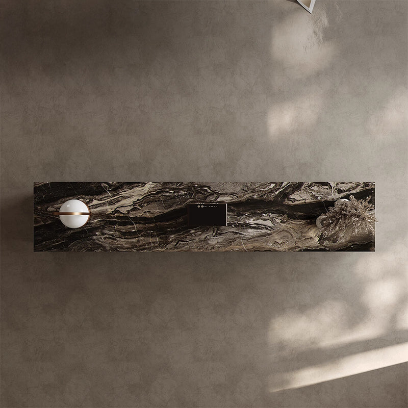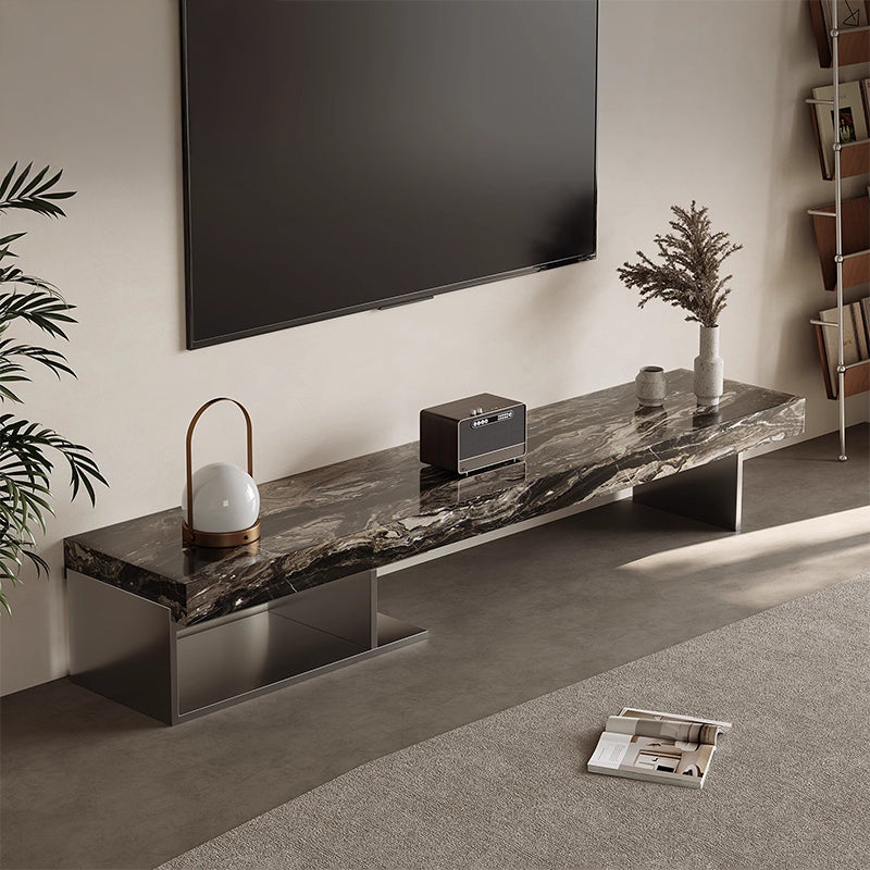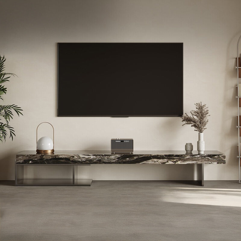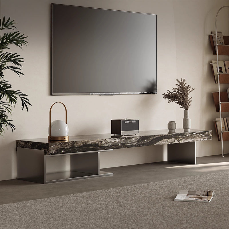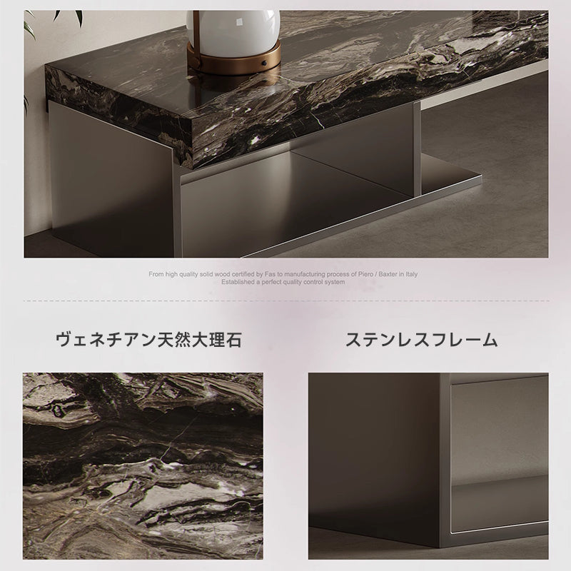 大理石モダンテレビボードは、リビングルームに洗練されたモダンな雰囲気を演出します。ヴェネチアン天然大理石を使用した天板は、耐熱性、耐傷性、耐摩耗性に優れ、長期間使用してもその美しさを保ちます。ステンレスフレームのユニークなフォルムがスタイリッシュさを際立たせ、幅220cm、奥行45cm、高さ33cmの大容量設計で様々なサイズのテレビに対応。インテリアにこだわる方に最適な一品です。