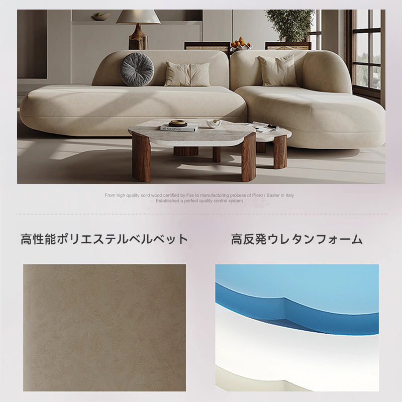 イタリアンベルベットタッチソファは、モダンでエレガントなデザインが特徴です。高性能ポリエステルベルベット素材を使用し、耐久性と快適性を兼ね備えています。高反発ウレタンフォームを採用し、人間工学に基づいた設計で快適な座り心地を提供します。ヨーロッパ産ブナ材フレームがしっかりとした支えを提供し、リビングルームにぴったりの広々としたデザインです。