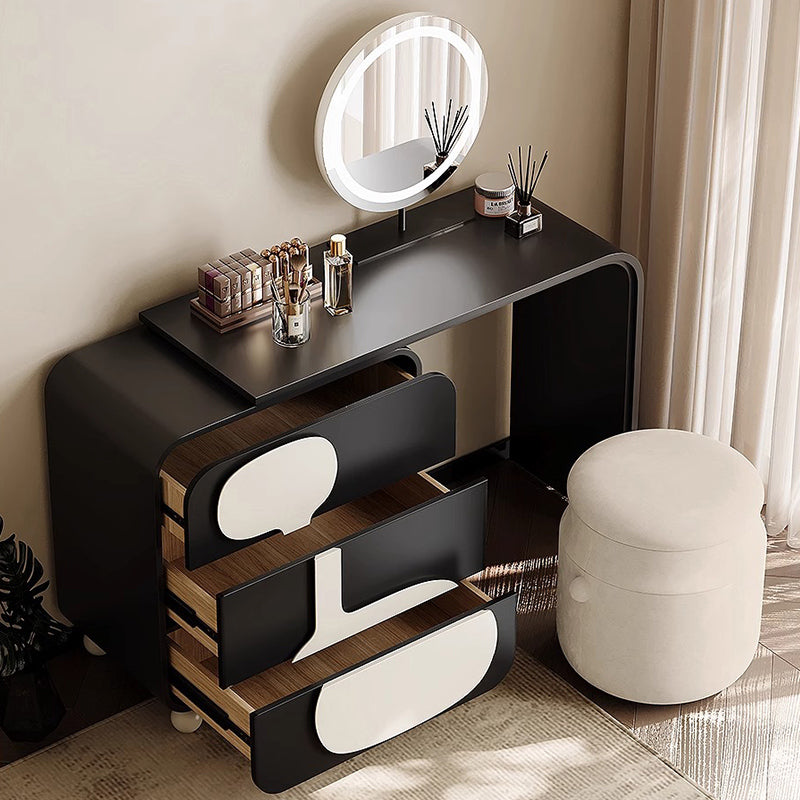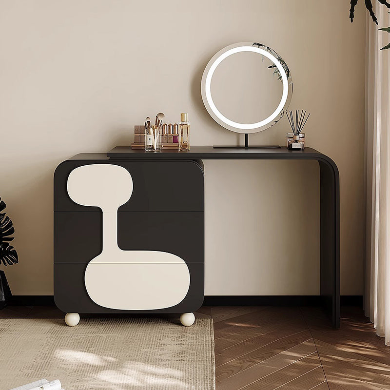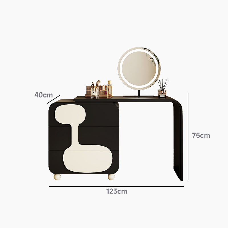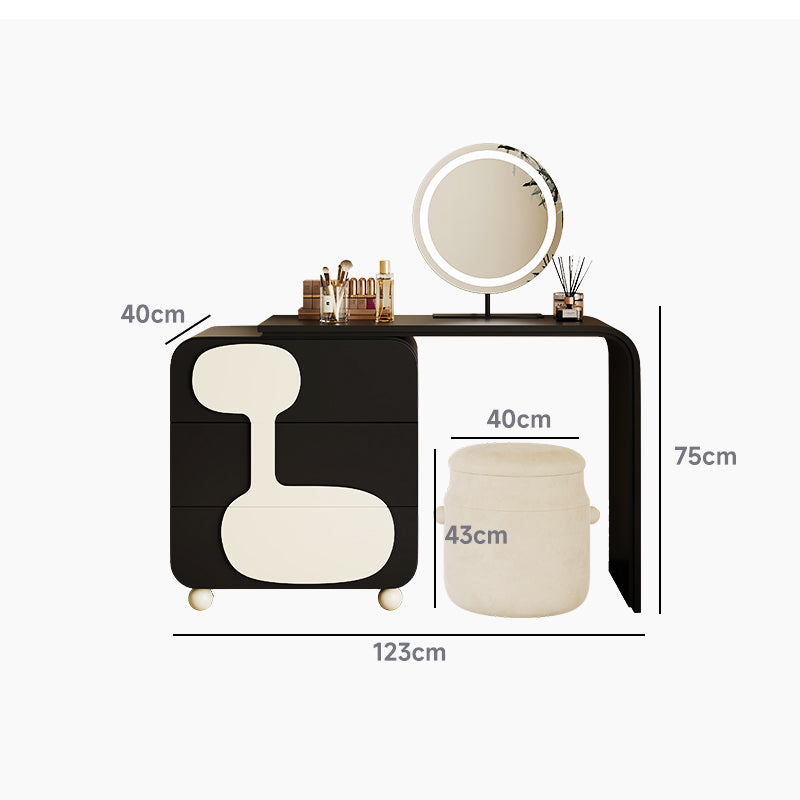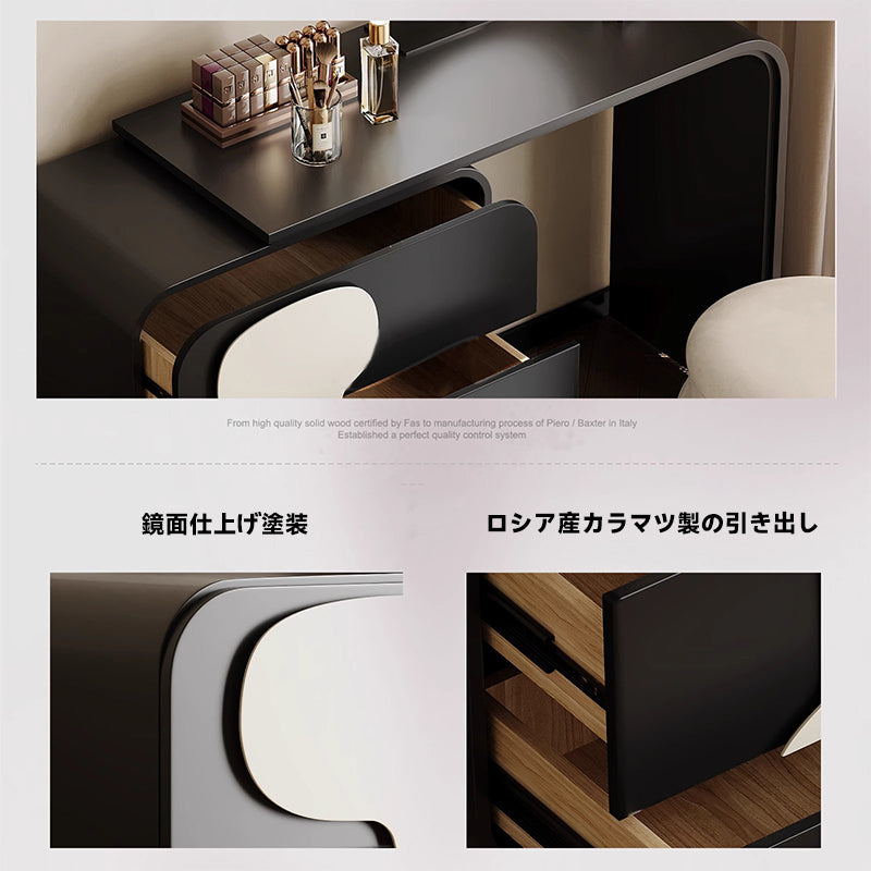 モノトーンデザインドレッサースツールセットは、洗練された美しさと機能性を兼ね備えた一品です。ブラックとホワイトのコントラストがどんなインテリアにもマッチし、E0グレードの天然木化粧合板を使用した環境に優しい設計が特徴です。3つの引き出しで化粧品やアクセサリーをすっきり収納でき、丸型ミラーは360度回転可能で使いやすさ抜群。高級感と耐久性を兼ね備えたこのセットは、日常生活に洗練されたアクセントを加えます。