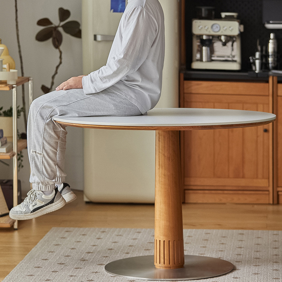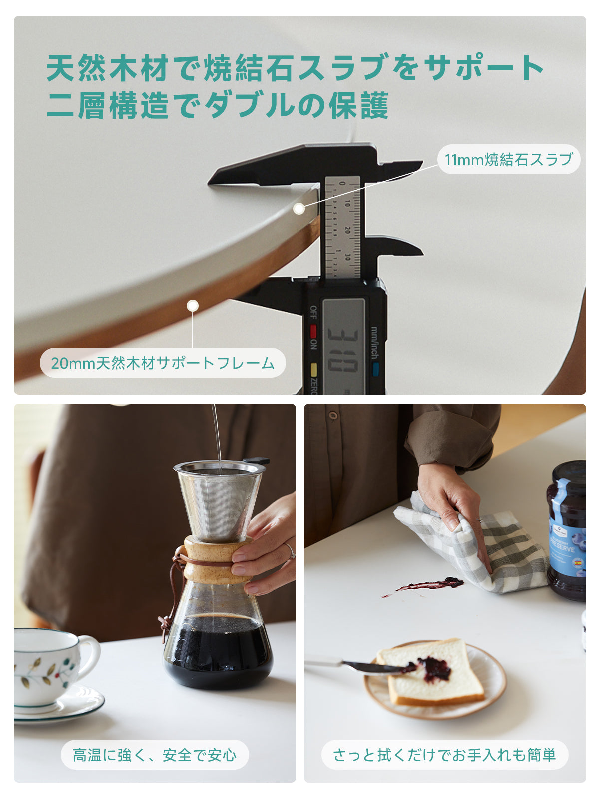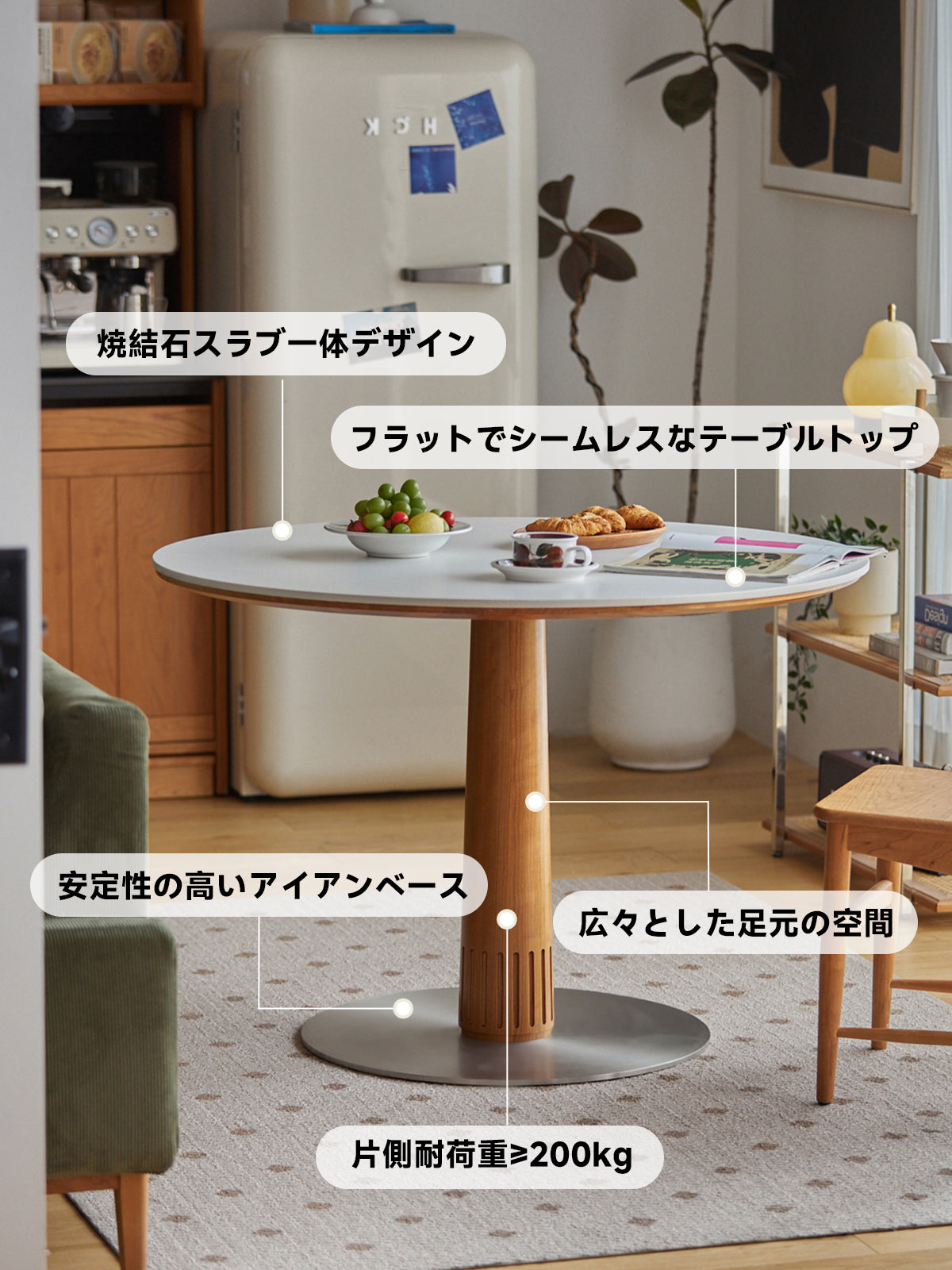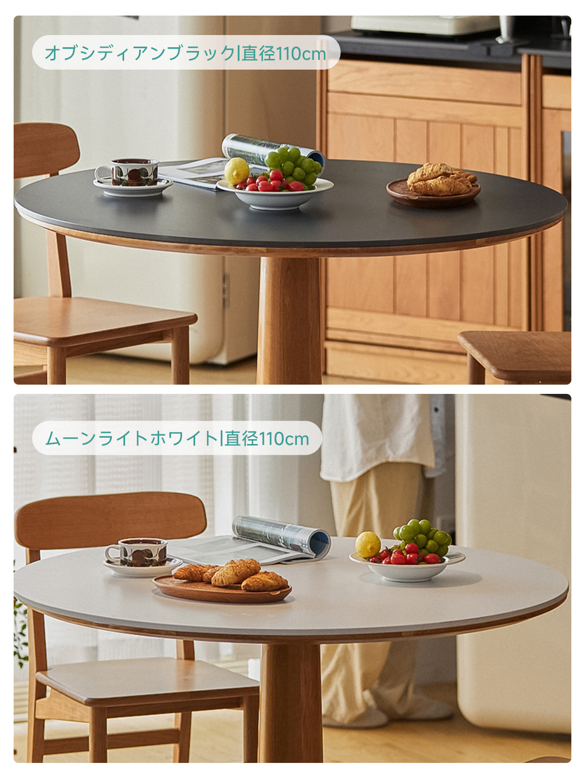 チェリー材を使用した高級セラミックコンパクトラウンドダイニングテーブルは、洗練されたデザインと高機能性を兼ね備えた逸品です。FASグレードの北米産チェリー材と11mmの焼結石スラブを使用し、耐久性と美しい木目が特徴。シームレスでフラットなテーブルトップはスタイリッシュでお手入れが簡単。頑丈なアイアンベースがテーブルをしっかり支え、直径95cmと110cmの2サイズ、オブシディアンブラックとムーンライトホワイトの2色展開。高温に強く、日常使いに最適。