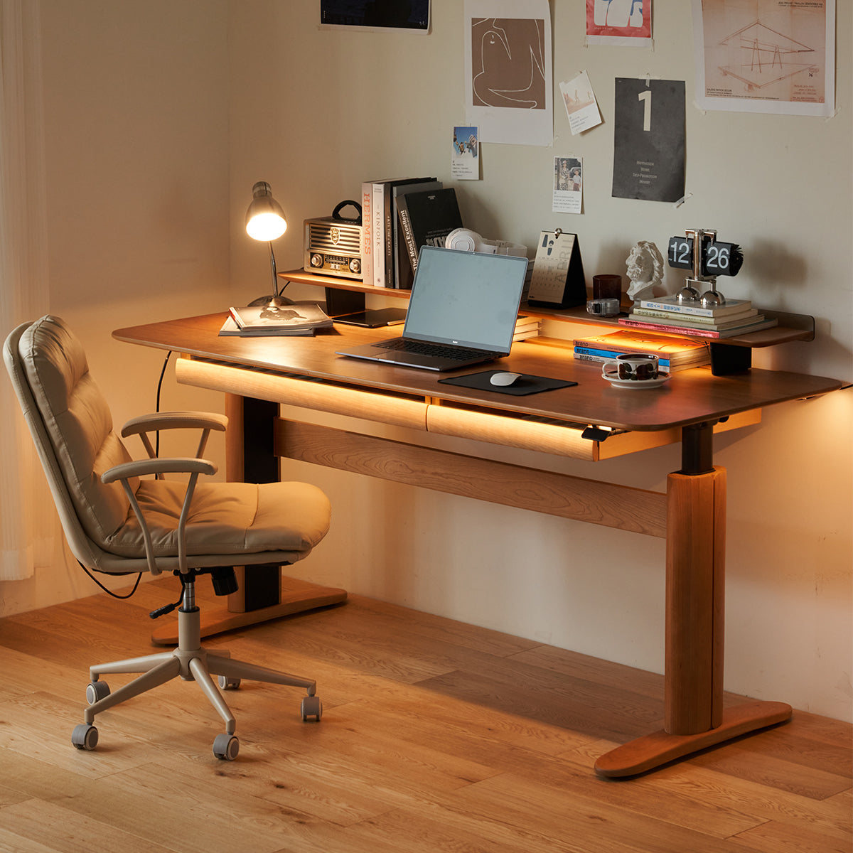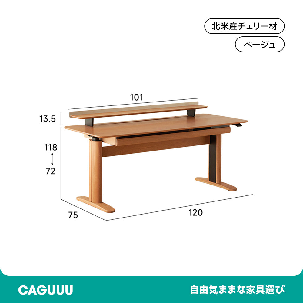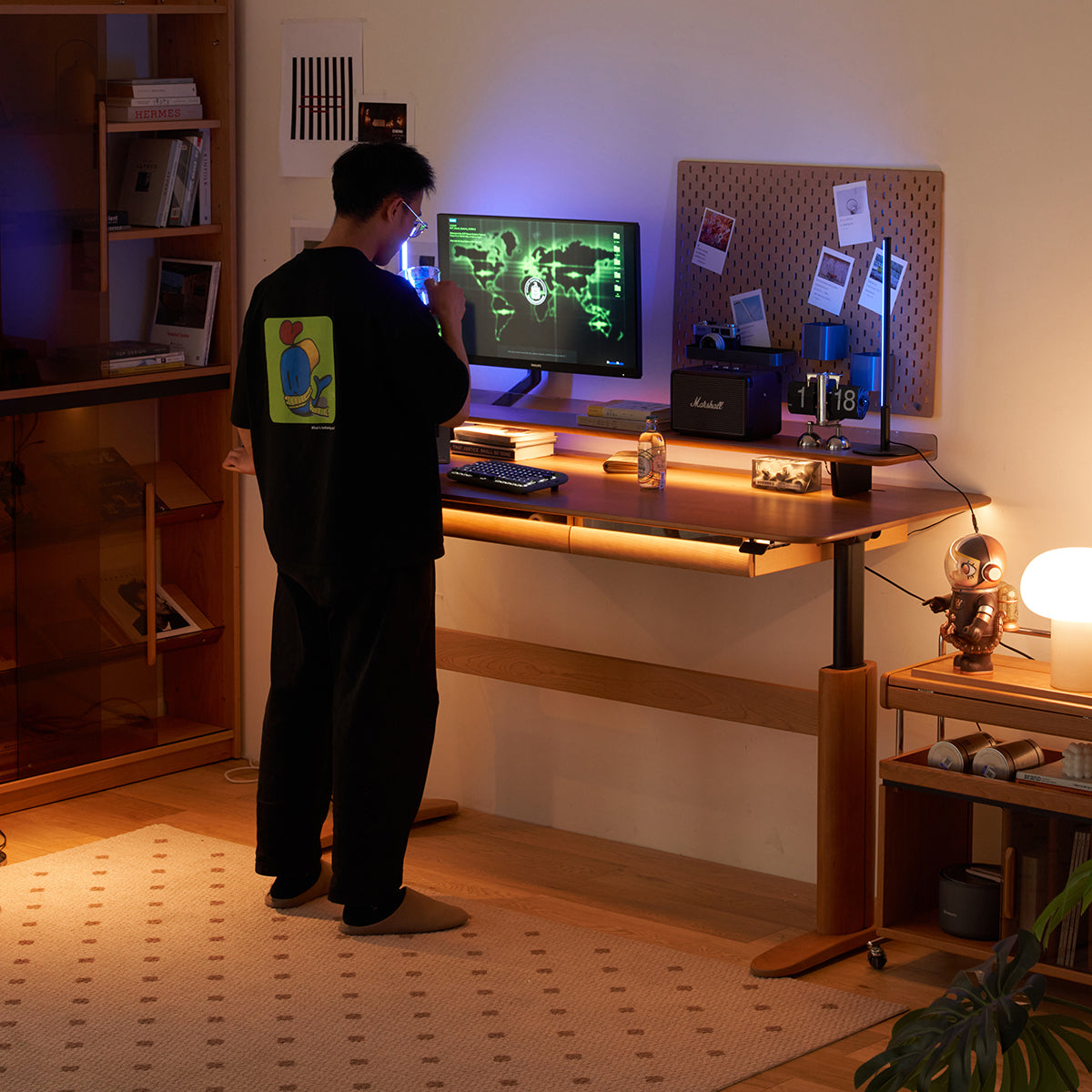 チェリー材 電動昇降式ウッドワークデスクは、北米産の高品質なチェリー材を使用し、優れた耐久性と美しい木目を誇ります。デュアルモーターによる静かでスムーズな高さ調整機能を備え、作業効率を向上させます。高さ72cmから120cmまで調整可能で、座ったままでも立ったままでも快適に使用できます。最大160kgの耐荷重を持ち、頑丈な構造で安心して使用可能。収納力抜群のデスク下ケーブル管理システムと引き出し付きで、整理整頓も簡単です。埋め込み式ライトストリップで作業空間に温かみを演出し、120cm、150cm、180cmの3サイズから選べます。健康的な生活習慣をサポートするこのデスクは、在宅勤務や趣味の作業スペースに最適です。