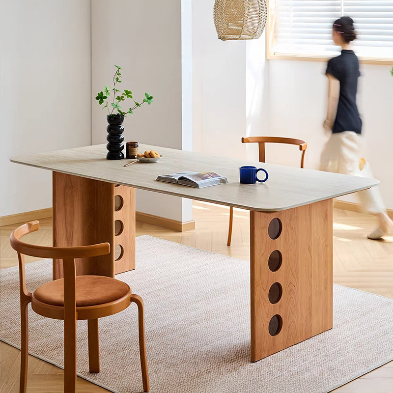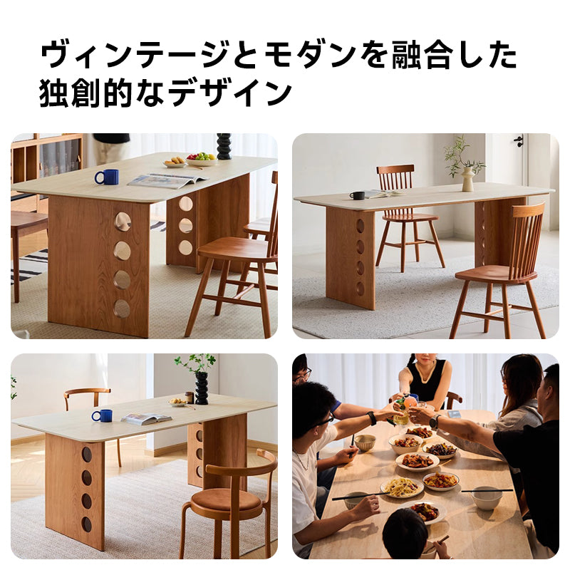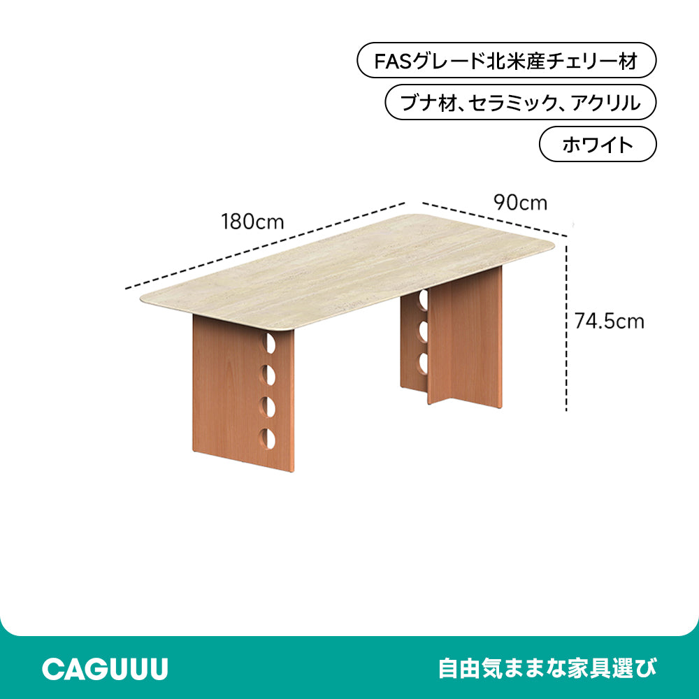 チェリー材天然木トラバーチンダイニングテーブルは、FASグレードの北米産チェリー材を使用し、美しい木目と耐久性が特徴です。ヴィンテージ感とモダンなデザインを融合し、どんなインテリアにも調和します。トラバーチン模様のセラミック天板は傷に強く、耐久性が高く、90cmの広々とした天板は快適な食事空間を提供。T型構造のテーブル脚は安定性を高め、160cm、180cm、200cmの3サイズ展開で様々な家庭に対応可能です。