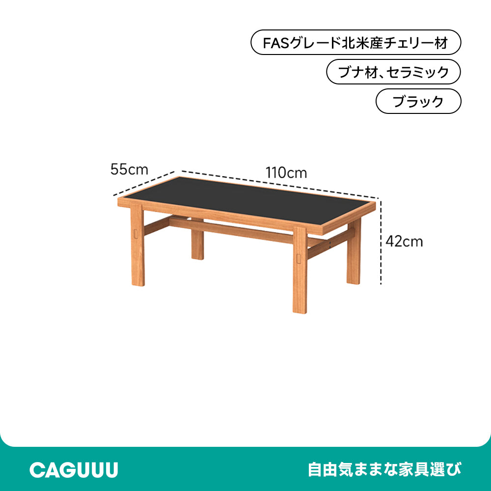 チェリー材とセラミックを組み合わせた高級感溢れるローテーブル。北米産FASグレードのチェリー材を使用し、美しい木目と耐久性を兼ね備えています。セラミック天板は耐火性、耐熱性、防水加工が施され、日常の傷にも強い設計。H型脚部構造で安定感抜群。ヴィンテージスタイルのデザインがモダンな空間を引き立て、リビングルームに温かみとスタイルを加えます。幅110cm、奥行55cm、高さ42cmの広々とした天板で自由に物を配置可能。簡単組み立てで便利に使用できます。