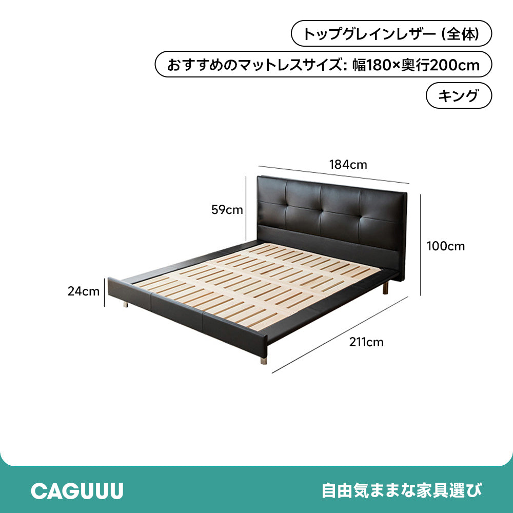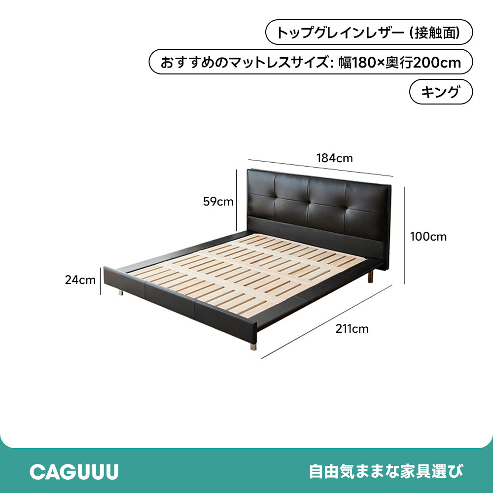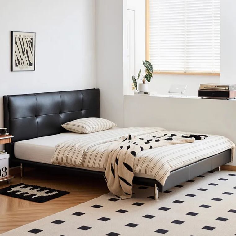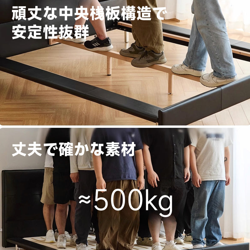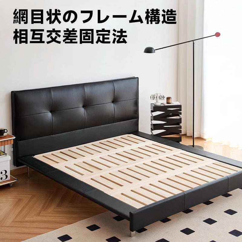 ブラックレザーベッドは、スタイリッシュで洗練されたデザインが魅力の高級ベッドです。トップグレインレザーを使用し、耐久性と快適さを追求。スクエアデザインのヘッドボードは読書やリラックス時に最適で、スマホなどの小物が落ちにくい設計です。耐久性試験をクリアし、ひび割れに強い構造。中央桟板構造と多支柱で安定性抜群。環境に優しい自然加工と防音シートで静かな睡眠環境を提供します。