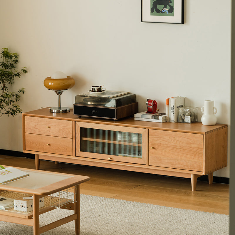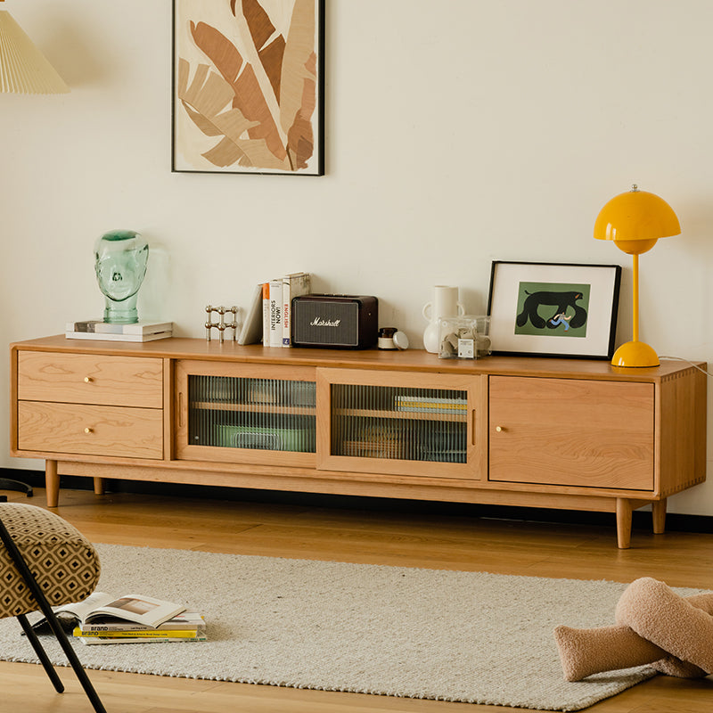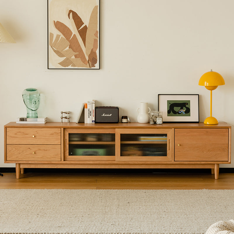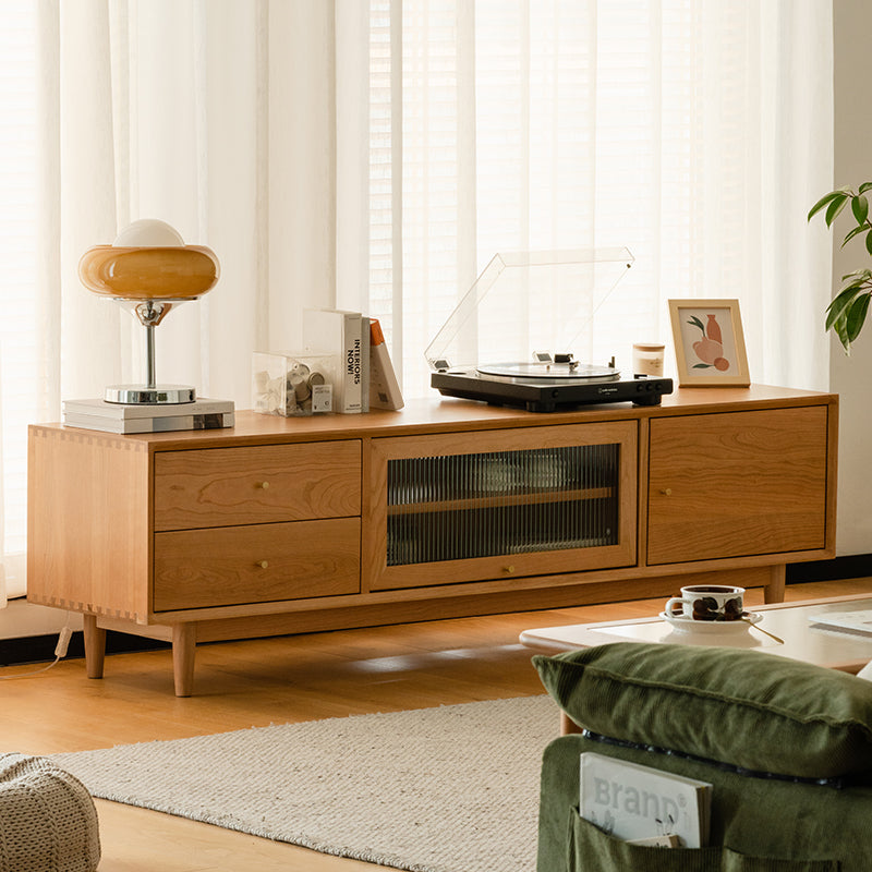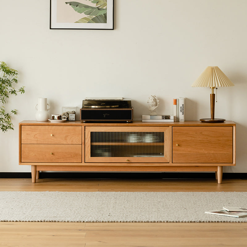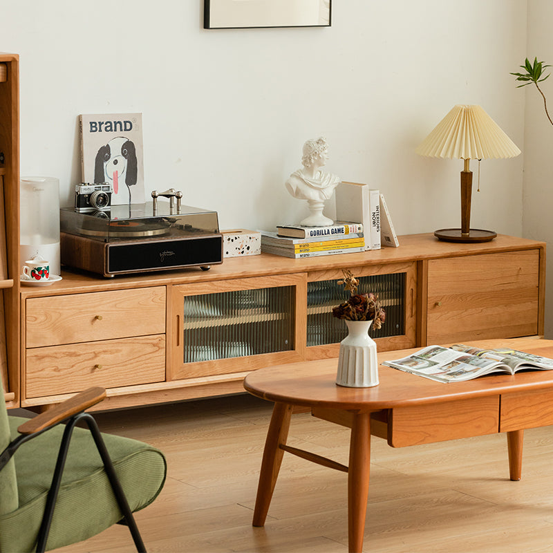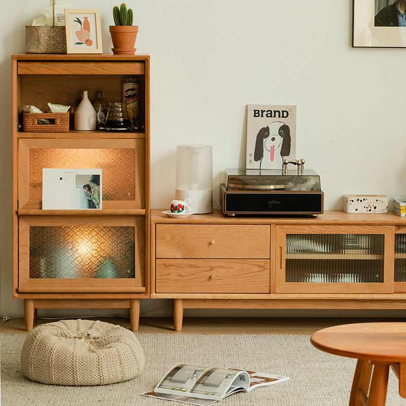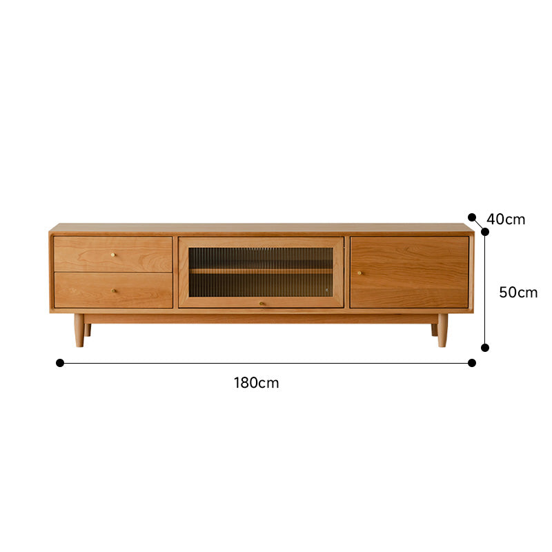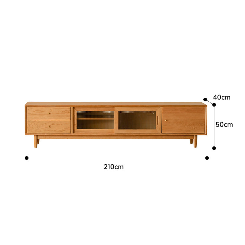 この天然木キャビネットは、北米産のFASグレードチェリー材を使用し、温かみのある手触りと滑らかな質感が特徴です。幅150cm、180cm、210cmの3種類があり、様々な部屋のサイズに合わせて選べます。大容量の引き出しと調節可能な棚板で効率的な収納が可能です。リブガラスの扉はプライバシーを保ちつつ中身を見せないデザインで、配線孔があり、電子機器のコード類をすっきりとまとめられます。伝統的なほぞ継ぎ加工により、美しさと強度を両立し、補強用金具と油圧式ヒンジを使用しており、耐久性が高く安全に使用できます。水性ニスを使用し、環境にも配慮した仕上げとなっています。