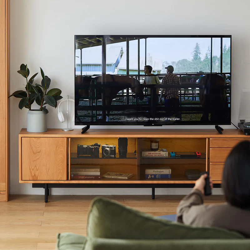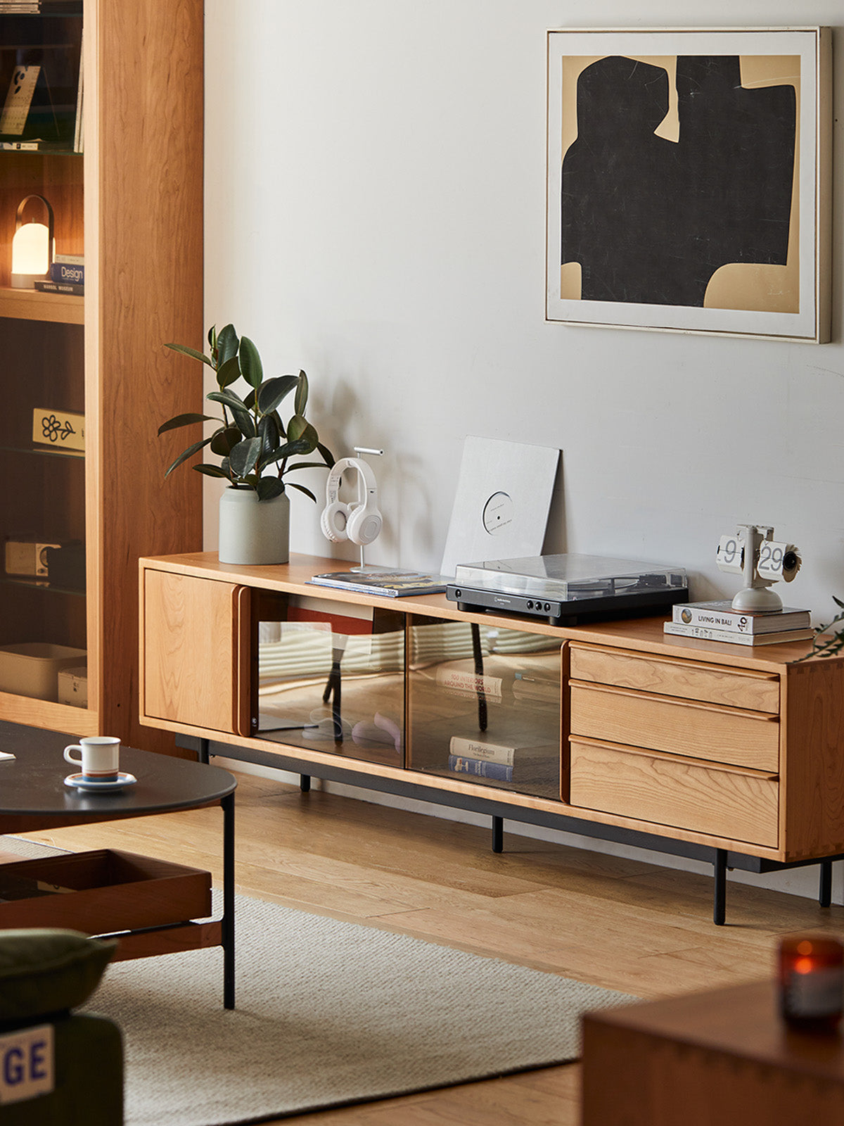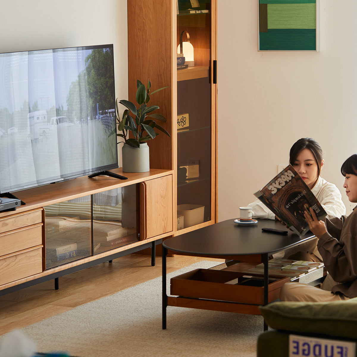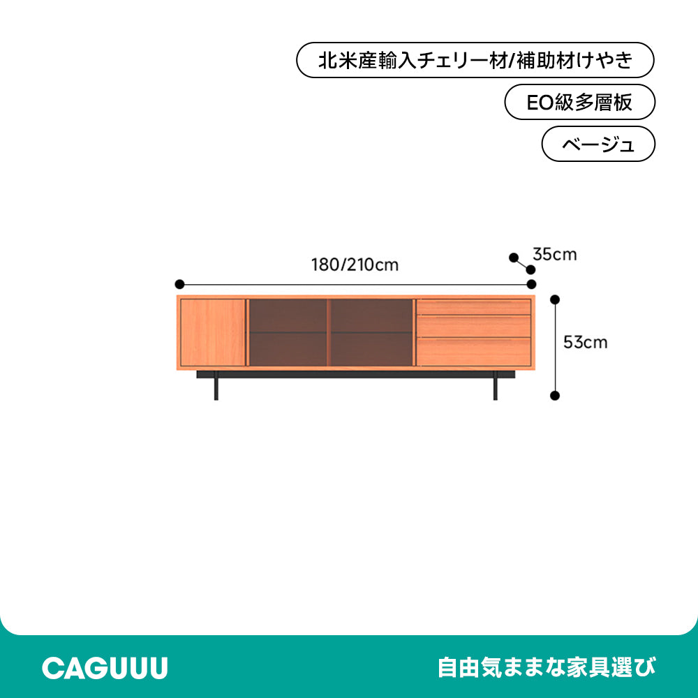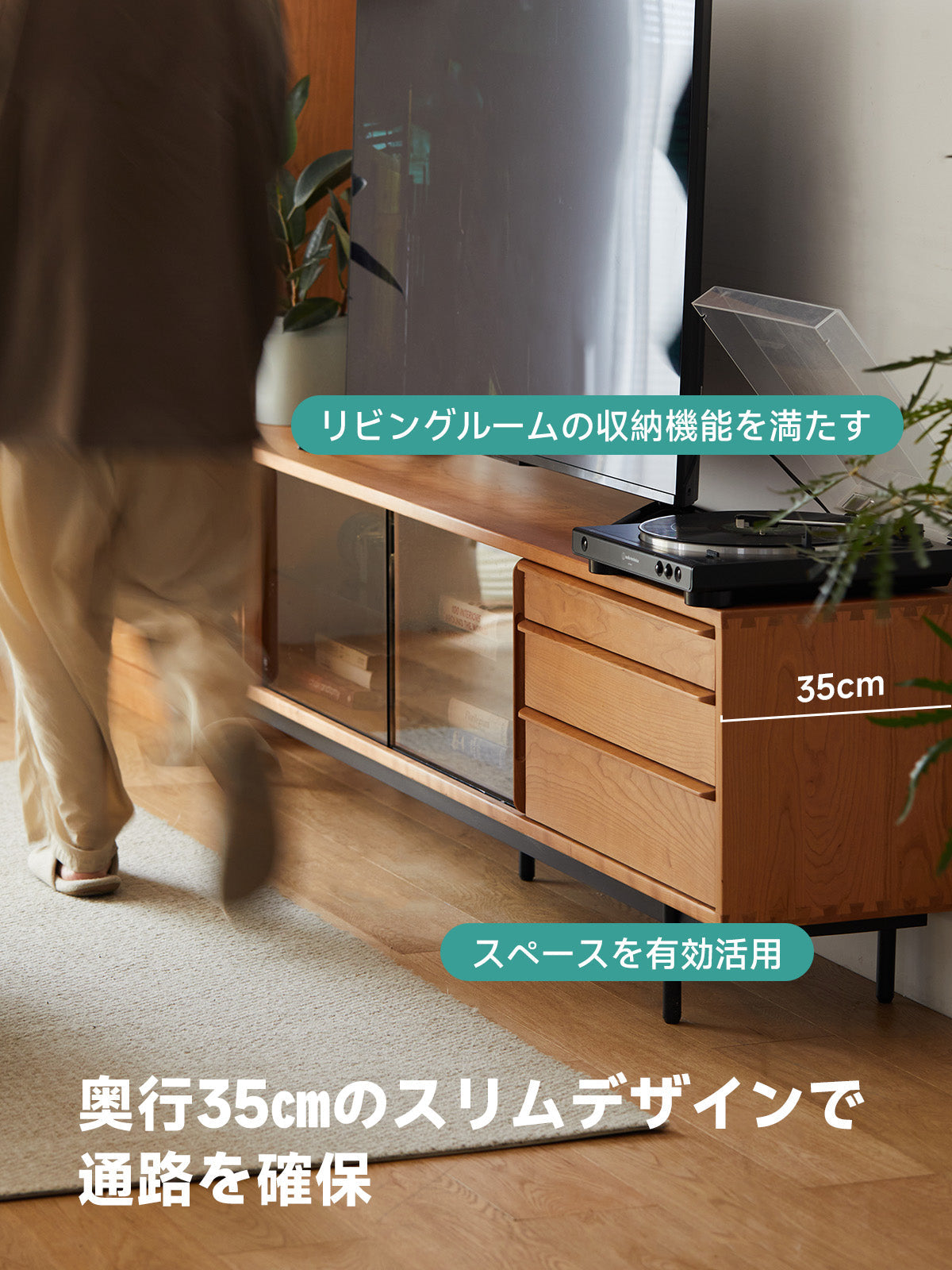 チェリー材のガラス扉付き木製テレビキャビネットは、北米産の高級チェリー材を使用し、上質な質感と耐久性を兼ね備えた製品です。シンプルでミニマルなデザインはどんなインテリアにも自然に溶け込みます。奥行35cmのスリムな設計でスペースを有効活用しながら、リビングルームの収納機能を満たします。大容量のロッカーと多段式の引き出しにより、整理整頓がしやすく、ブラウンガラスの扉はリモコンの信号を遮断せず、内部をすっきりと見せます。取り外し可能なバックパネルにはコード用スリットが付いており、配線が簡単です。頑丈な金属製の脚がキャビネットをしっかりと支え、揺れや傾きの心配がありません。150cm、180cm、210cmの3サイズ展開で、設置場所に合わせて選べます。