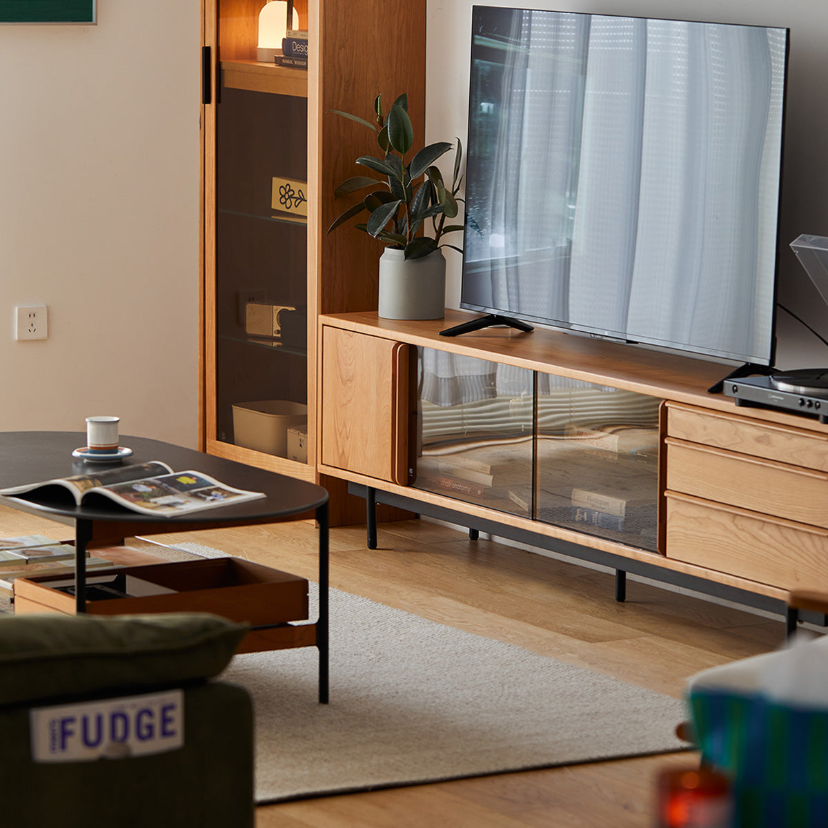 チェリー材 ガラス扉付き木製テレビキャビネット
