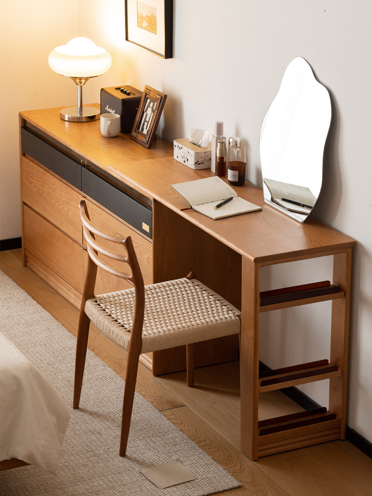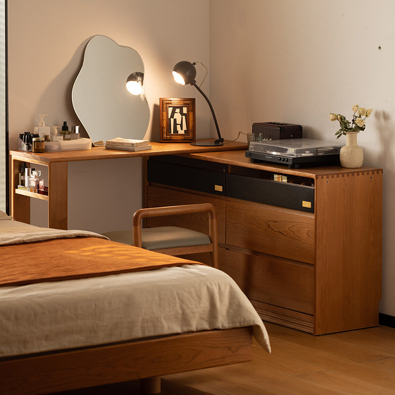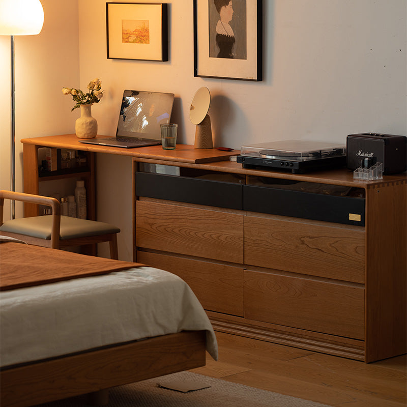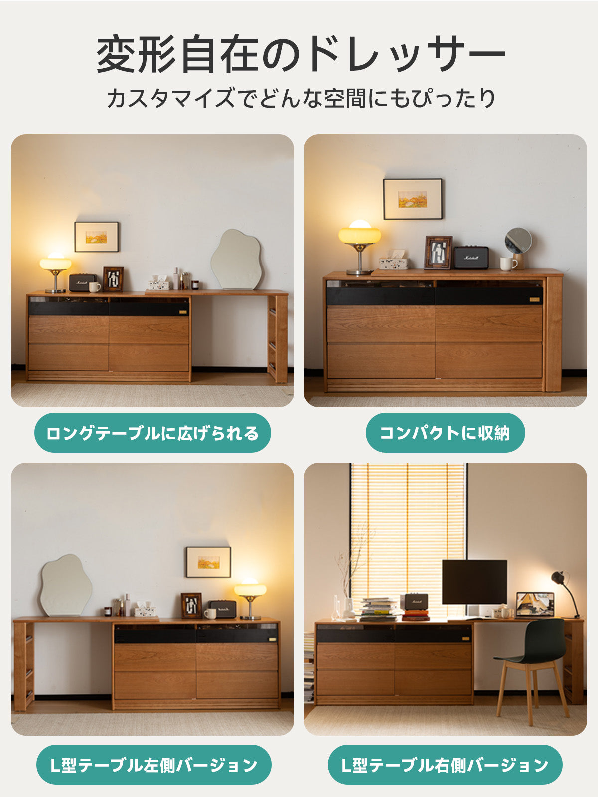 収納付きウッド伸長式ドレッサーは、北米産の高品質なチェリー材を使用し、シンプルで洗練されたデザインが特徴です。フレキシブルな設計で、テーブル部分は自由に配置可能。6段の大容量引き出しがあり、衣類や小物を整理整頓するのに最適です。高級感溢れる素材と安全性を兼ね備え、強化ガラス付きで安心して使用できます。組み立てが簡単で、どんなインテリアにもマッチするこのドレッサーは、長く愛用できる家具です。