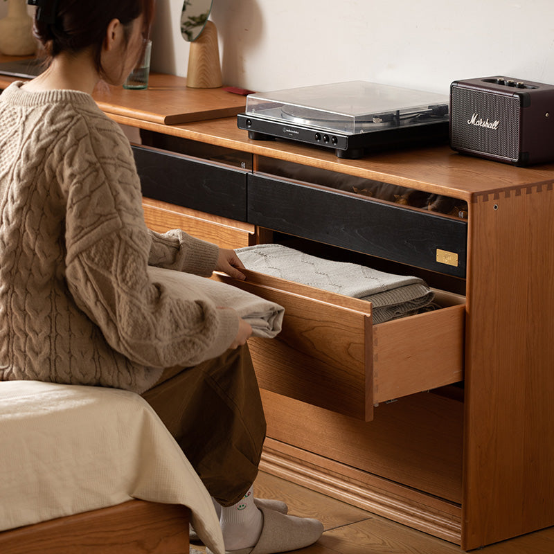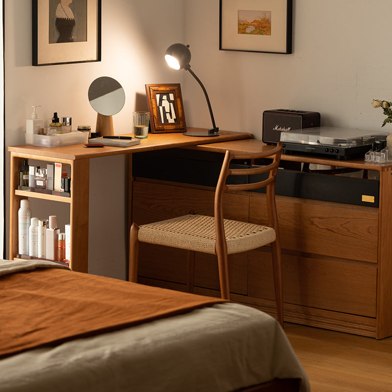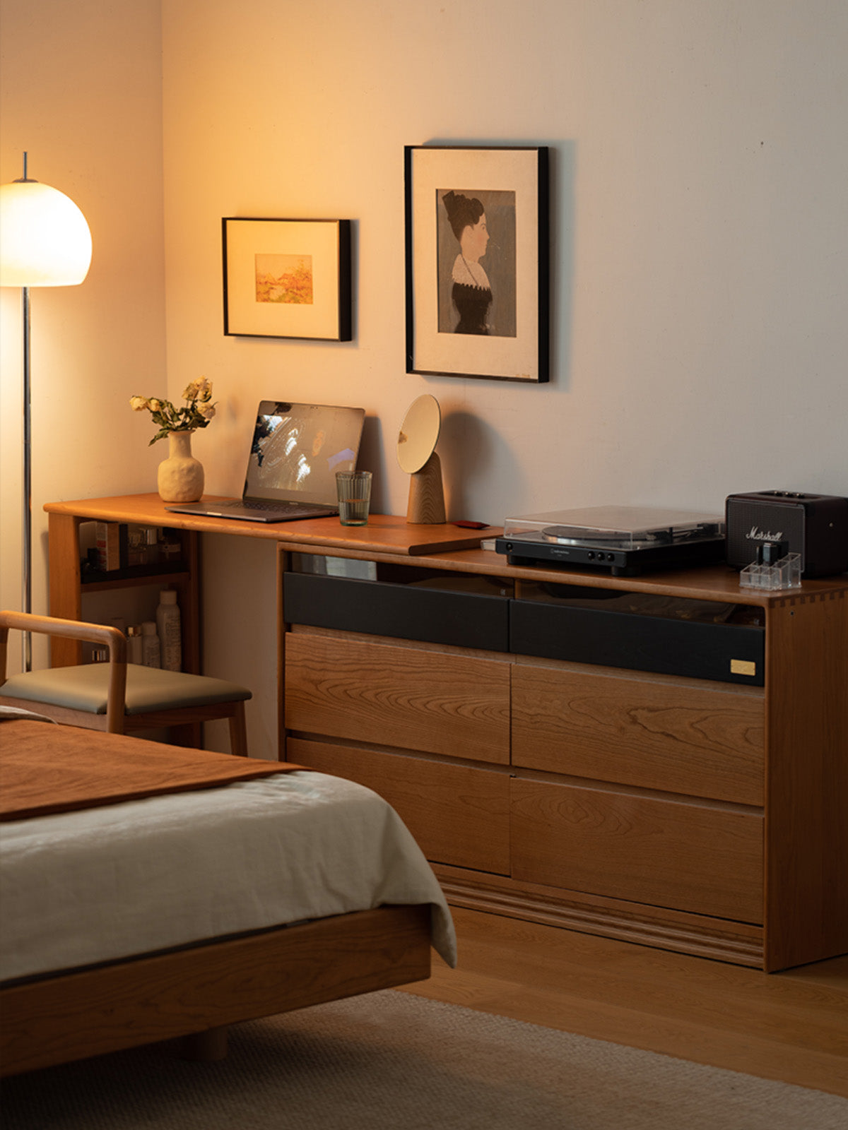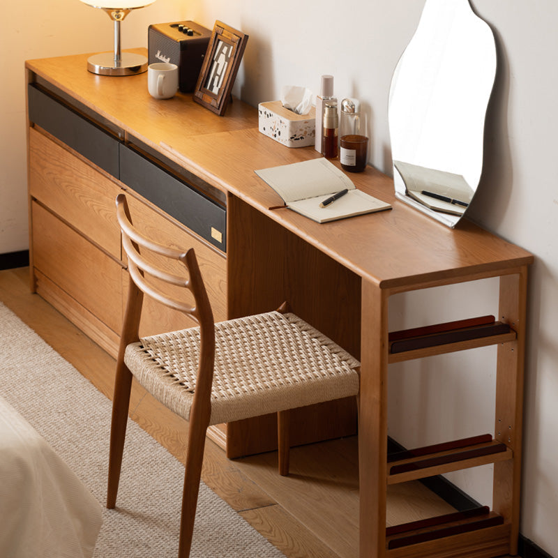 収納付きウッド伸長式ドレッサーは、北米産の高品質なチェリー材を使用し、シンプルで洗練されたデザインが特徴です。フレキシブルな設計で、テーブル部分は自由に配置可能。6段の大容量引き出しがあり、衣類や小物を整理整頓するのに最適です。高級感溢れる素材と安全性を兼ね備え、強化ガラス付きで安心して使用できます。組み立てが簡単で、どんなインテリアにもマッチするこのドレッサーは、長く愛用できる家具です。