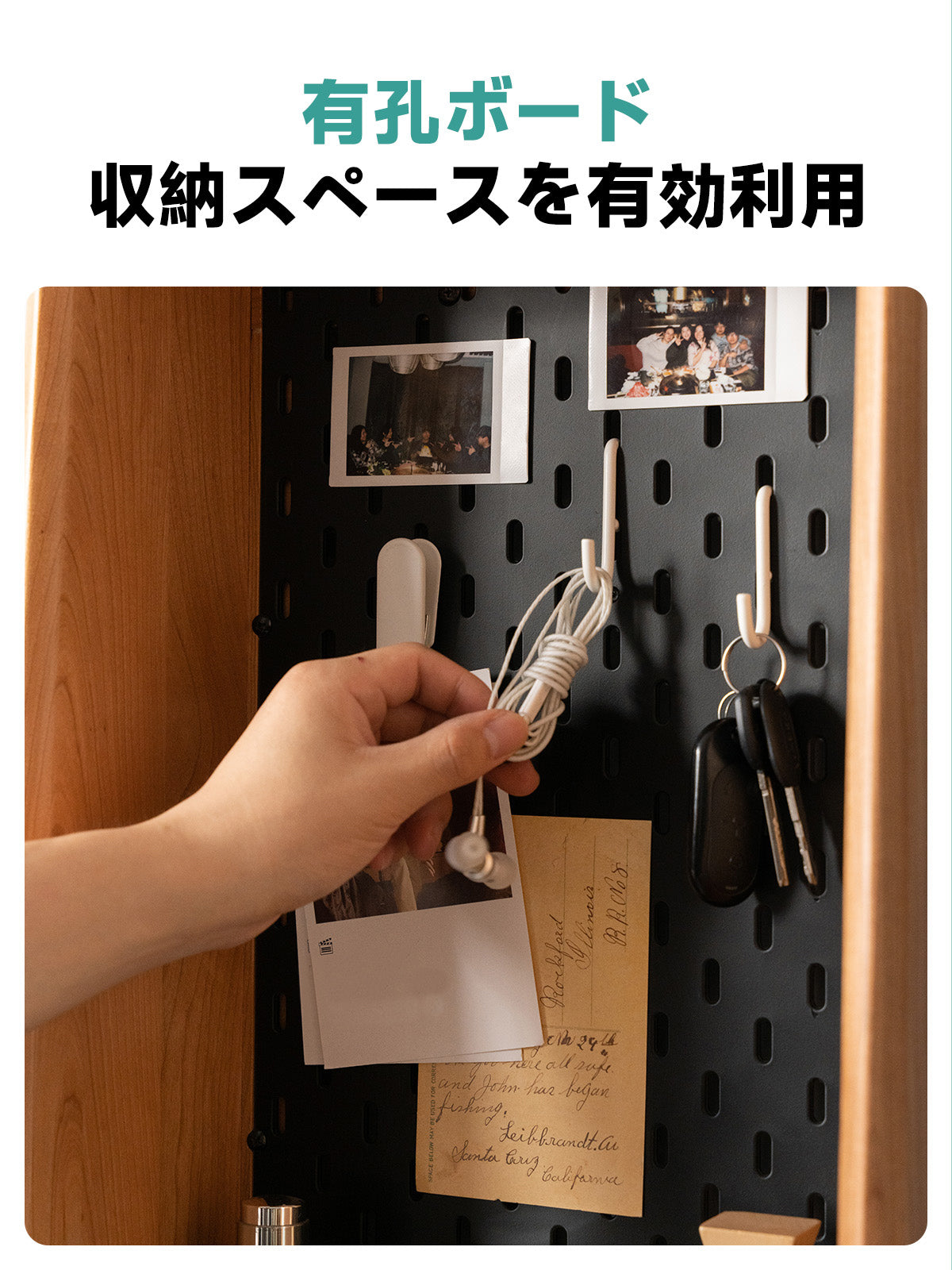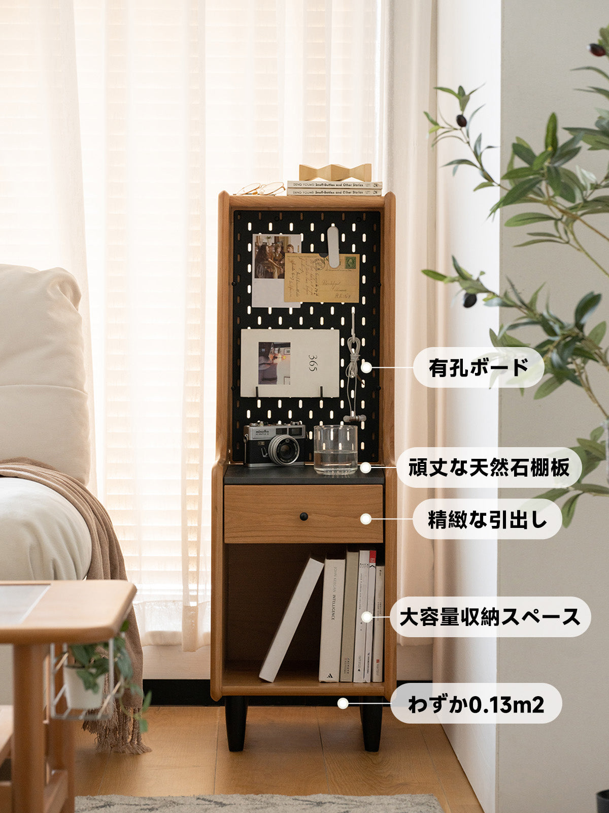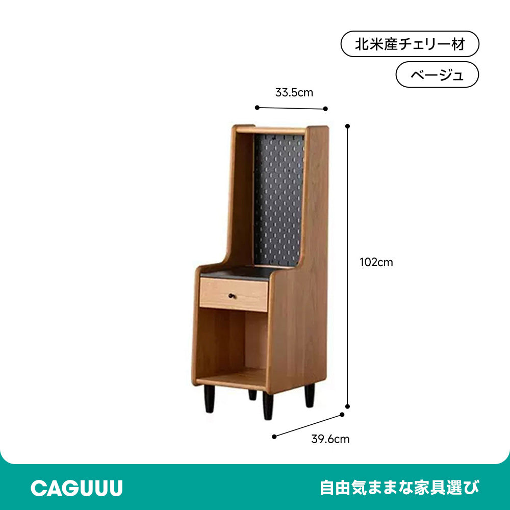 チェリー材 有孔ボード付きチェリーウッドナイトテーブルは、北米産のFAS級チェリー材を使用し、高級感と耐久性を兼ね備えた一品です。サイズは33.5cm x 39.6cm x 102cmで、狭いスペースにもぴったり。ナチュラルブラウンの色合いがどんなインテリアにも調和します。有孔ボード付きで、鍵やメモを掛けるのに便利。自然木のレールで引き出しはスムーズに開閉でき、大容量の収納スペースも完備。天然石の棚板は耐熱性があり、傷がつきにくい設計。ヴィンテージデザインのブラック金属製取っ手がアクセントです。組み立て式で簡単に設置可能。