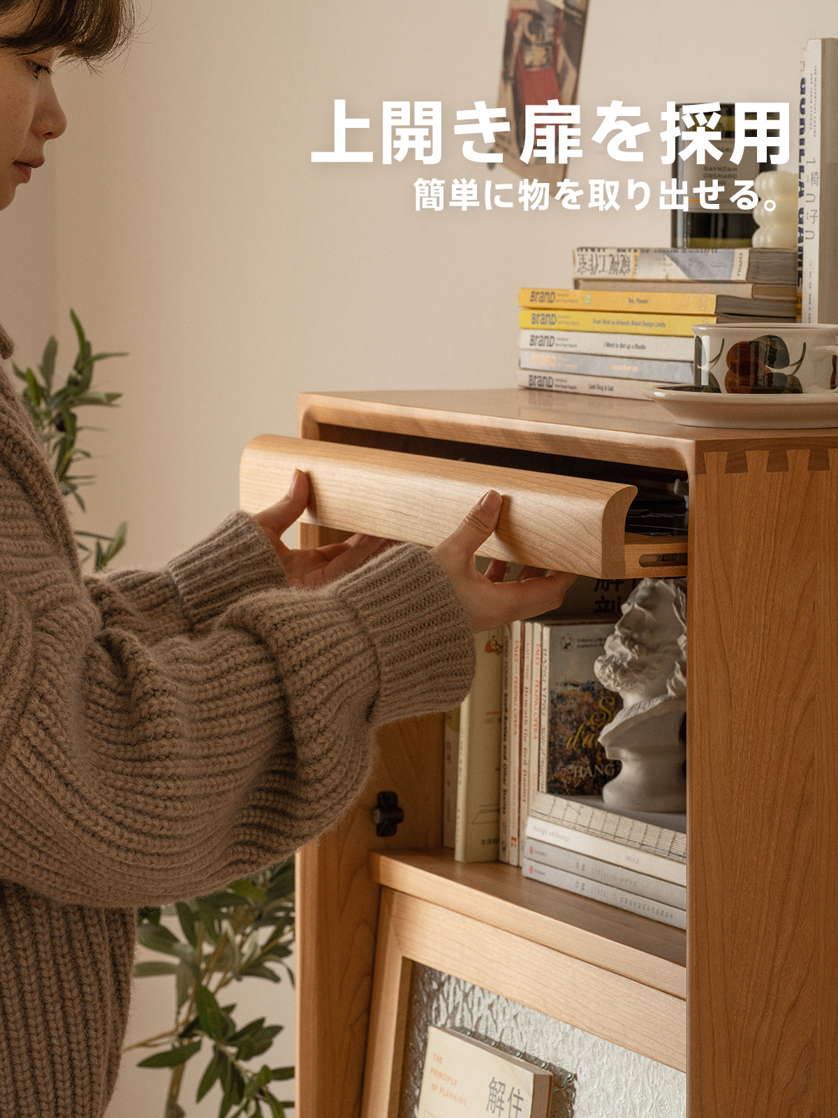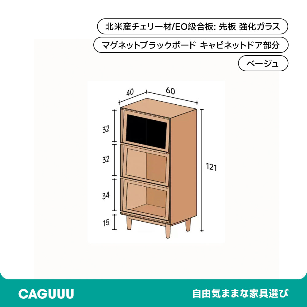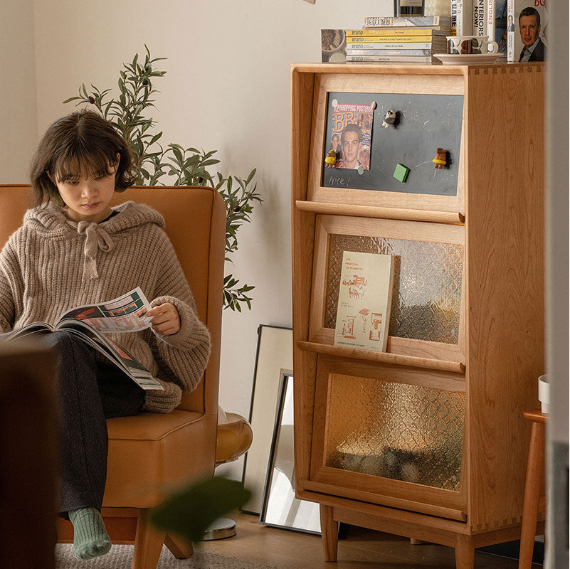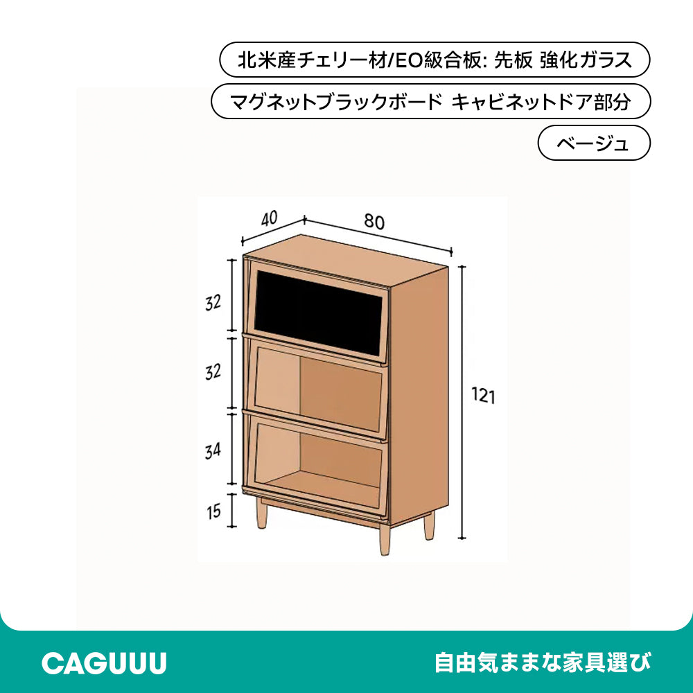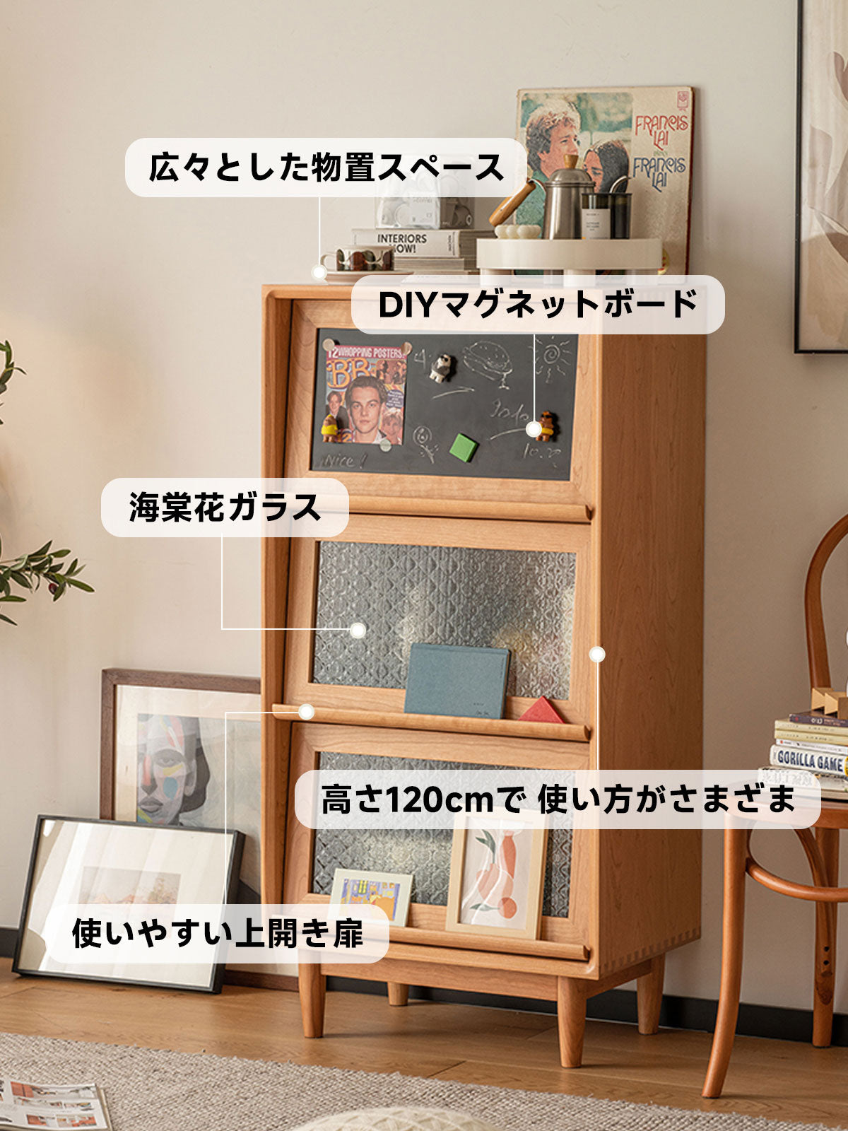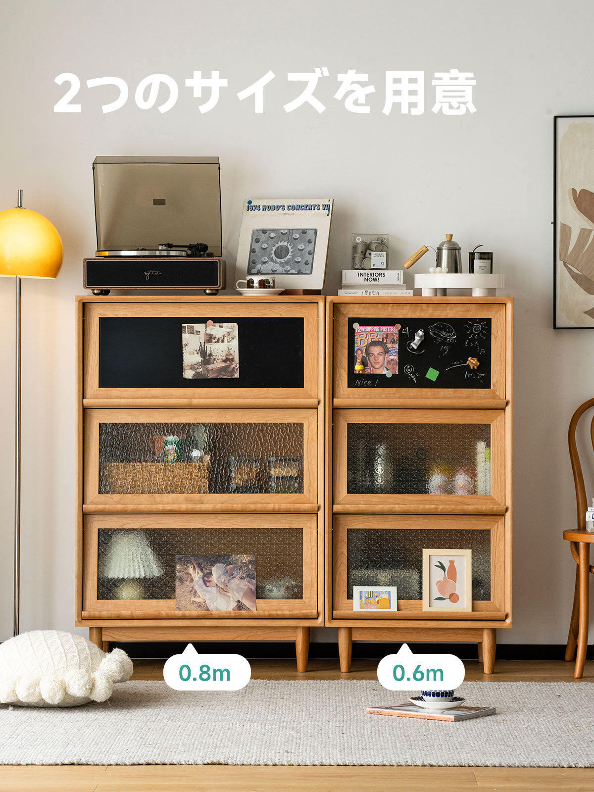 チェリー材 ブラックボード付きベゴニアガラス扉キャビネットは、北米産の高品質なFAS級チェリー材を使用し、耐久性と美しい木目が特徴です。ヴィンテージ感を演出するベゴニアガラス扉が内部を見えにくくしながらもおしゃれなデザインを提供します。上部にはDIYマグネットボードが付いており、メモや写真を簡単に貼り付けることができます。高さ120cmで、リビング、書斎、寝室、玄関など様々な場所で活用でき、雑貨や日用品、本、衣類などをすっきり収納可能です。転倒防止装置付きで安心して使用でき、幅60cmと80cmの2サイズ展開でお部屋のスペースに合わせて選べます。