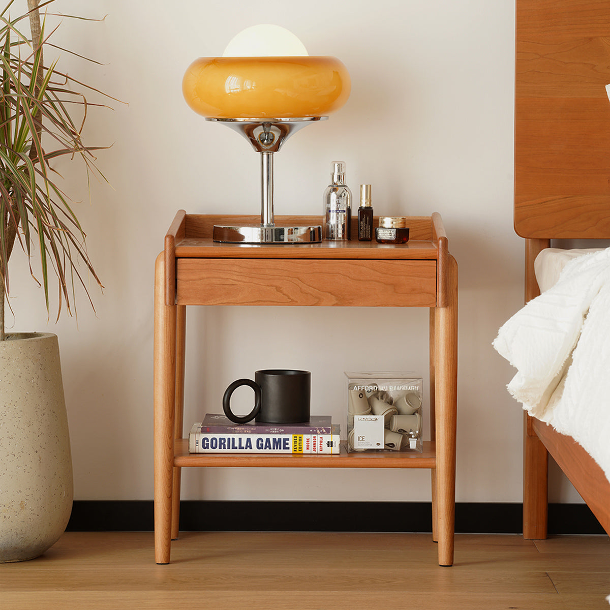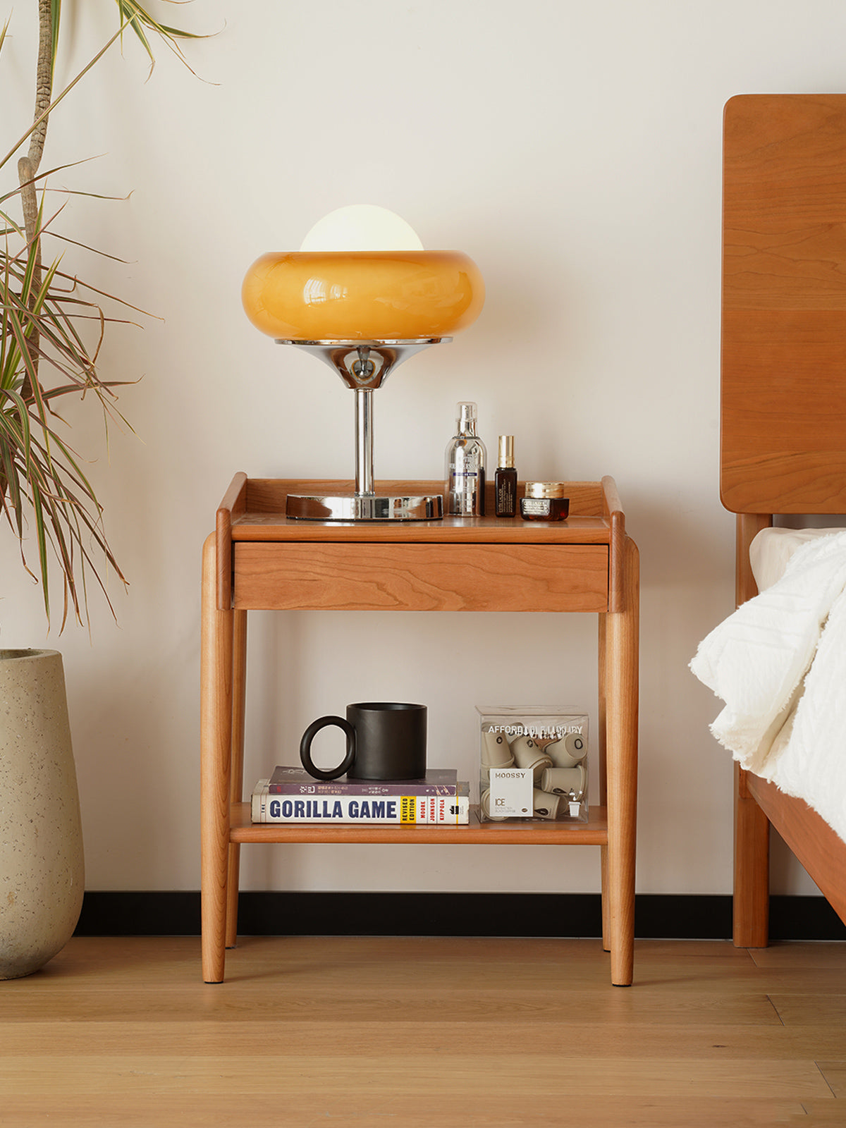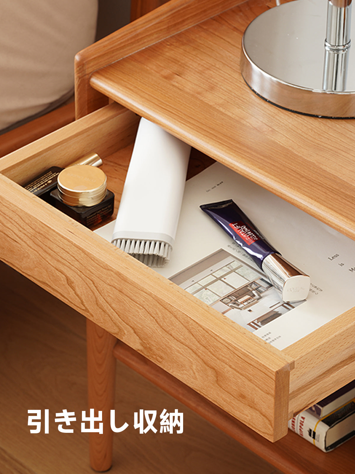 チェリー材 引き出し付きナイトテーブルは、FAS級の北米産チェリー材を使用した高品質な家具です。シンプルで洗練されたデザインが特徴で、どんなお部屋にも自然に溶け込みます。引き出し付きで収納力も抜群、ベッドサイドの小物をすっきりと整理できます。エッジ付きの実用的なデザインで、物が落ちにくい構造です。taiho paintで塗装され、美しい仕上がりを実現しています。