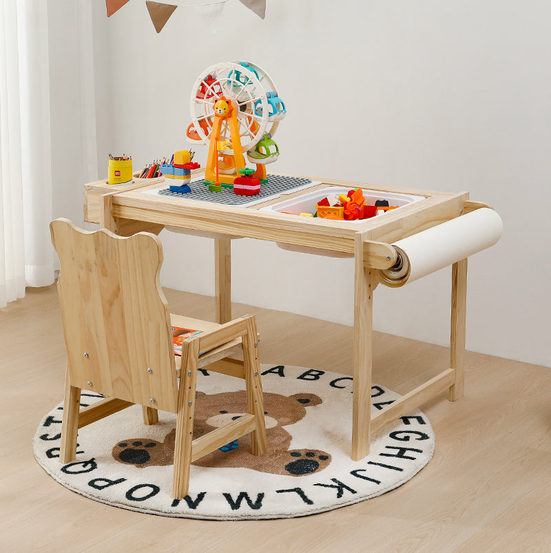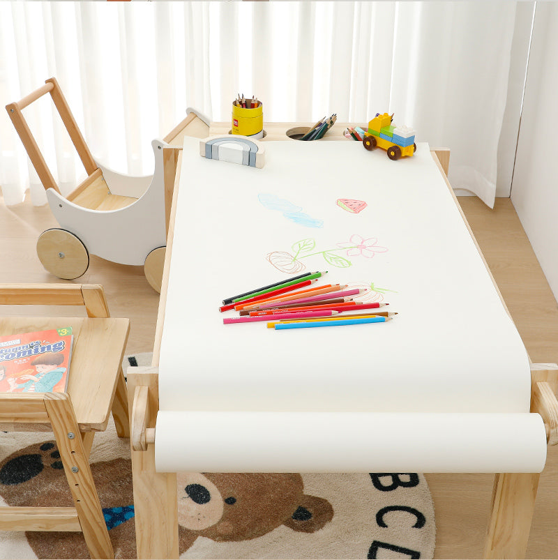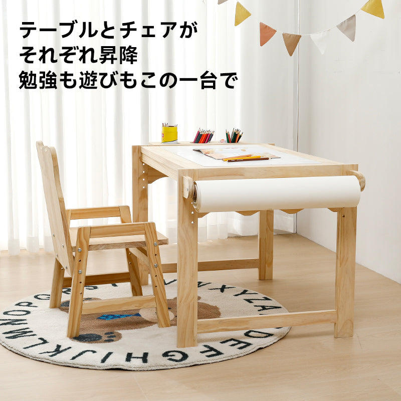 収納付き昇降お絵描きテーブル&チェアは、子供の創造力を育む多機能な家具セットです。高さ調整可能なテーブルとチェアは、成長に合わせて長く使用でき、収納スペースで文房具やおもちゃを整理整頓。ニュージーランド産パイン材を使用した自然なデザインで、安全性を考慮。お絵描き用ロールペーパー付きで、自由に絵を描くことが可能。学習から遊びまで幅広く活用できる理想的なセットです。