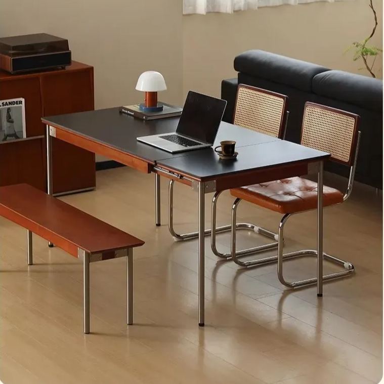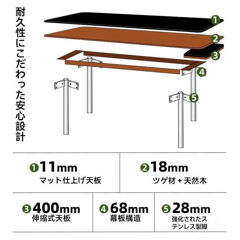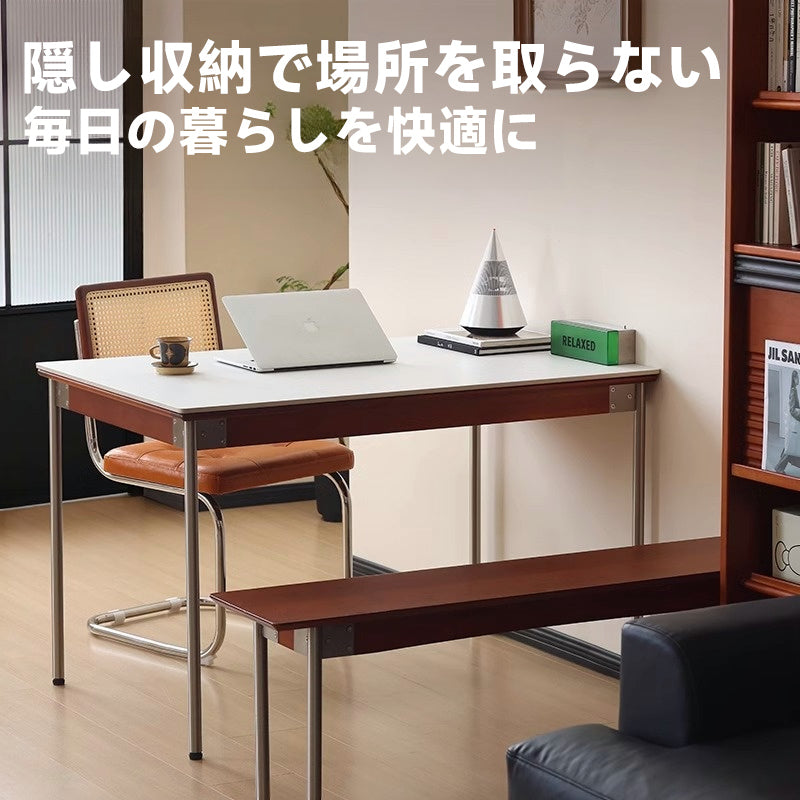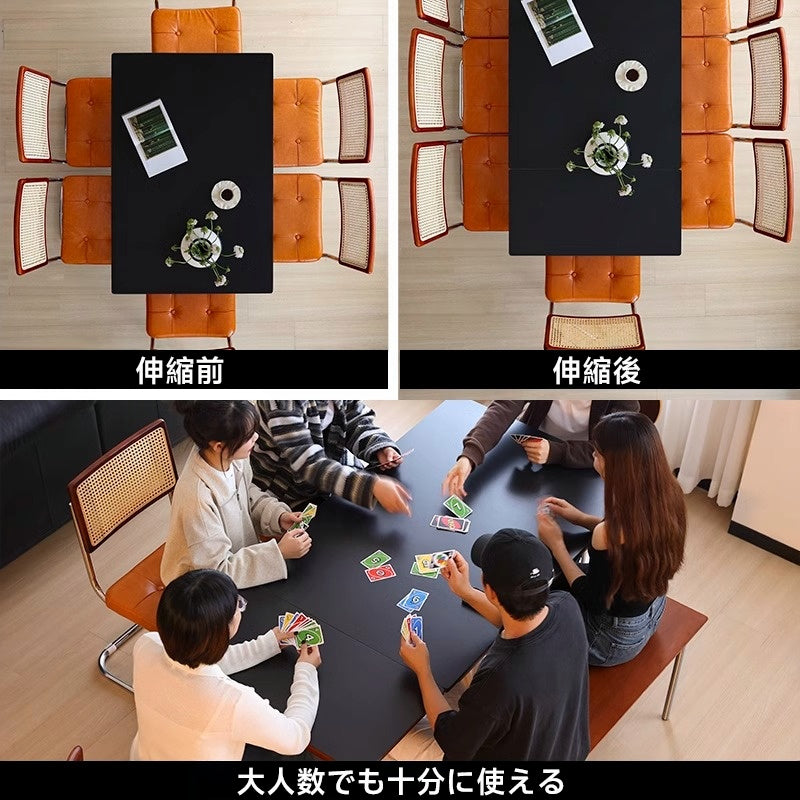 ツゲ材を使用した伸縮式スレートダイニングテーブルは、最大40cmまで拡張可能なデザインが特徴です。FAS級のツゲ材と11mmのセラミックを使用し、耐久性と美しさを兼ね備えています。304ステンレス製の脚部は錆びにくく、長期間安心して使用できます。隠し収納機能や丸角加工により、安全で使いやすいデザインです。120cmと140cmのサイズ、ブラック、ホワイト、ナチュラルブラウンの3色から選べ、どんなインテリアにもマッチします。