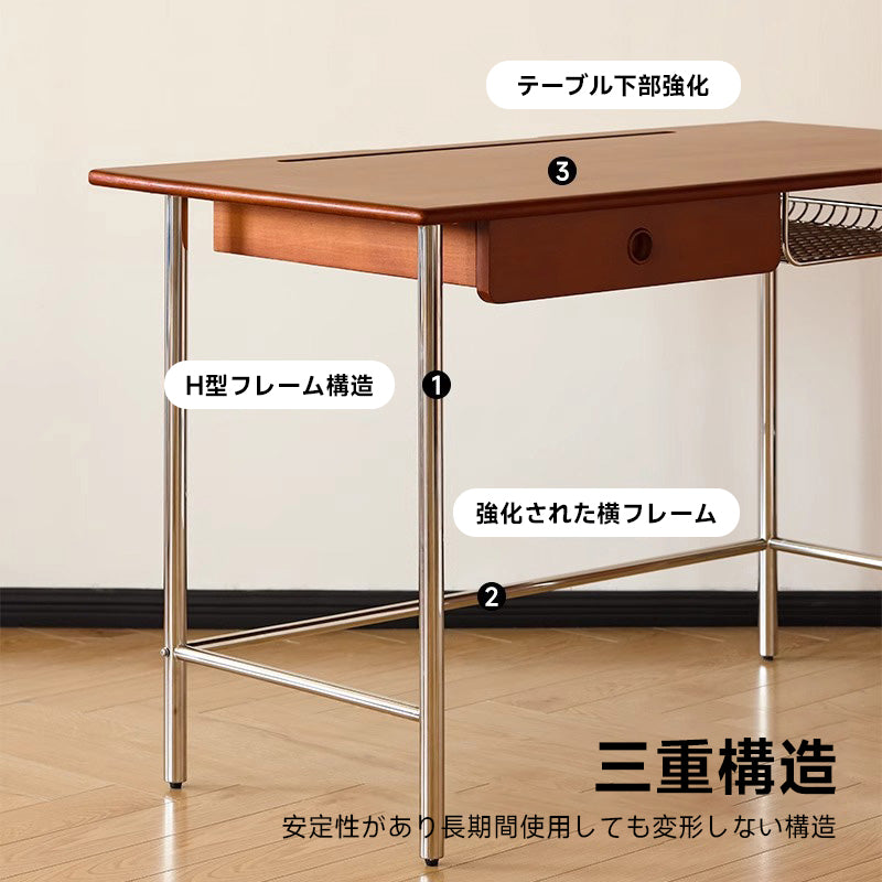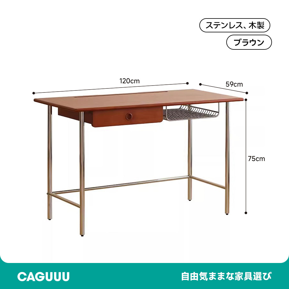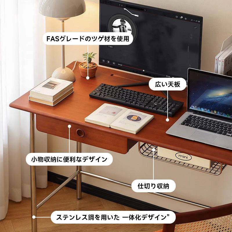 ツゲ材異素材デザインデスクは、北米産FASグレードの高品質なツゲ材を使用し、洗練されたデザインを実現したデスクです。幅120cm、奥行き59cm、高さ75cmのサイズで、小さな部屋でも広々とした作業スペースを提供します。高品質なツゲ材と304ステンレス製H型フレーム構造により、耐久性と安定性を兼ね備えています。丸みを帯びたエッジとスマートな溝付きデザインで、快適な作業環境を実現。オープンタイプの収納ラックと浅い引き出しで効率的な収納が可能です。調整可能な脚パッドと環境に優しい水性塗料を使用し、安全で安心な使用が可能です。ホームオフィスや学習スペースに最適なスタイリッシュで機能的なデザインが特徴です。