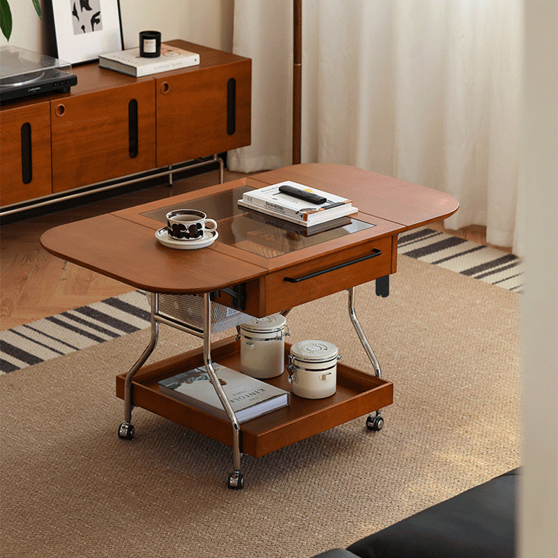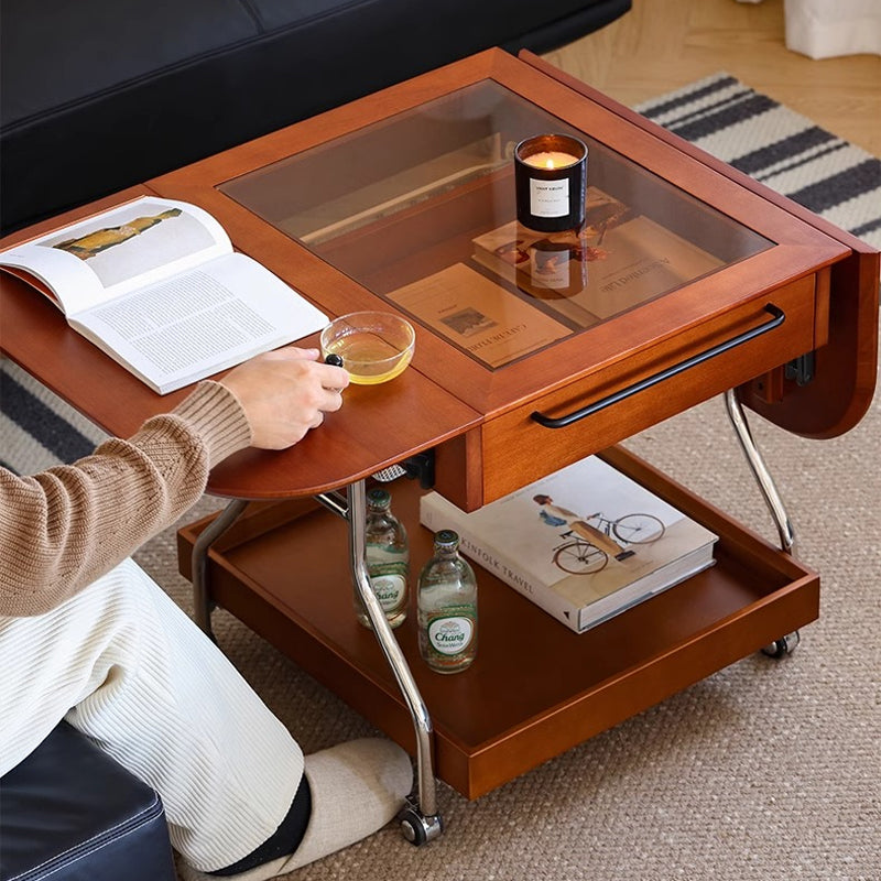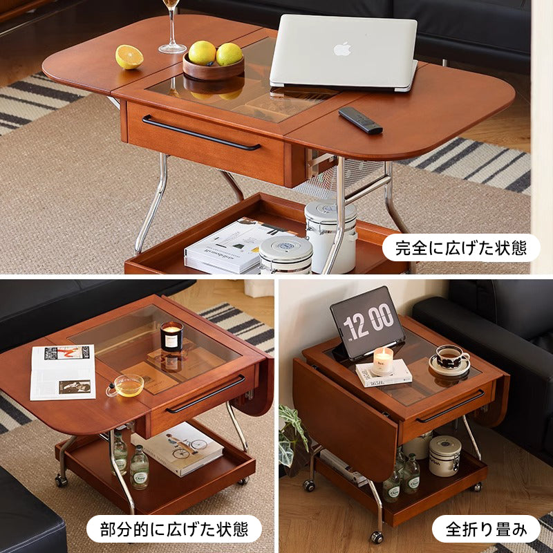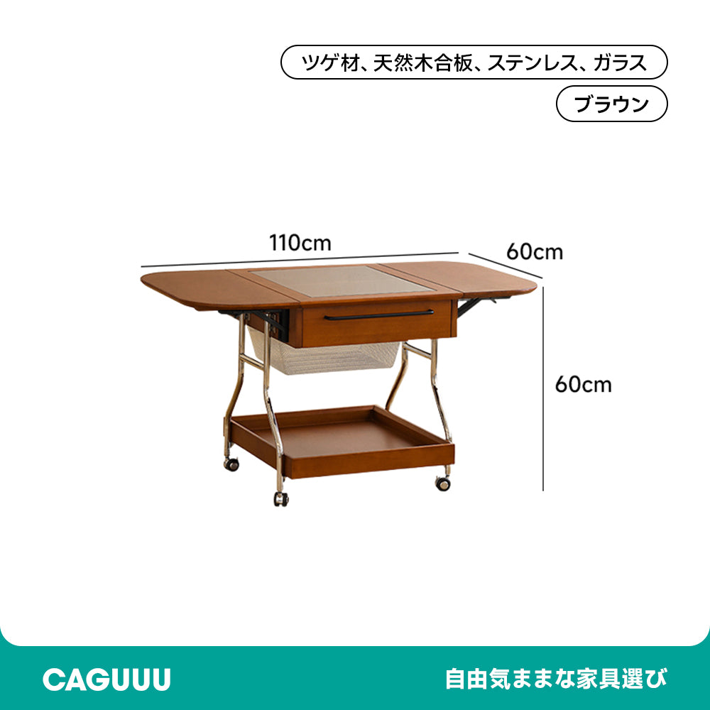 ツゲ材キャスター付き折りたたみテーブルは、北米産高級ツゲ材を使用し、職人技で木目を揃えた一枚板仕上げが特徴。耐久性に優れた304ステンレススチールフレームを採用し、溶接なしの一体型で頑丈。多機能デザインで3つのスタイルに変形可能、収納力も抜群。キャスター付きで移動が簡単、環境に優しい水性塗料を使用し、安全にお使いいただけます。長さ110cm、幅60cm、高さ60cmのコンパクトサイズで、どんなリビングにもフィットする理想的な家具です。