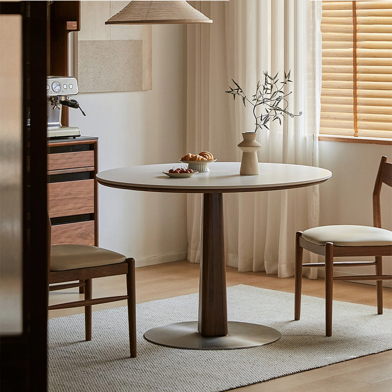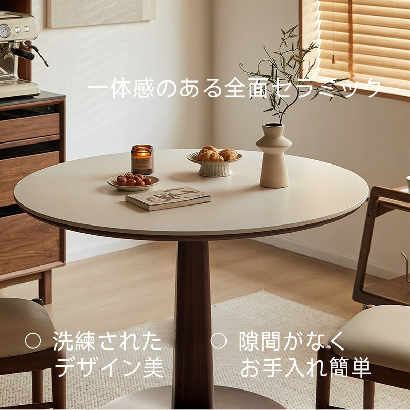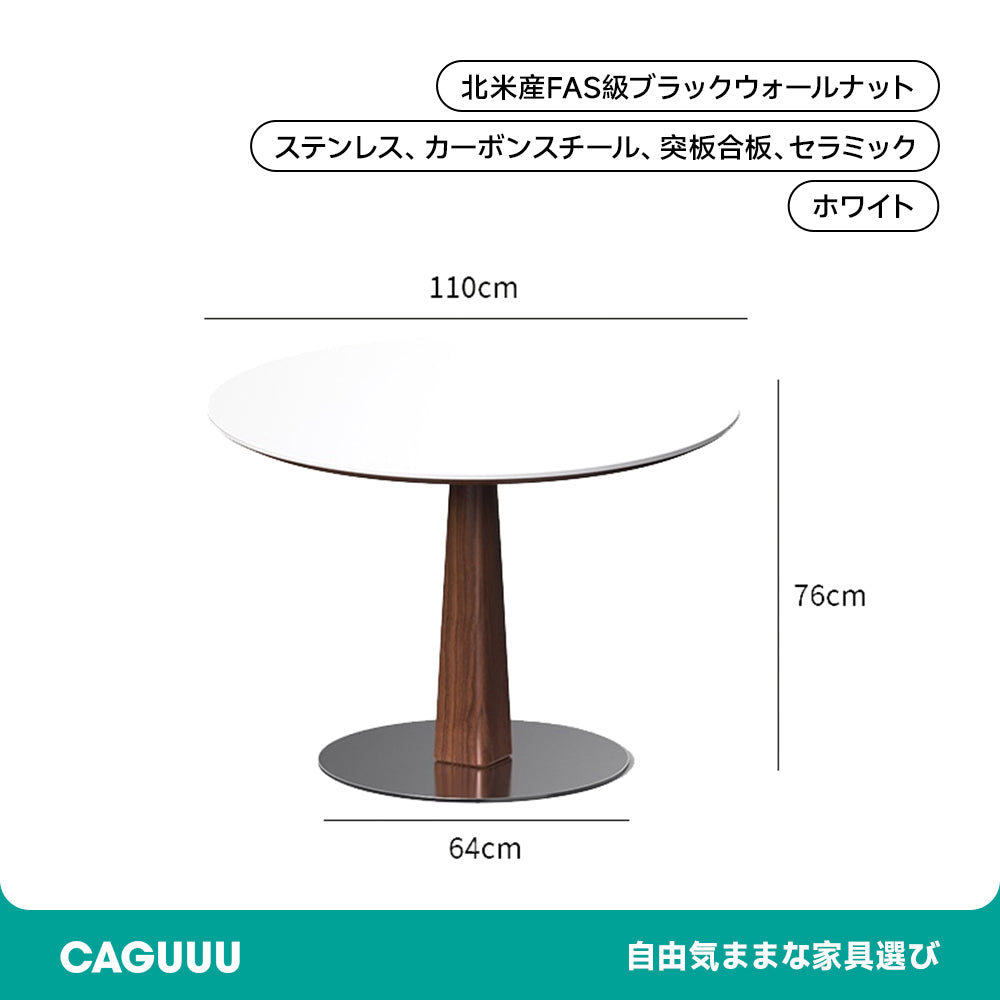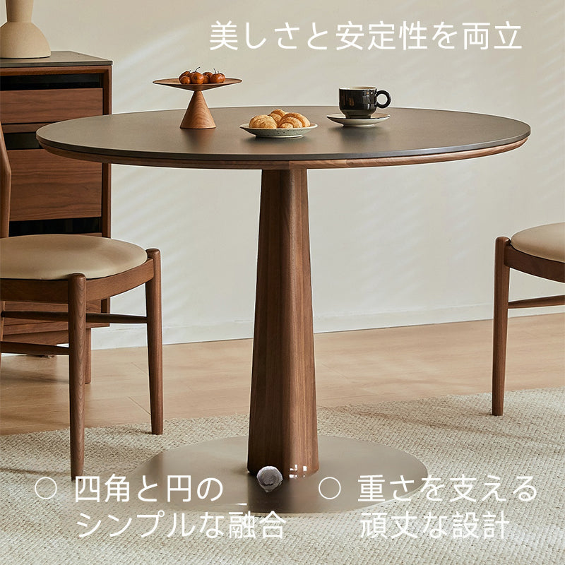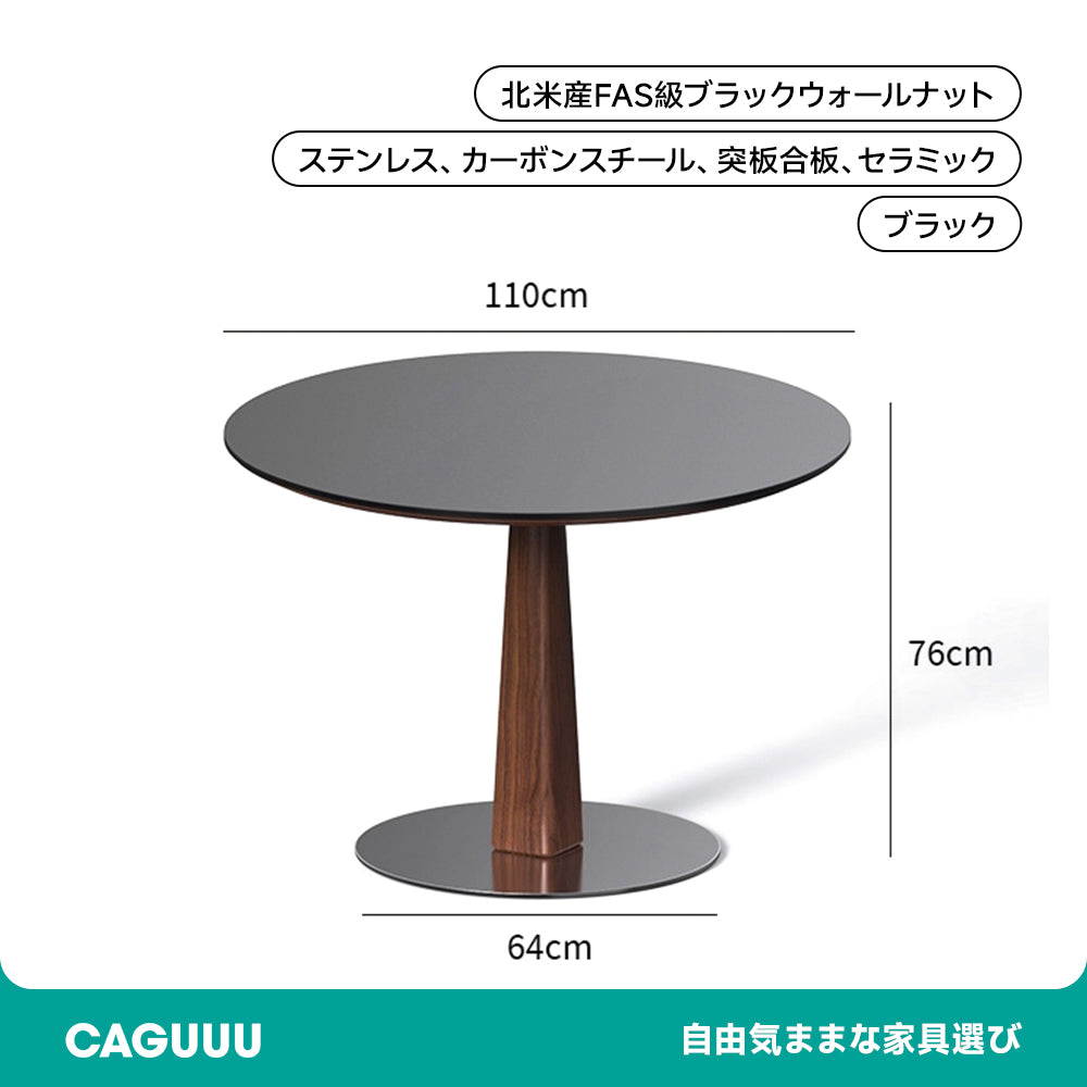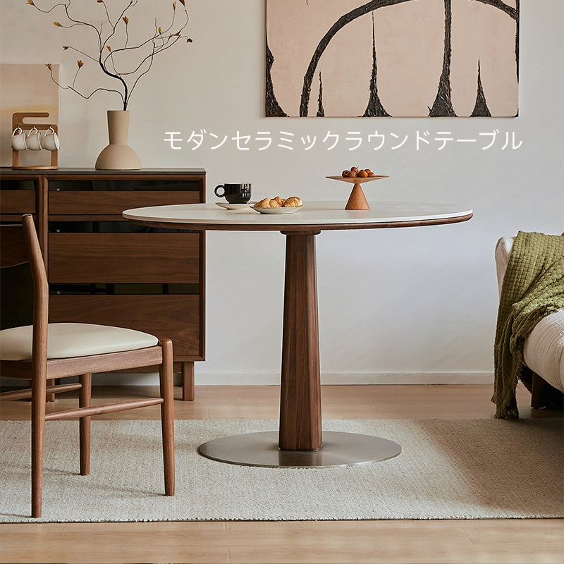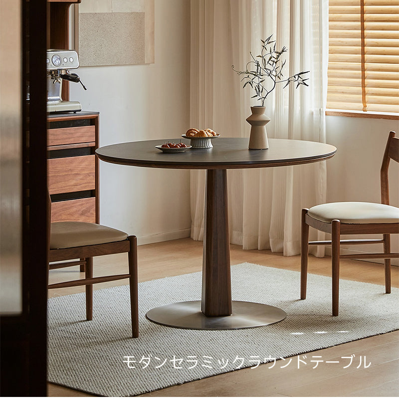 ウォールナット材 モダンセラミックラウンドテーブルは、北米産FAS級ブラックウォールナット材を使用した高品質な家具です。セラミック天板は耐熱性と耐傷性に優れ、日常の使用に最適です。厚さ33mmの二重構造により安定感があり、長期間の使用でも安心です。直径95cmと110cmの2サイズ展開で、どのインテリアにも調和しやすいデザインです。家族や友人との団らんの場として最適で、スタイリッシュな空間を演出します。
