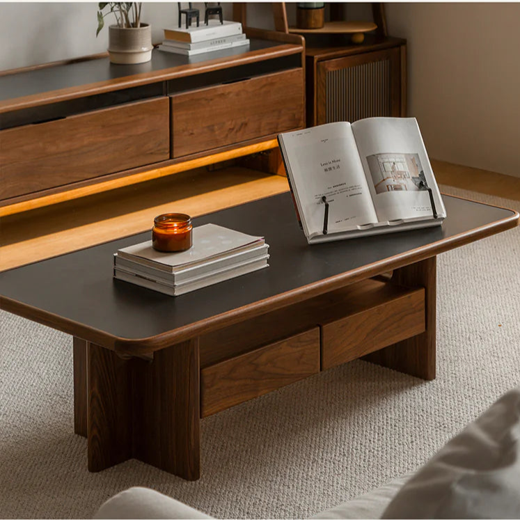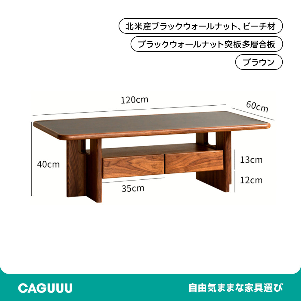 ウォールナット材とセラミック天板を組み合わせた高級感あふれるローテーブル。耐熱性、耐摩耗性、耐久性に優れたセラミック天板は汚れや傷に強く、日常の使用に最適です。北米産ブラックウォールナット材の美しい色合いと光沢が、どんなインテリアにもマッチします。独自のT型脚デザインと3か所の収納スペースで、機能性とデザイン性を兼ね備えたこのテーブルは、リビングの中心にぴったりです。