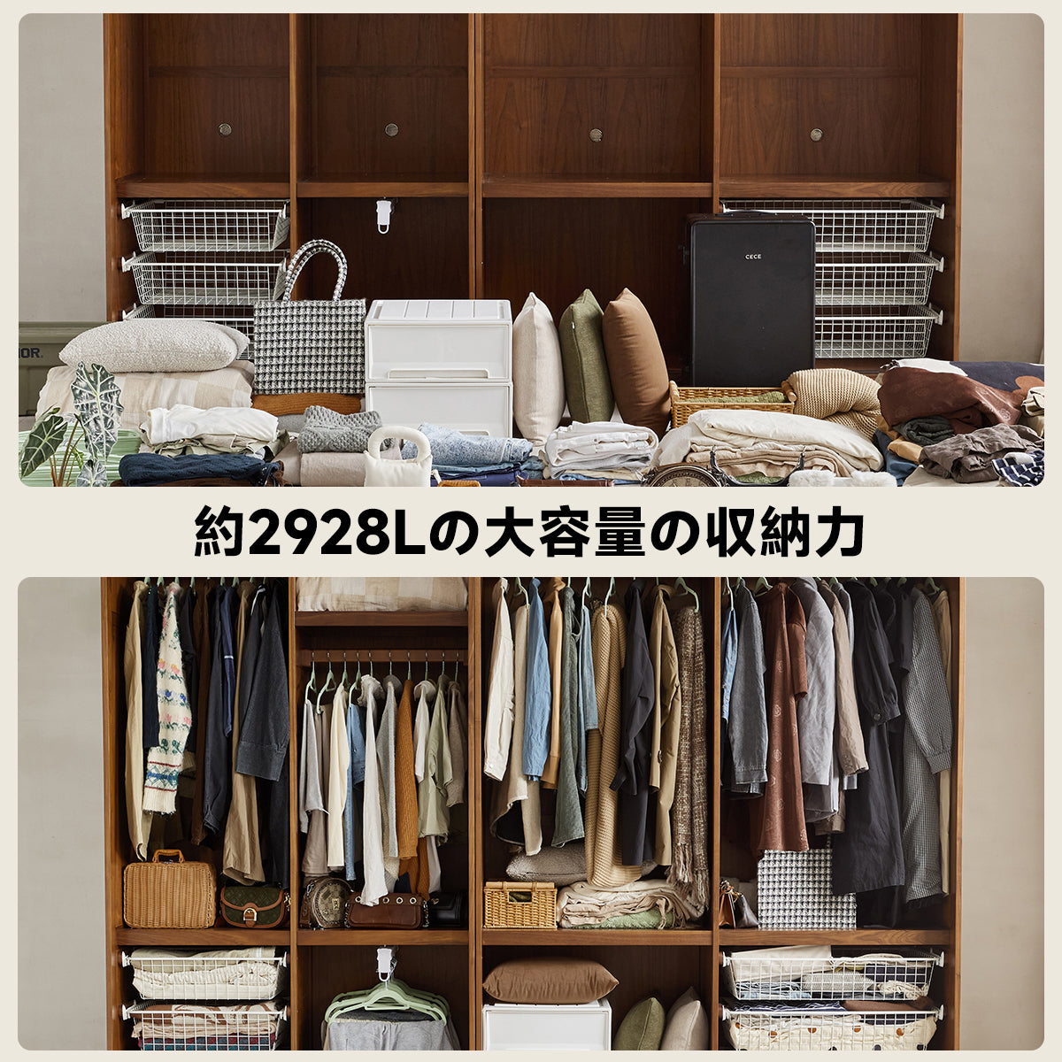 ウォールナット材拡張式大型クローゼットは、北米産FAS級ブラックウォールナット材を使用した高級感溢れるデザインが特徴です。耐久性に優れ、長くお使いいただける安心感があります。AキャビネットとBキャビネットを自由に組み合わせ、大容量の2928Lの収納スペースを実現。環境に優しい水性塗料が使用され、ホルムアルデヒド未検出の安全設計。ブラックガラス扉が衣類をおしゃれに演出し、洗練されたインテリアスタイルを提供します。
