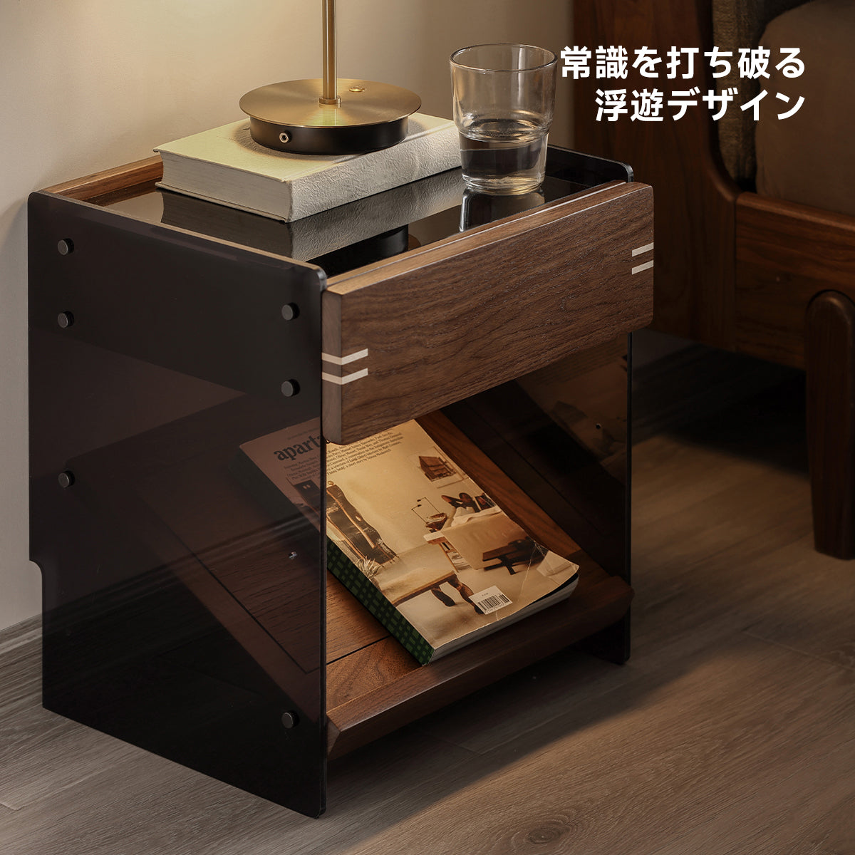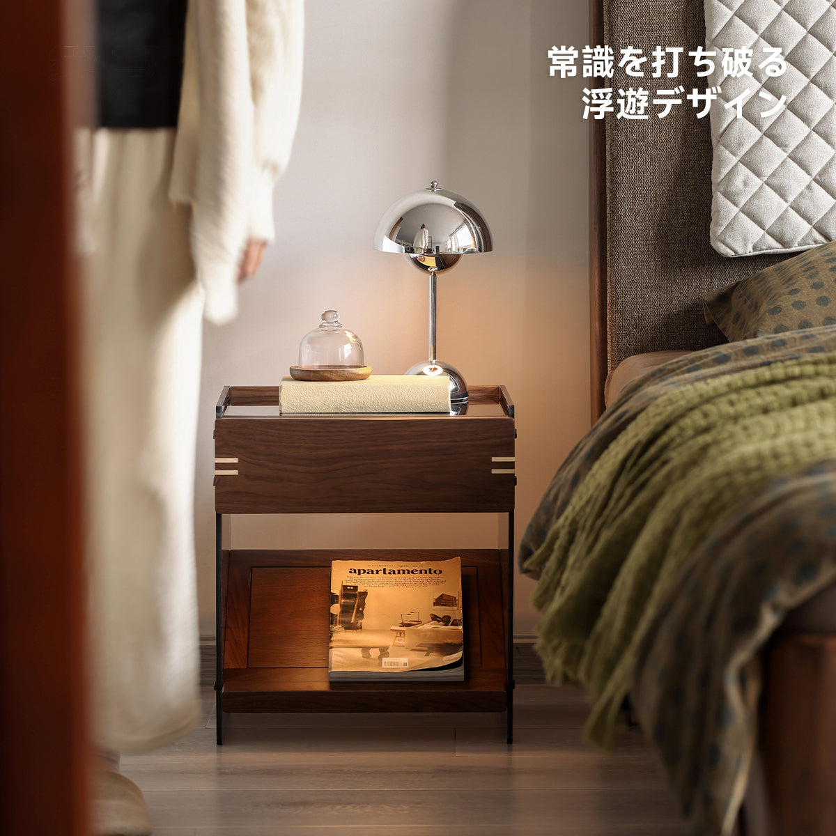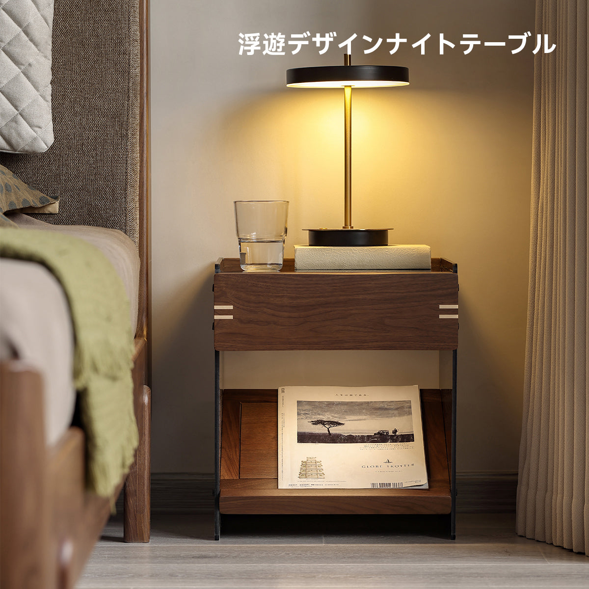 ウォールナット材 浮遊デザインナイトテーブルは、北米産FAS級ブラックウォールナットを使用した高級感あふれるデザインが特徴です。浮遊デザインにより、軽やかで透明感のある印象を与え、掃除がしやすく空間を広く見せます。高品質素材と2種類の収納方式を備え、機能性と美しさを両立。幅37.6cm、奥行34cm、高さ43cmのコンパクトサイズで、どんな寝室にも調和します。ブラック強化ガラスで耐熱性もあり、リビングや書斎でも活躍します。