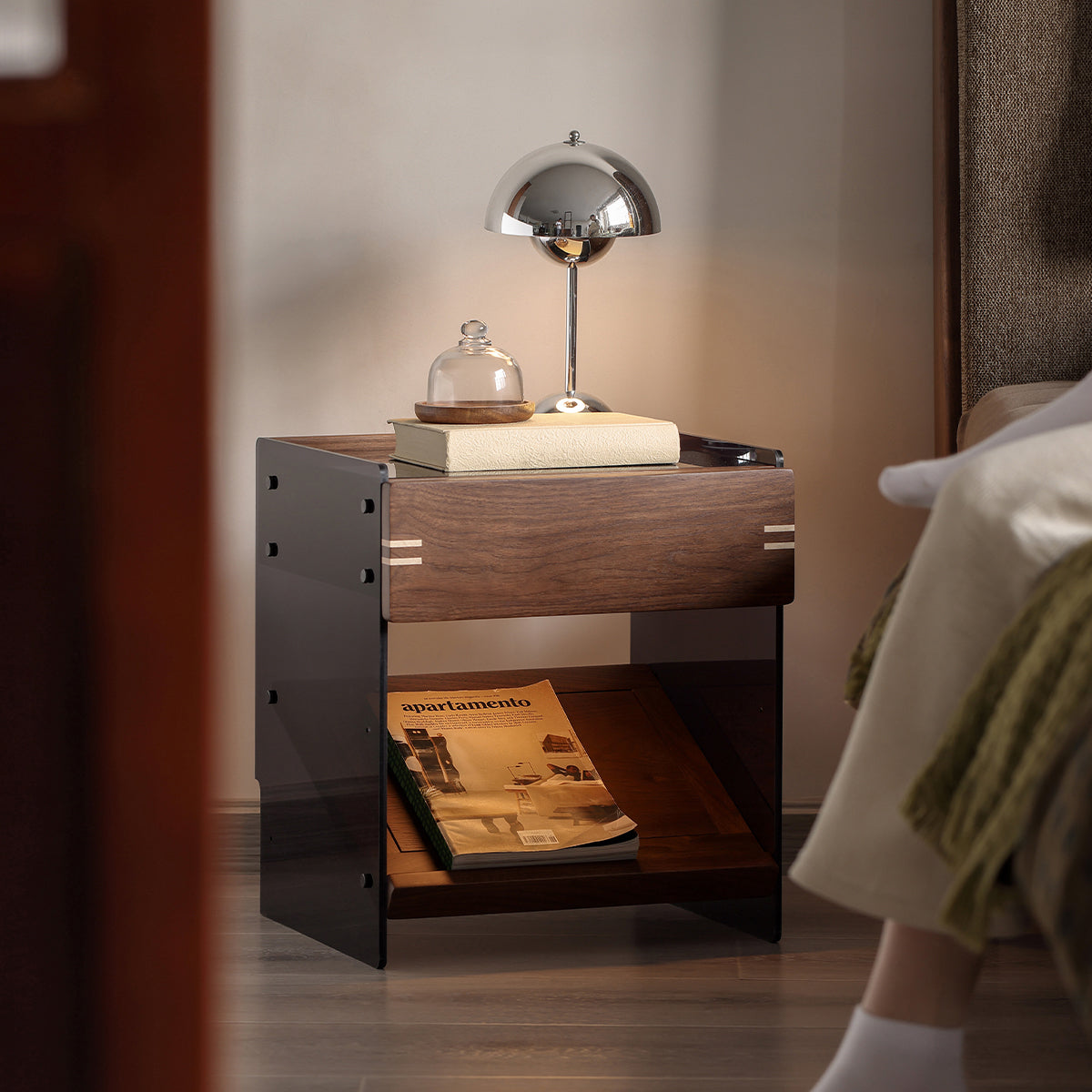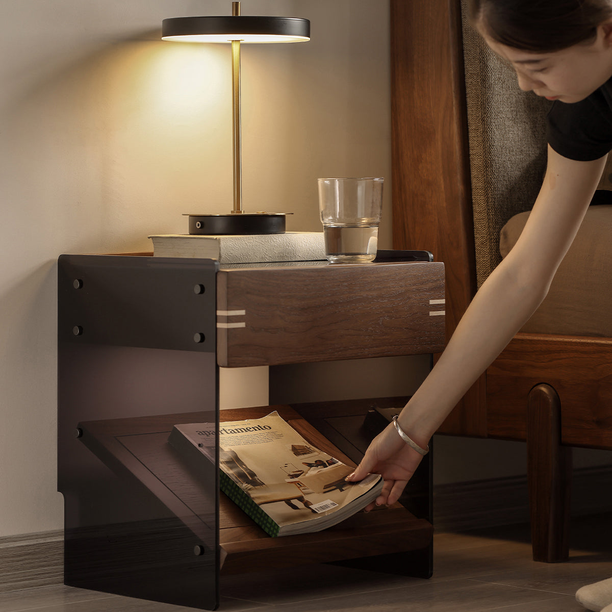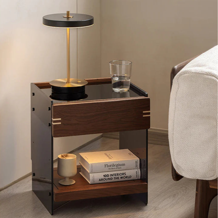 ウォールナット材 浮遊デザインナイトテーブルは、北米産FAS級ブラックウォールナットを使用した高級感あふれるデザインが特徴です。浮遊デザインにより、軽やかで透明感のある印象を与え、掃除がしやすく空間を広く見せます。高品質素材と2種類の収納方式を備え、機能性と美しさを両立。幅37.6cm、奥行34cm、高さ43cmのコンパクトサイズで、どんな寝室にも調和します。ブラック強化ガラスで耐熱性もあり、リビングや書斎でも活躍します。