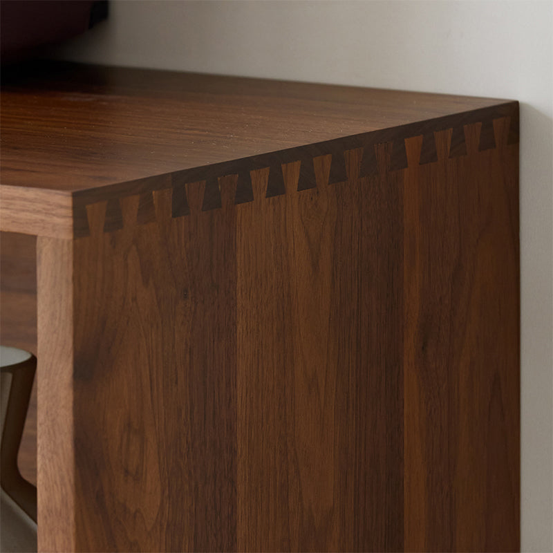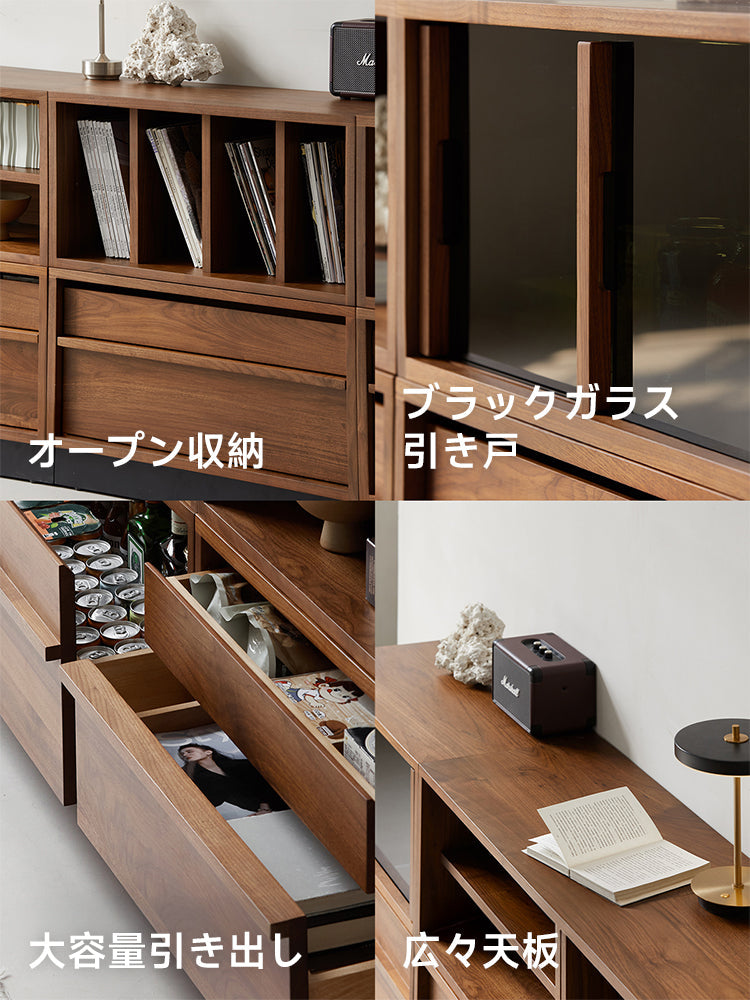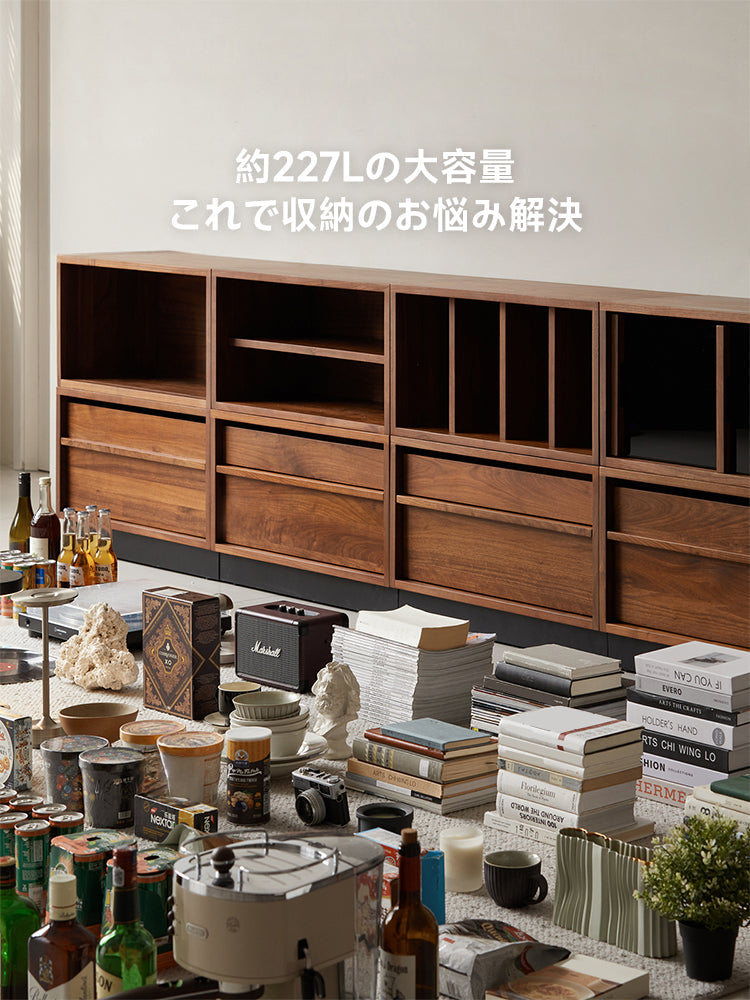 このユニット式木製キャビネットは、北米産の高級ブラックウォールナット材を使用し、FASグレードの美しい木目と深みのある色合いが特徴です。モジュールデザインにより、リビング、ダイニング、寝室など様々な空間にフィットし、オープン収納やブラックガラス引き戸、大容量引き出しで多機能収納を実現。FSC認証とAHEC認証を取得しており、環境にも配慮されています。ほぞ継ぎ工法による安定感と配線スリット、通気口の実用性も兼ね備えた、デザイン性と実用性を両立するキャビネットです。