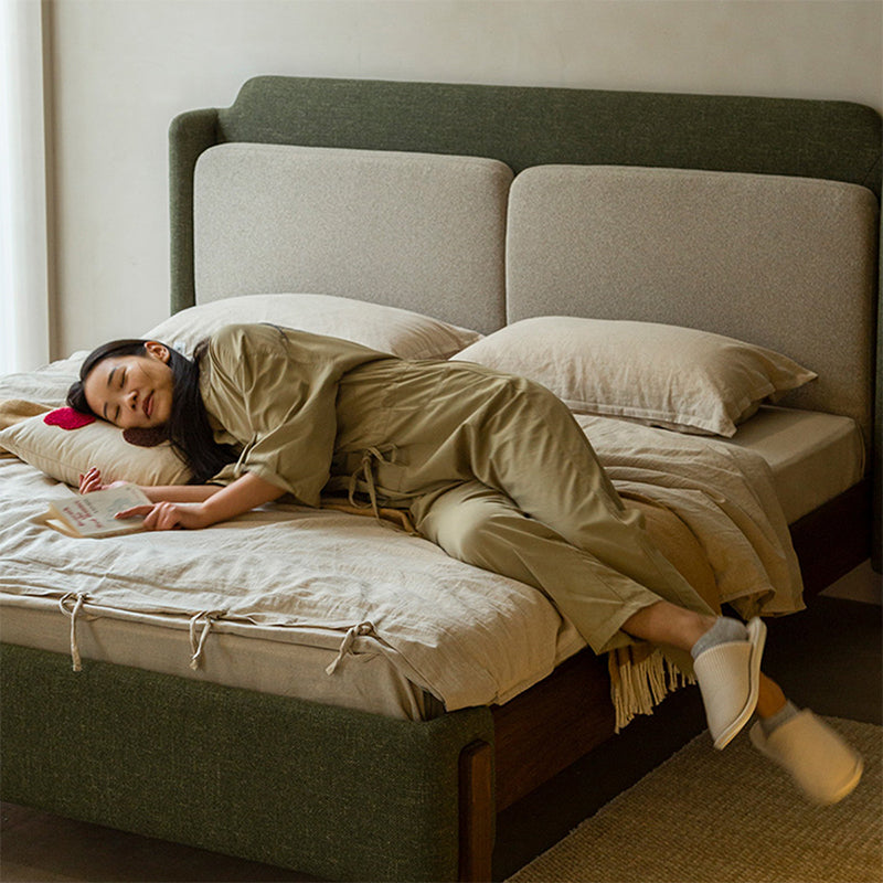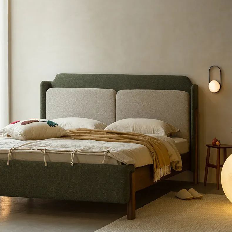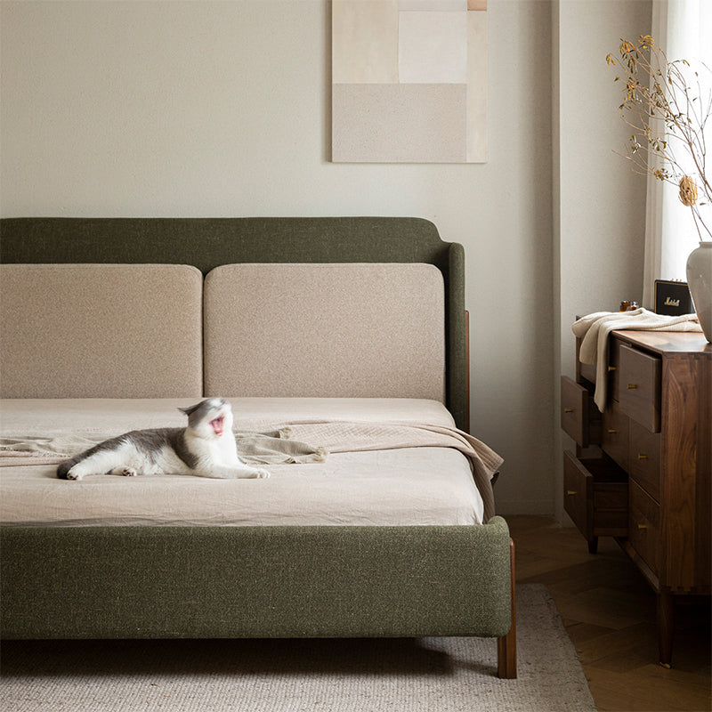 ウォールナット材を使用した天然木リネンベッドは、北米産FAS級ブラックウォールナット材の落ち着いた色合いと光沢が特徴です。高密度ウレタンとシルクコットンを使用したヘッドボードの二重クッションが快適なサポートを提供します。洗練されたデザインと耐久性に優れ、23本のブナ材の支柱が安定した構造を形成。幅150×奥行200cmのワイドダブルサイズと、幅180×奥行200cmのキングサイズが選べ、組み立て式で設置も簡単です。高品質な素材と細部にこだわったデザインで、毎日の生活をより快適にします。