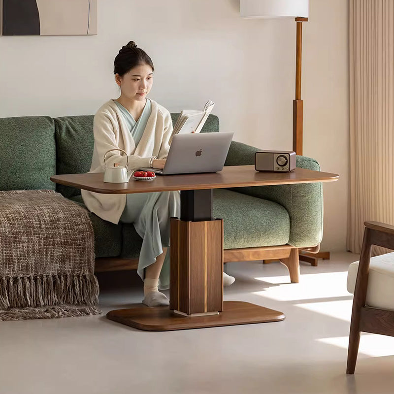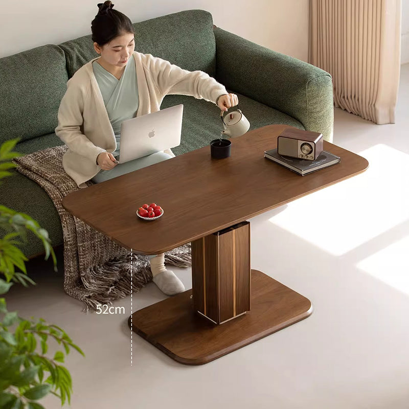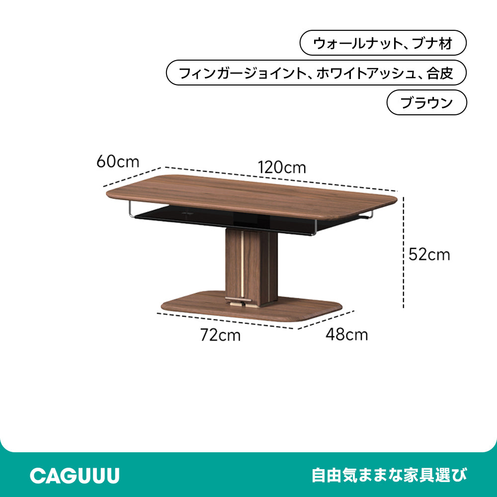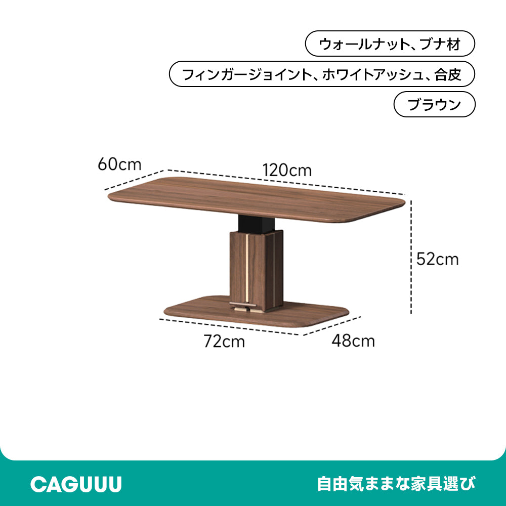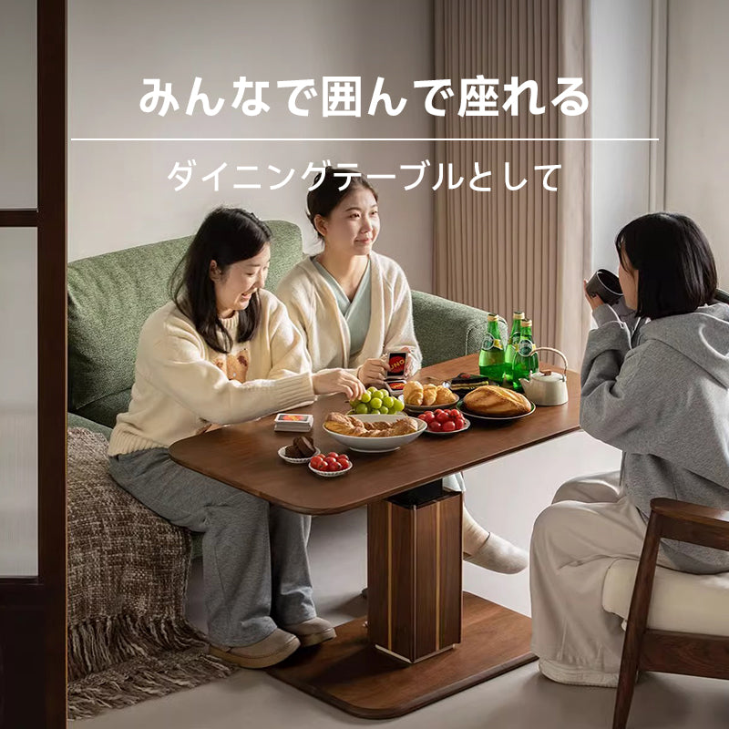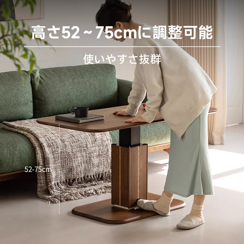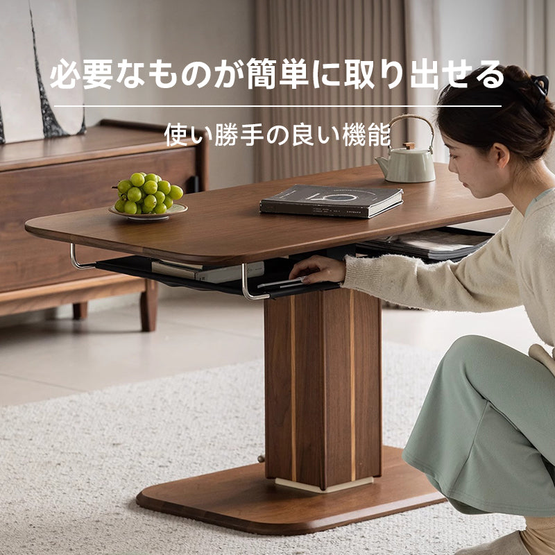 ウォールナット材ヴァーティカル・リフトテーブルは、北米産FAS級ブラックウォールナットを使用した高品質な家具です。高さ調整機能により、リビングやダイニングで多用途に活用可能。フェイクレザーの棚は防汚性と耐水性に優れ、丸みを帯びたデザインがどんなインテリアにもマッチ。広々とした天板と便利な収納スペースで、日常生活をより快適にします。耐荷重は静止時最大80kg、昇降時最大10kgで安定したサポートを提供。