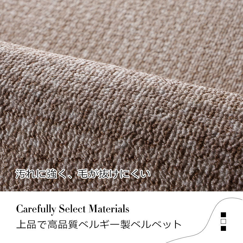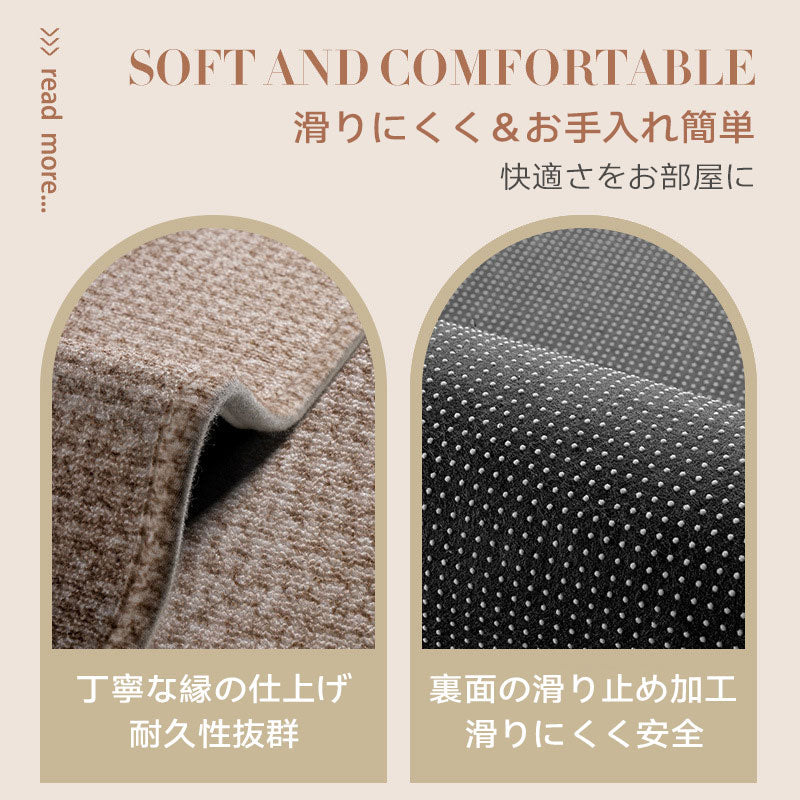 寝室用大判カーペットは、モダンミニマルスタイルを追求したデザインで、どんな空間にも調和します。ベルギー製の高品質なベルベット素材を使用し、柔らかい肌触りが特徴です。高密度ループパイルで耐久性が高く、滑り止め加工も施されています。お手入れが簡単で、シンプルで洗練されたデザインが魅力です。寝室やリビングルームに最適で、快適な生活空間を提供します。