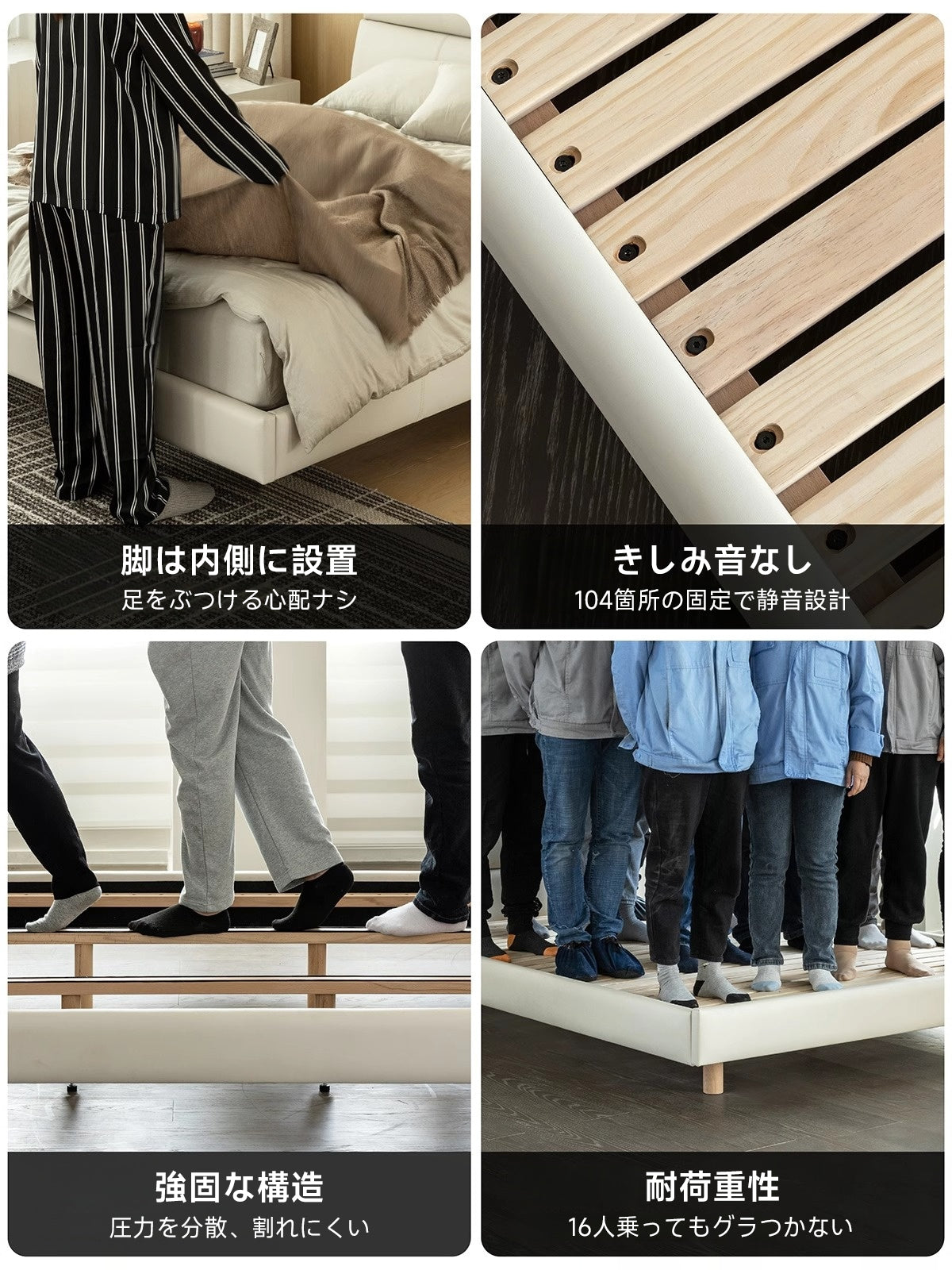 合成皮革クラシックベッドは、耐久性のある素材と高級感あるデザインが特徴のベッドです。ホワイトカラーでどんなインテリアにもマッチし、寝室をスタイリッシュに演出します。パイン材とFASグレード合板を使用したフレームは強度と安定性を兼ね備え、ヘッドボードには高反発ウレタンを使用しています。通気性に優れたすのこ板と耐荷重性により、快適な睡眠環境を提供します。クイーンとキングの2サイズ展開で、組立サービスも提供されており、購入後すぐに使用可能です。