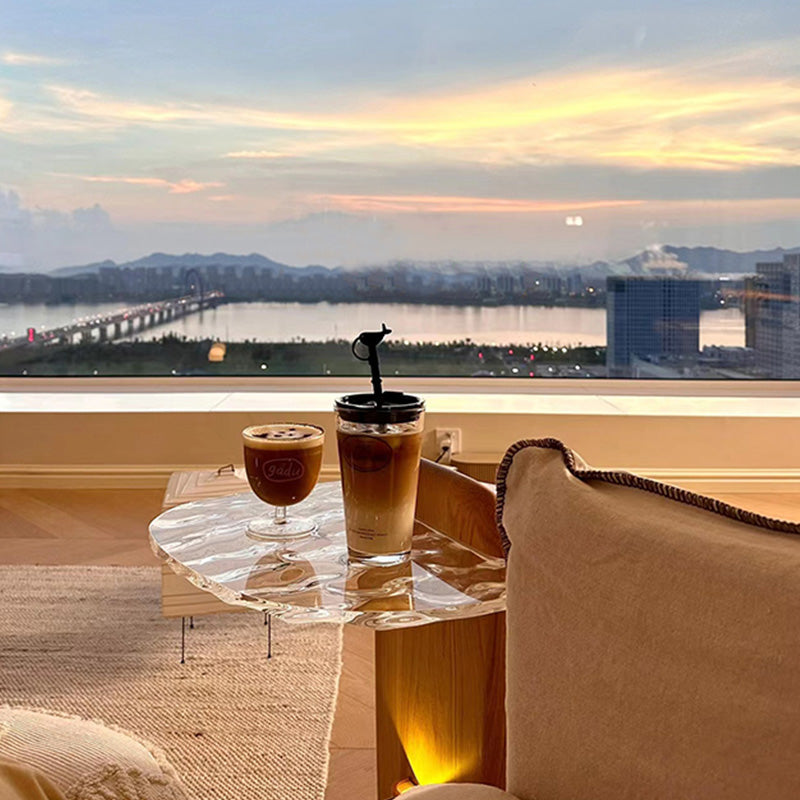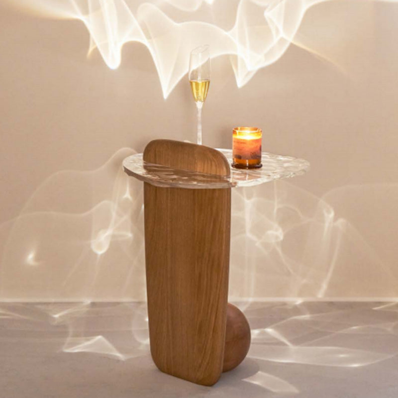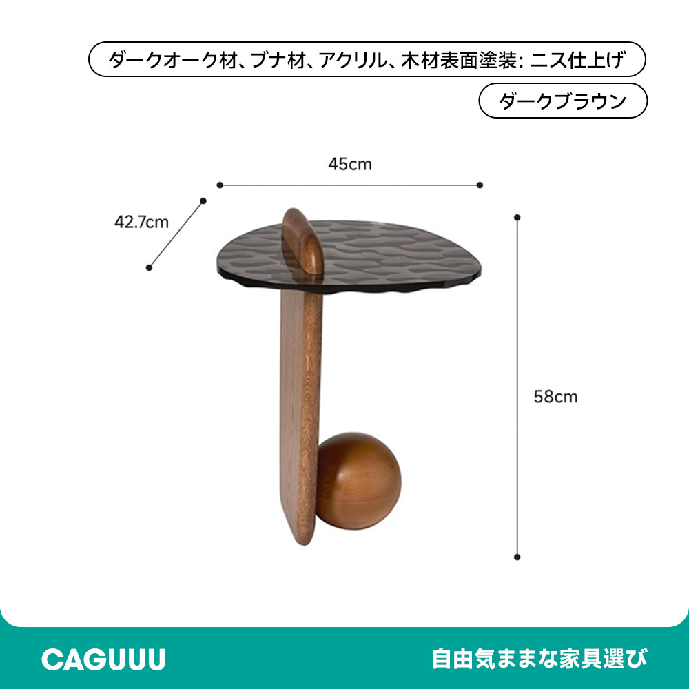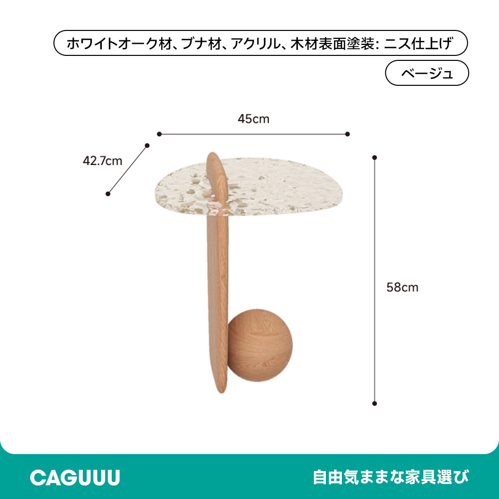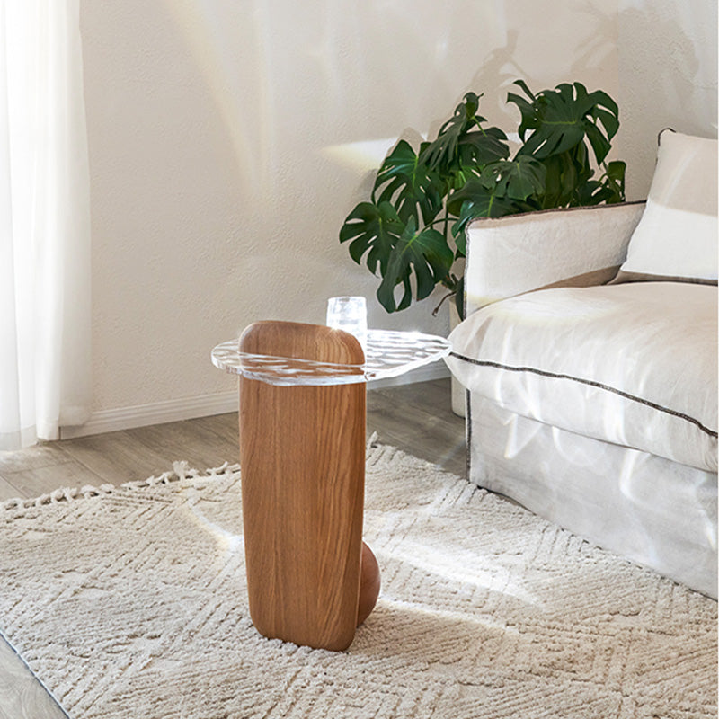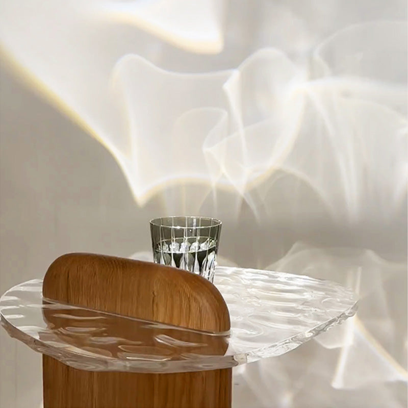 波ガラスサイドテーブルは、自然の美しさをインスピレーションにしたデザインが特徴の家具です。透明度の高い樹脂ガラスの天板は波模様が施され、光を受けて美しい反射を生み出します。これにより、部屋全体が海辺にいるかのようなリラックスした雰囲気に包まれます。軽量で耐衝撃性に優れた樹脂ガラスと高級感のあるホワイトオークとブナ材の脚部を使用し、耐久性と美しさを兼ね備えています。コンパクトで移動も簡単、リビングやベッドサイド、書斎など多様なシーンで活躍します。