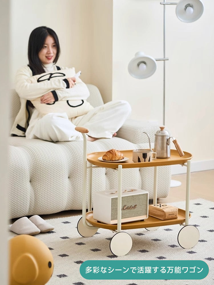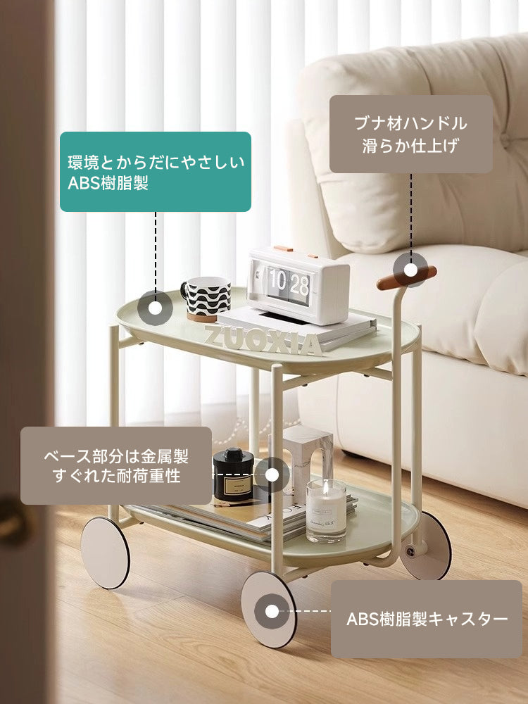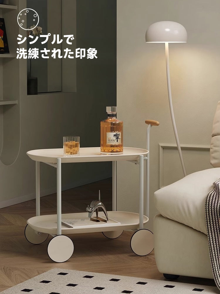 シンプルオーバルワゴンは、現代のインテリアに調和する洗練されたデザインが特徴です。ABS樹脂製の天板と金属製のベースにより、耐久性と安定性を兼ね備えています。滑らかなブナ材のハンドルと大きなキャスターで移動も簡単。リビングやダイニングでの使用に最適で、収納家具としても活躍。一人暮らしやカップル、ファミリー向けにおすすめの多用途ワゴンです。