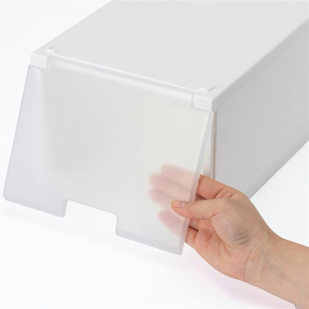 片方は半透明のフタ、もう片方は白いフタなので、前後を入れ替えれば隠す収納に早変わり!