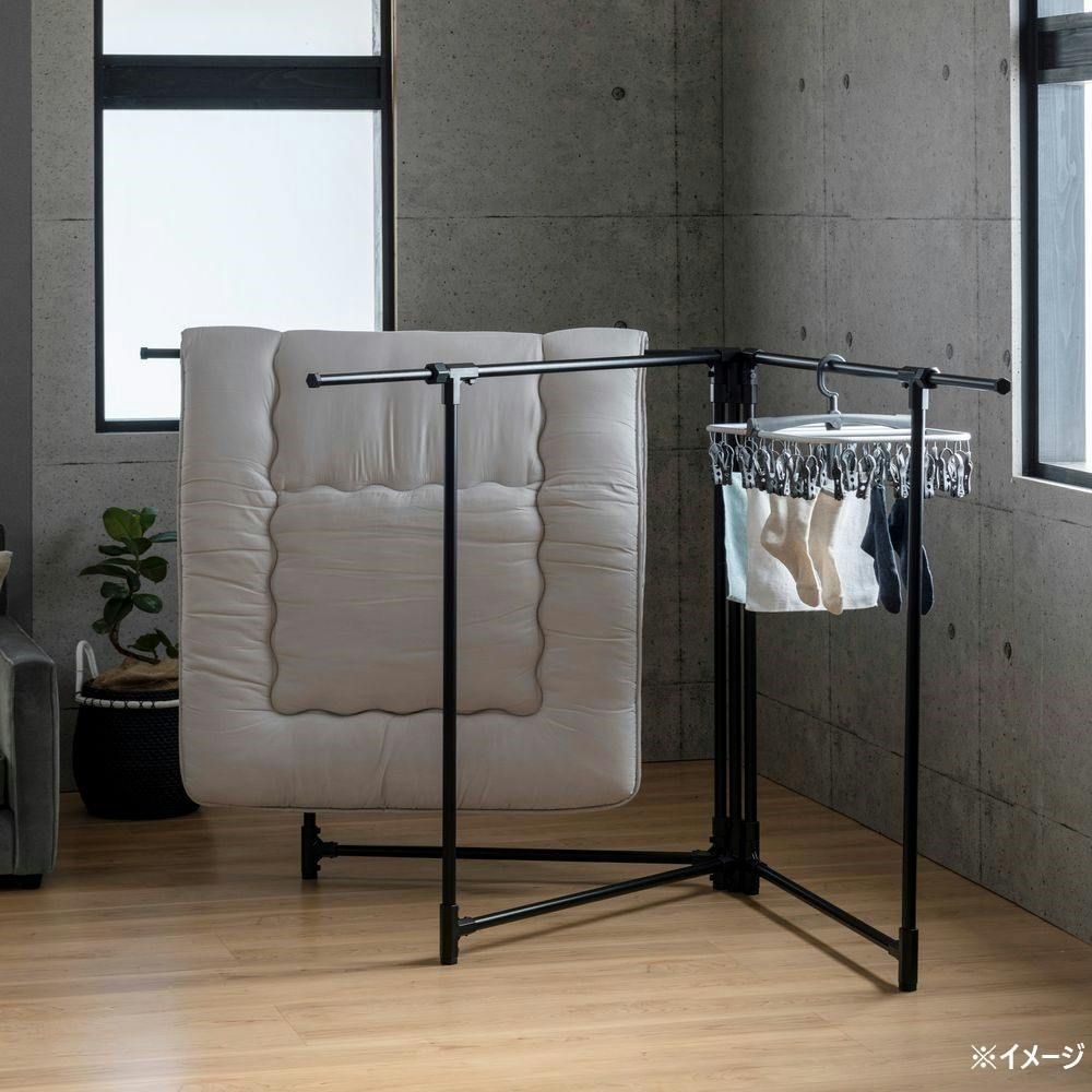 インテリアになじむデザイン。ベランダでも使える耐久性。伸縮アーム付きで小物も干せる。布団を持ち上げずに干せる。折りたためて収納に便利。厚さ:約13cm。