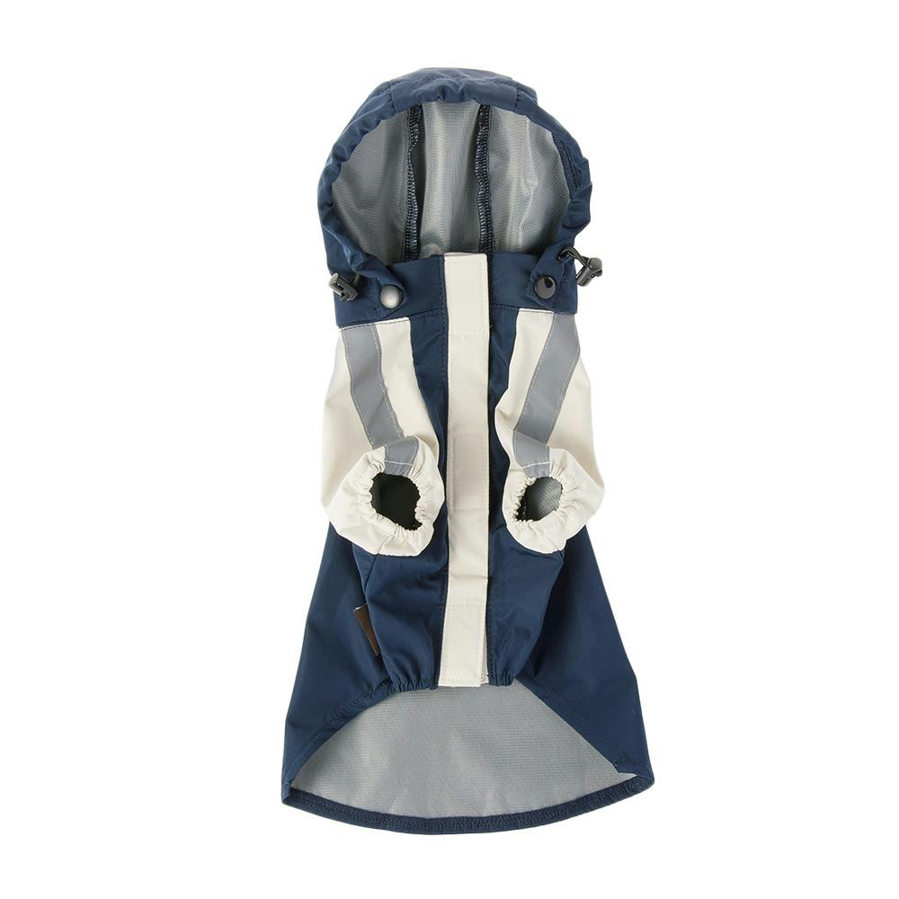 袖付きで前足からお腹周りまでをカバーするウェアタイプ。フード分の着脱可能。前足部分に反射テープ付き。耐水性10,000mm以上。収納用バック付属