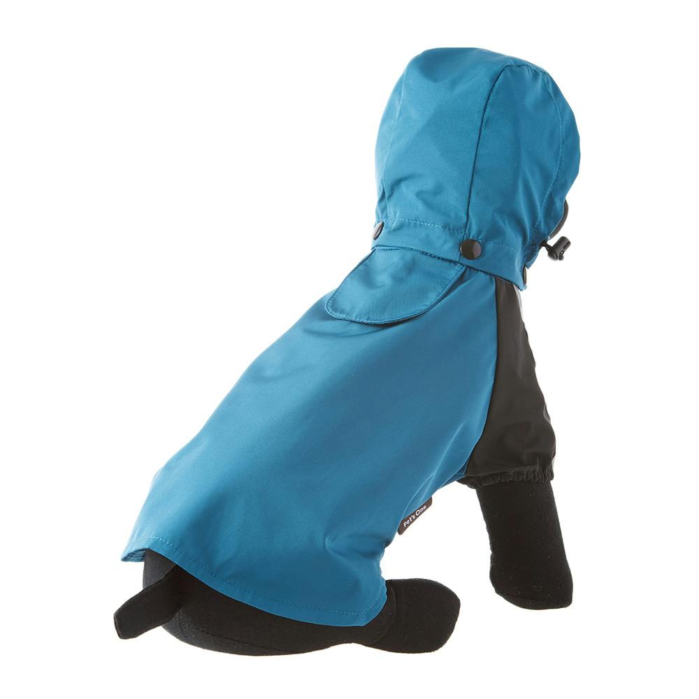 袖付きで前足からお腹周りまでをカバーするウェアタイプ。フード分の着脱可能。前足部分に反射テープ付き。耐水性10,000mm以上。収納用バック付属