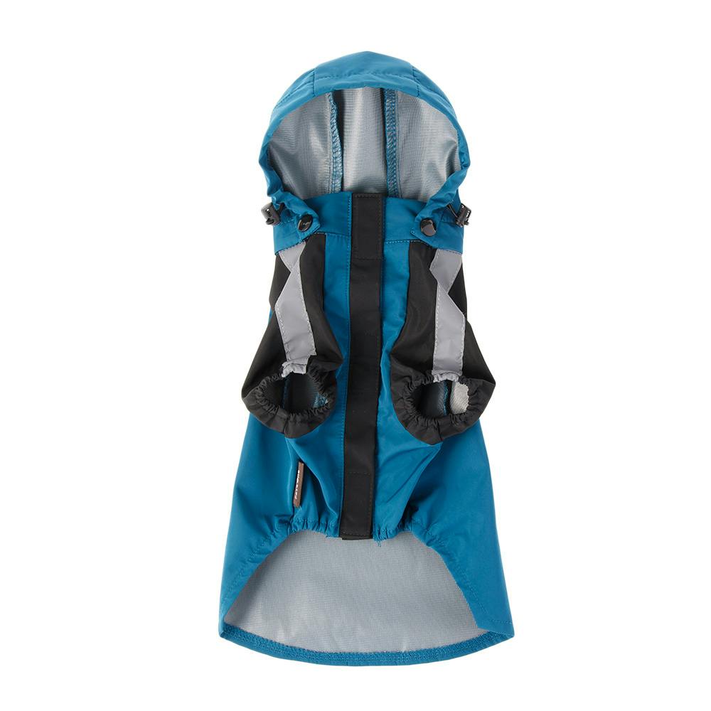 袖付きで前足からお腹周りまでをカバーするウェアタイプ。フード分の着脱可能。前足部分に反射テープ付き。耐水性10,000mm以上。収納用バック付属