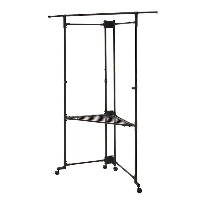 デッドスペースになりがちな部屋の角に設置でき、衣類などを収納できるハンガーラックです。伸縮式の竿でロング丈も掛けられます。たためるので収納にも便利です。