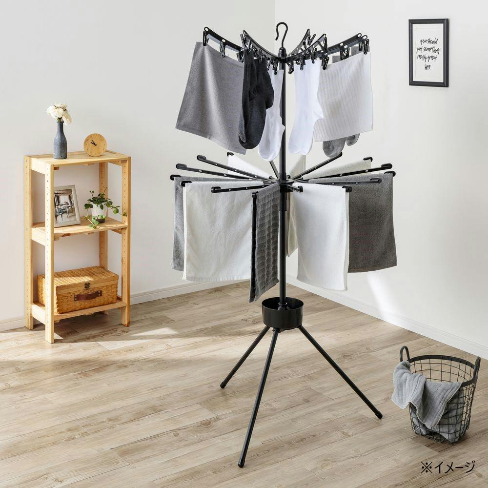 はずして使える ピンチハンガーつき パラソル型室内物干し ブラック