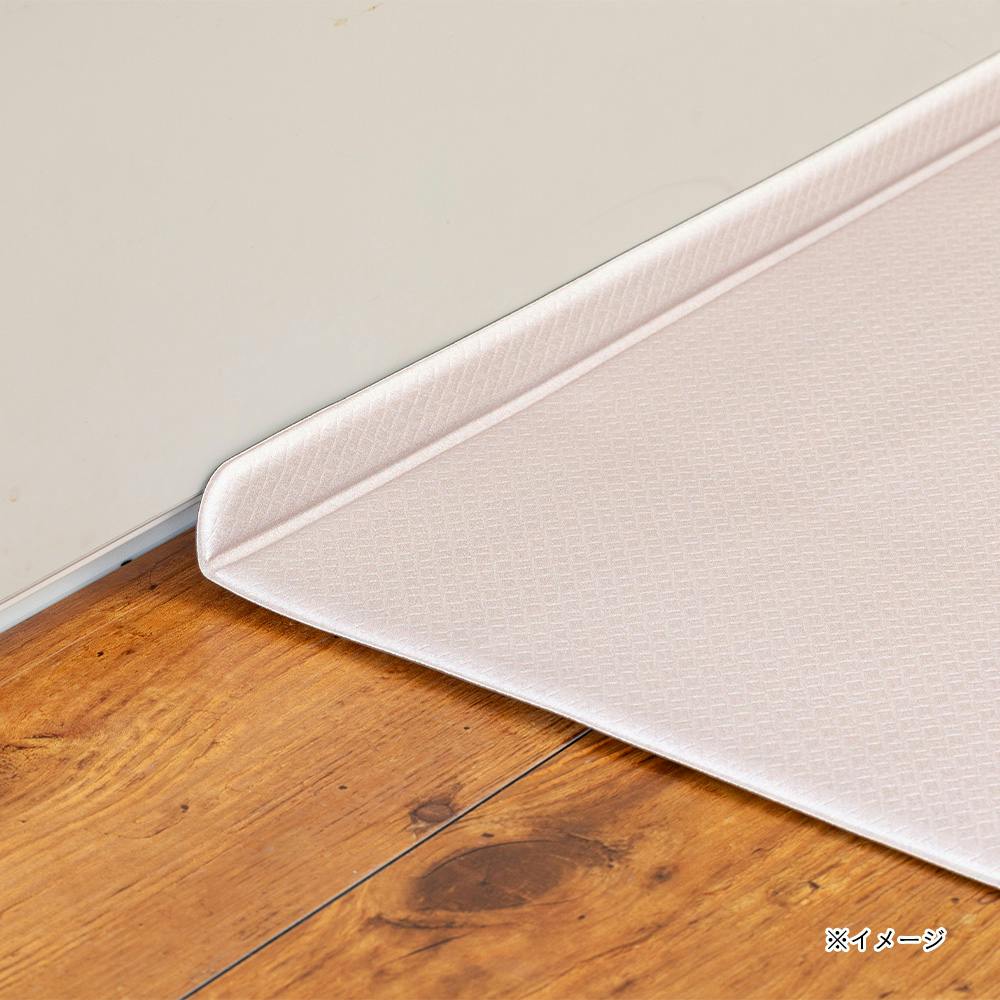 L字の折り目がキッチンと床の隙間にぴったりフィットし、ごみが溜まりにくい。抗菌、防炎、防カビ、厚み6mmのクッション性、水や汚れもサッと拭くだけお手入れ簡単