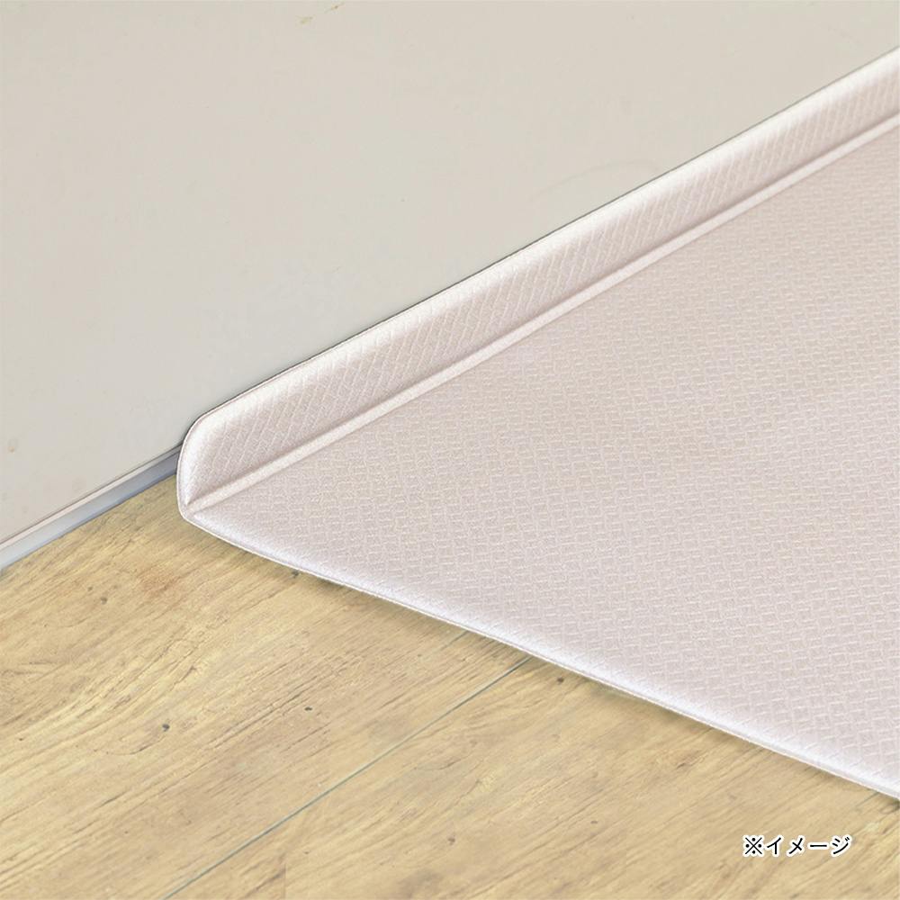 L字の折り目がキッチンと床の隙間にぴったりフィットし、ごみが溜まりにくい。抗菌、防炎、防カビ、厚み6mmのクッション性、水や汚れもサッと拭くだけお手入れ簡単