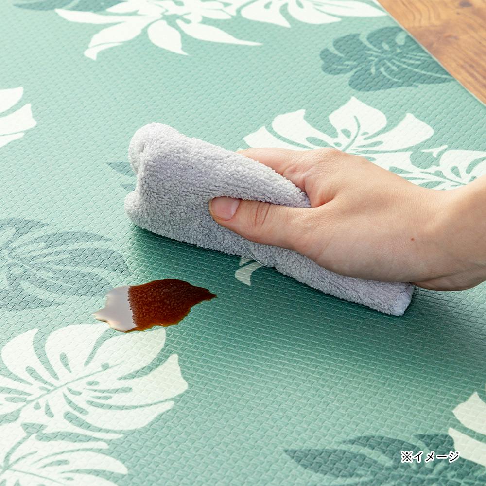 L字の折り目がキッチンと床の隙間にぴったりフィットし、ごみが溜まりにくい。抗菌、防炎、防カビ、厚み6mmのクッション性、水や汚れもサッと拭くだけお手入れ簡単