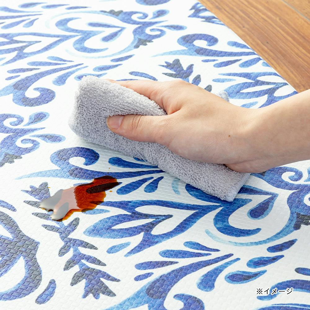 L字の折り目がキッチンと床の隙間にぴったりフィットし、ごみが溜まりにくい。抗菌、防炎、防カビ、厚み6mmのクッション性、水や汚れもサッと拭くだけお手入れ簡単