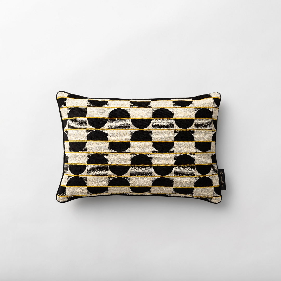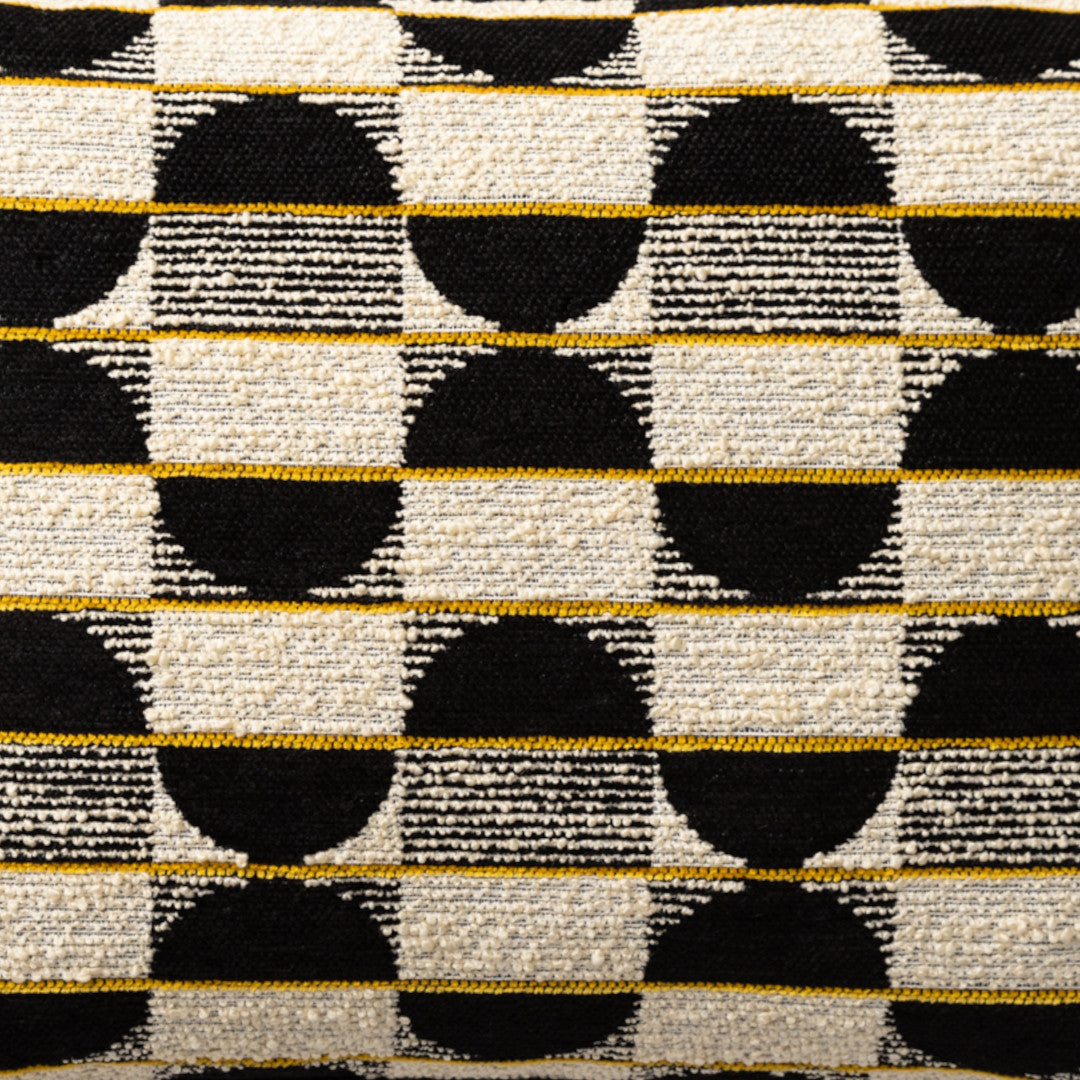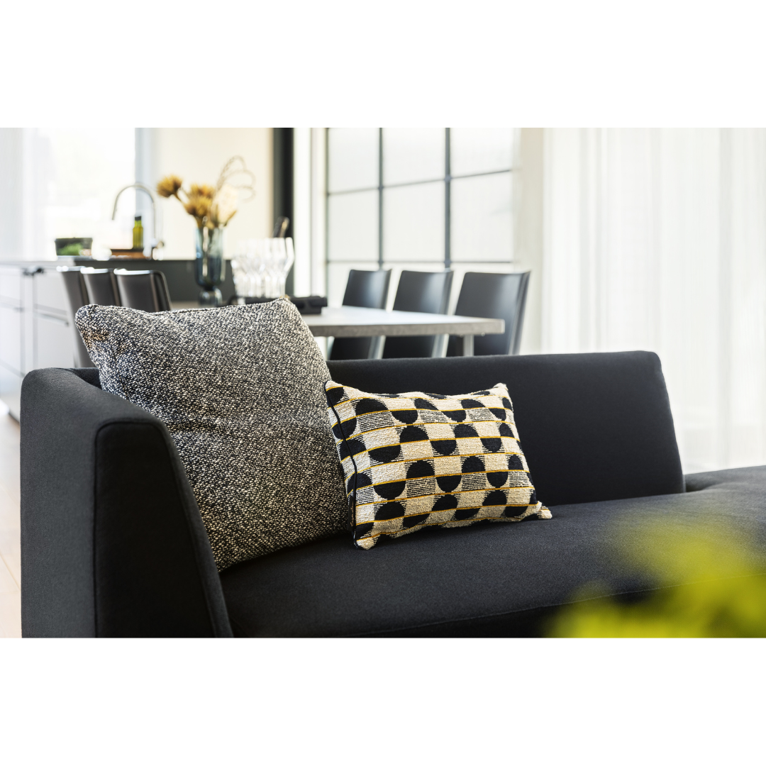 ブラックとベージュのジオメトリック柄に、イエローのラインが魅力的なデザイン。素材感を感じるテクスチャ―と、ボリュームたっぷりな質感がしっかりと存在感を感じさせながら、45cm×30cmと小ぶりなので、アクセントとして圧迫感なく使いやすいサイズ感です。※こちらの商品は中材が別売りの商品です。カバーと一緒に中材をご購入頂く場合には、お得なセット価格でご提供しております。スモールフェザー100%のクッションはへたりにくく、長く快適にお使いいただけます。ぜひこの機会にご検討ください。