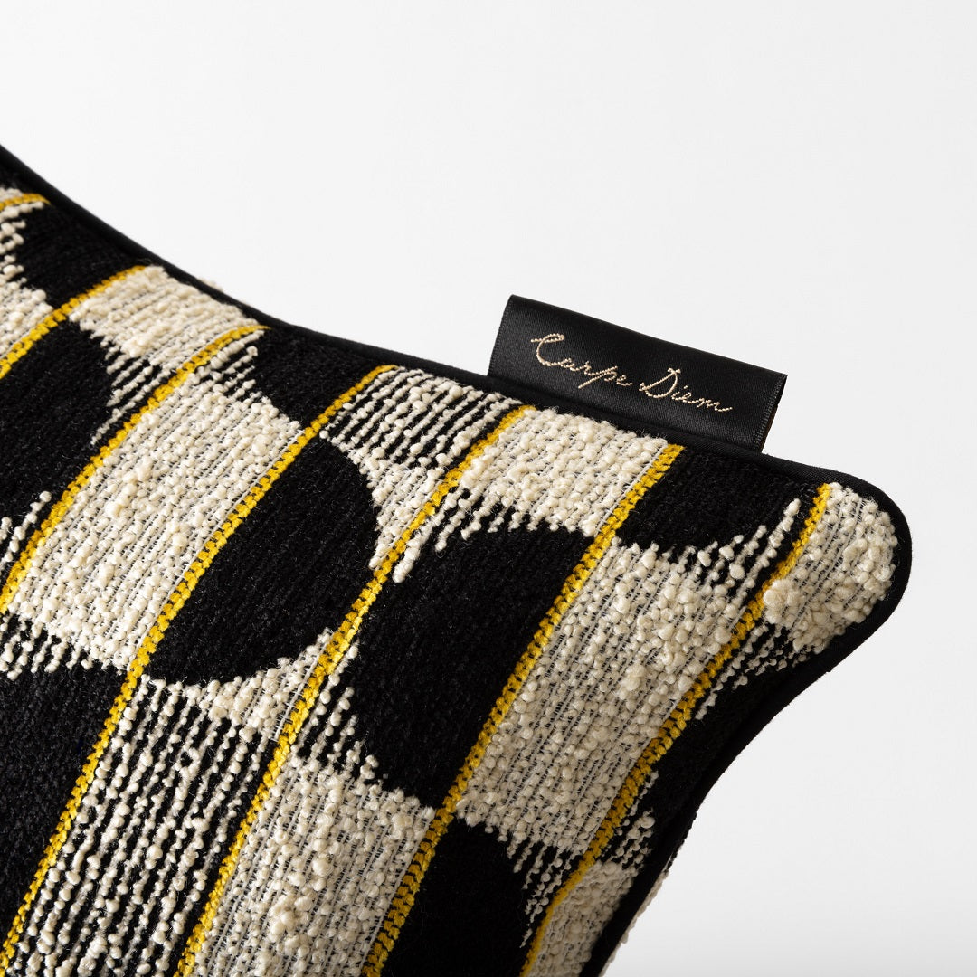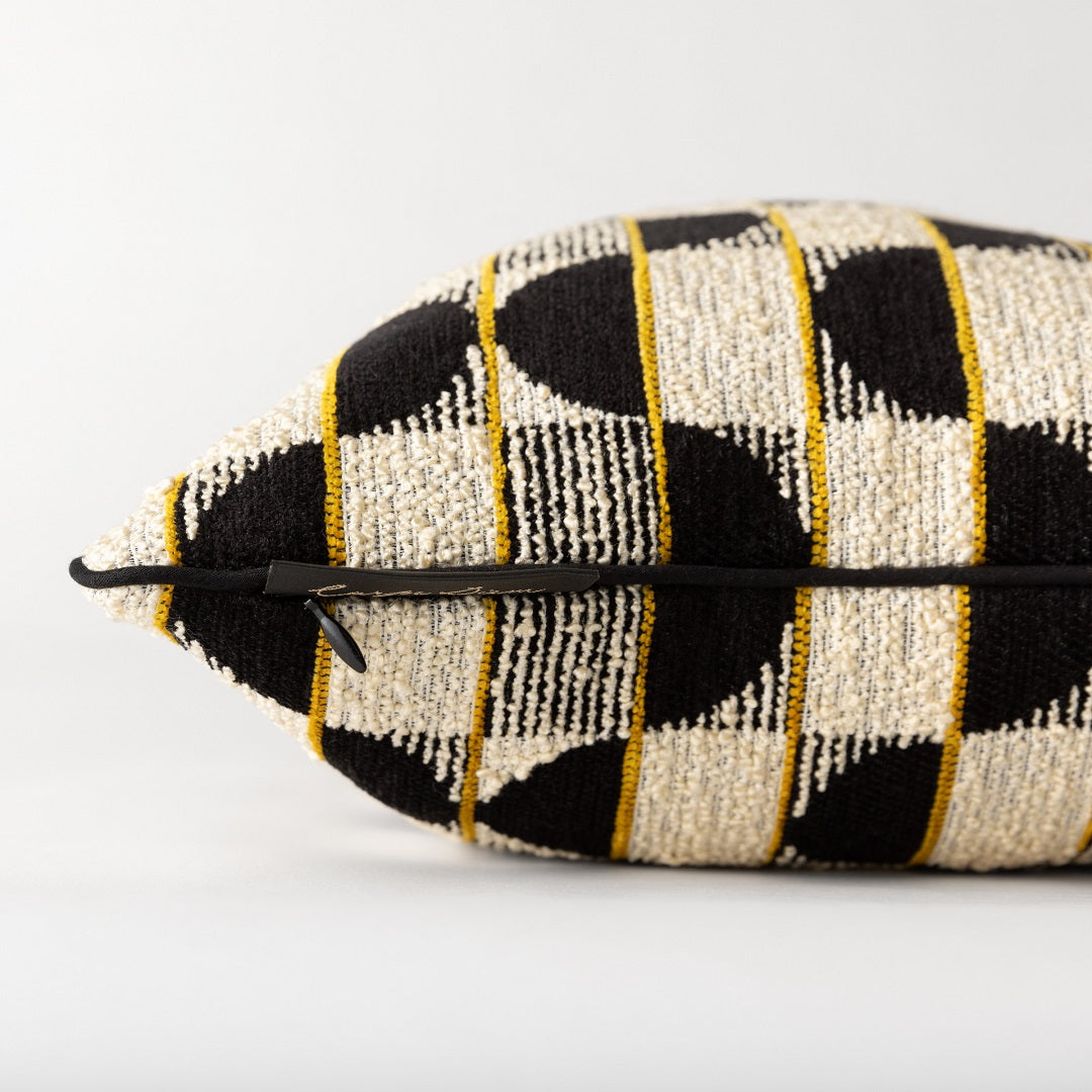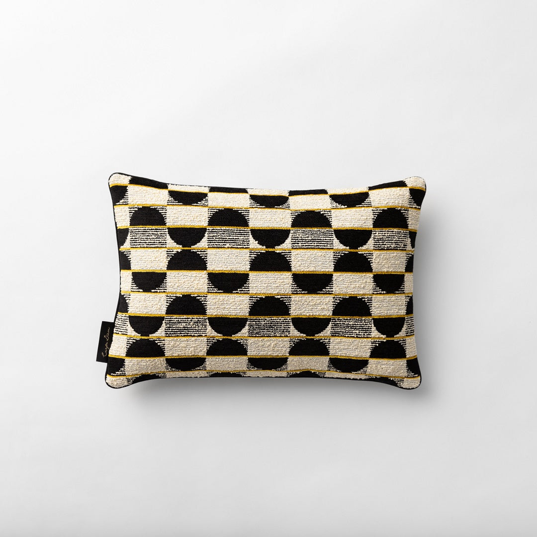 ブラックとベージュのジオメトリック柄に、イエローのラインが魅力的なデザイン。素材感を感じるテクスチャ―と、ボリュームたっぷりな質感がしっかりと存在感を感じさせながら、45cm×30cmと小ぶりなので、アクセントとして圧迫感なく使いやすいサイズ感です。※こちらの商品は中材が別売りの商品です。カバーと一緒に中材をご購入頂く場合には、お得なセット価格でご提供しております。スモールフェザー100%のクッションはへたりにくく、長く快適にお使いいただけます。ぜひこの機会にご検討ください。