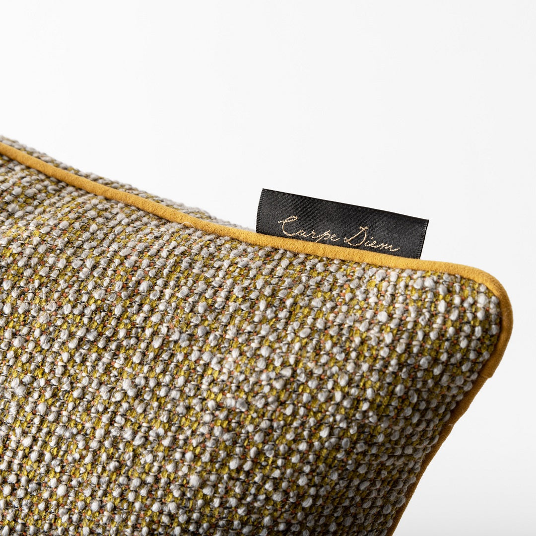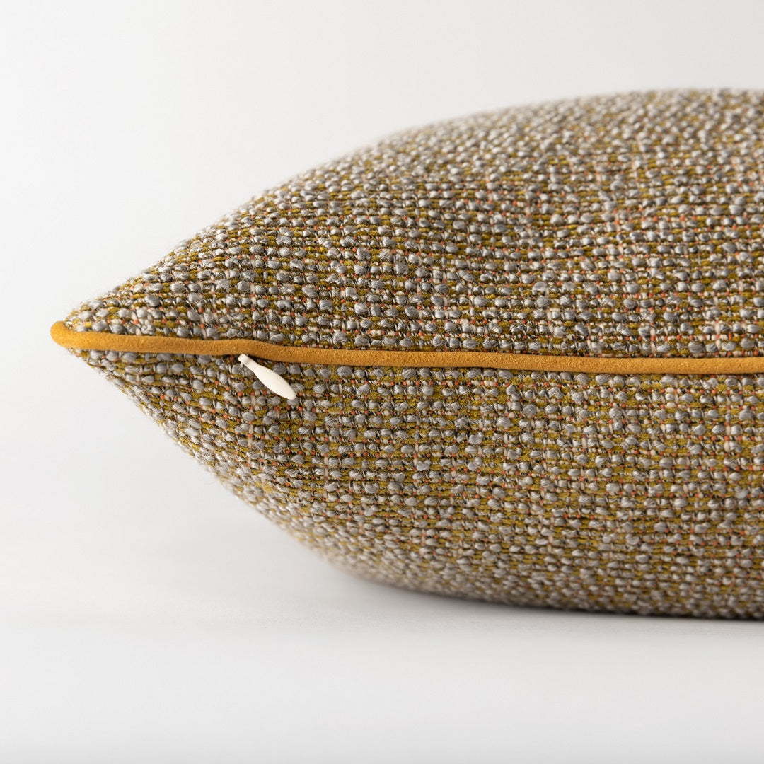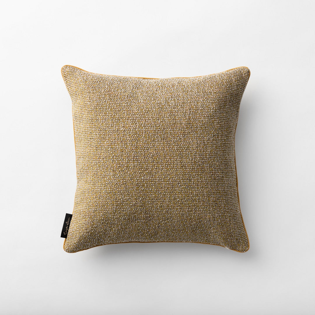 色や太さの異なる糸を織り合わせた、あたたかみのある豊かな表情がポイントです。マスタード色のパイピングが輪郭を引き締め、シンプルながらも存在感のあるデザインに仕上げました。ゆったりとした午後のティータイムを一緒に過ごしたい、いつもそばに置いておきたくなるクッションです。※こちらの商品は中材が別売りの商品です。カバーと一緒に中材をご購入頂く場合には、お得なセット価格でご提供しております。スモールフェザー100%のクッションはへたりにくく、長く快適にお使いいただけます。ぜひこの機会にご検討ください。
