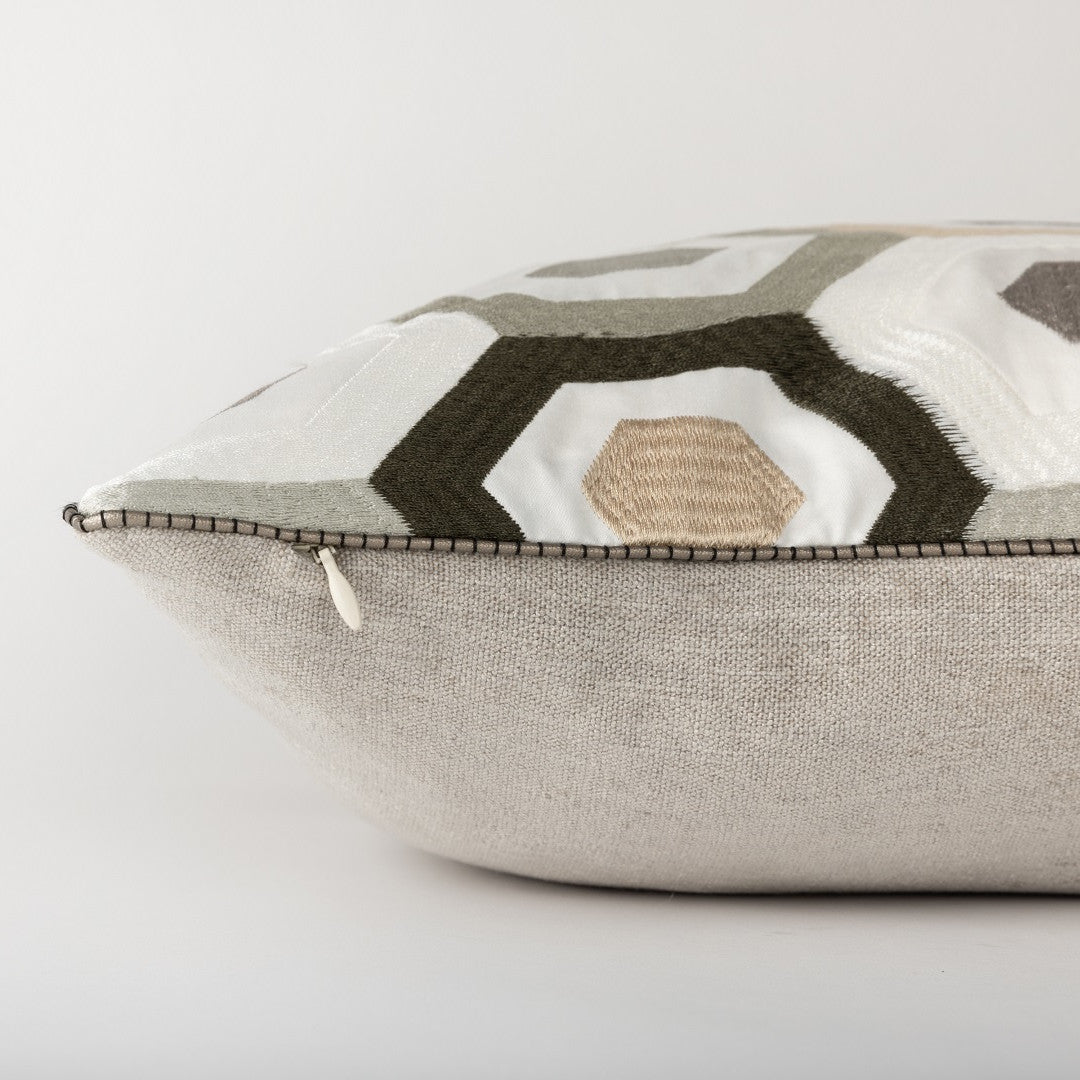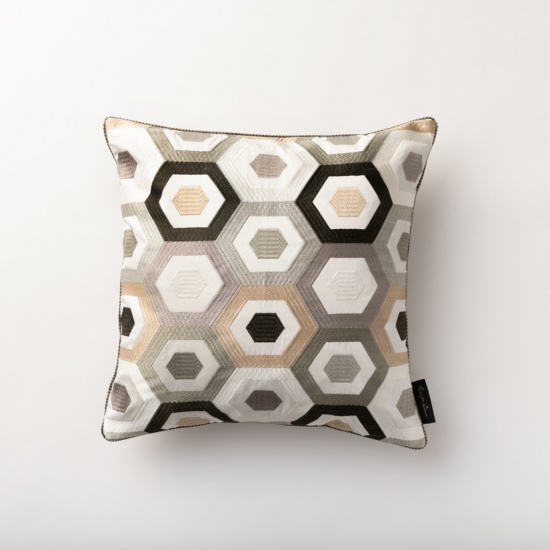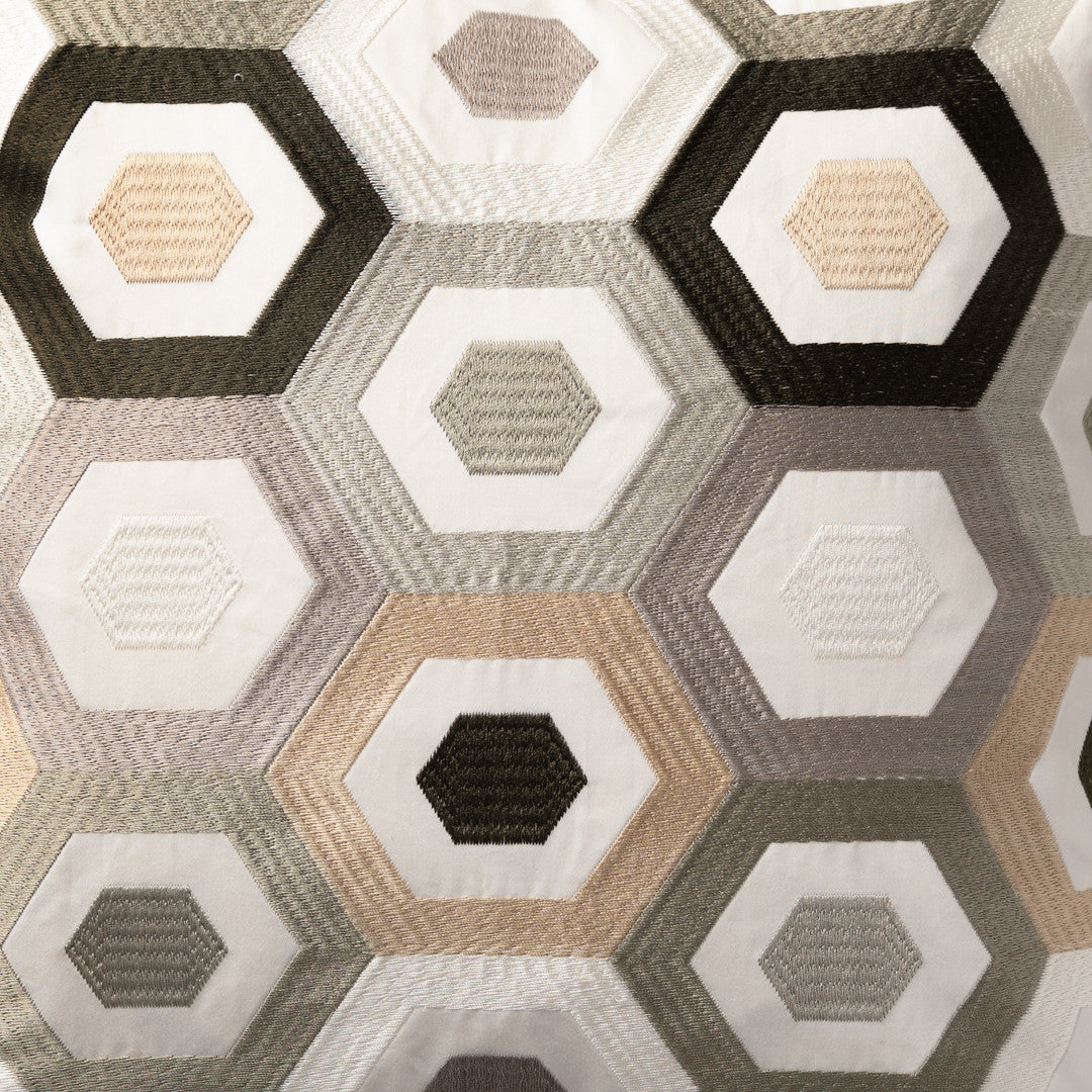 レトロでヴィンテージ感のある六角形の幾何学的なデザインが全面にサテン刺繍された生地に、重厚感のあるフルボディの柔らかいシェニール生地を合わせました。モダンでシックなお部屋からナチュラルなお部屋まで、幅広いコーディネートに上質さをプラスしてくれます。※こちらの商品は中材が別売りの商品です。カバーと一緒に中材をご購入頂く場合には、お得なセット価格でご提供しております。スモールフェザー100%のクッションはへたりにくく、長く快適にお使いいただけます。ぜひこの機会にご検討ください。