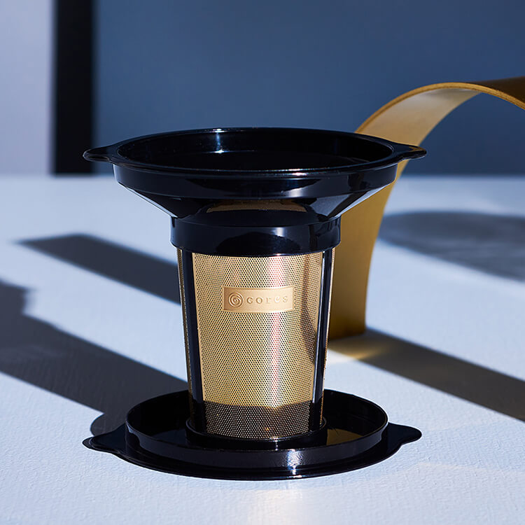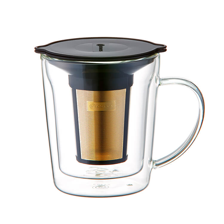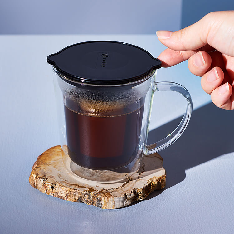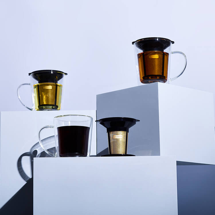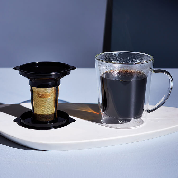 味と香りに影響の少ない純金メッシュのフィルターと、カップは熱い飲み物が冷めにくいダブルウォールのガラスマグ。「ステンレス製のマグは金属臭が気になる」という方にもおすすめです。プレス器やドリッパー等の抽出器具を必要としないので、一人でも手軽に「淹れたて」を楽しむことができます。コーヒーだけでなく中国茶、紅茶、ハーブティーも手軽に楽しめます。冷たい飲み物を入れた時にはマグが結露しないので快適です。