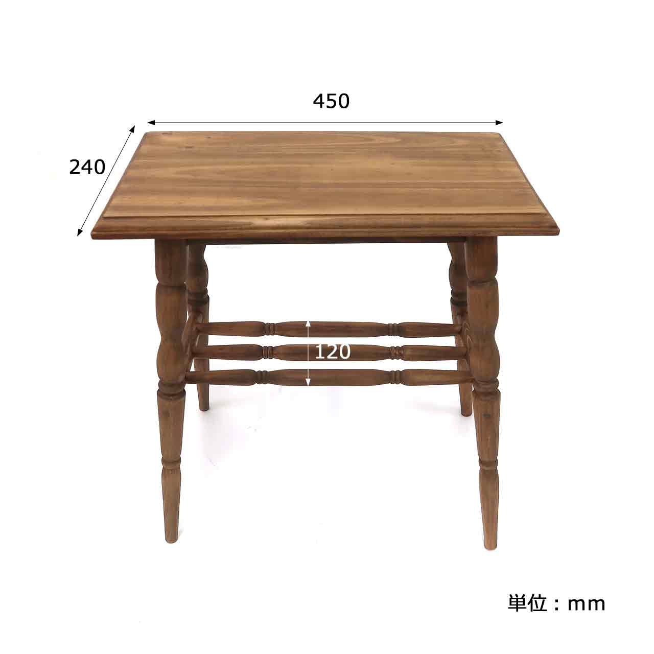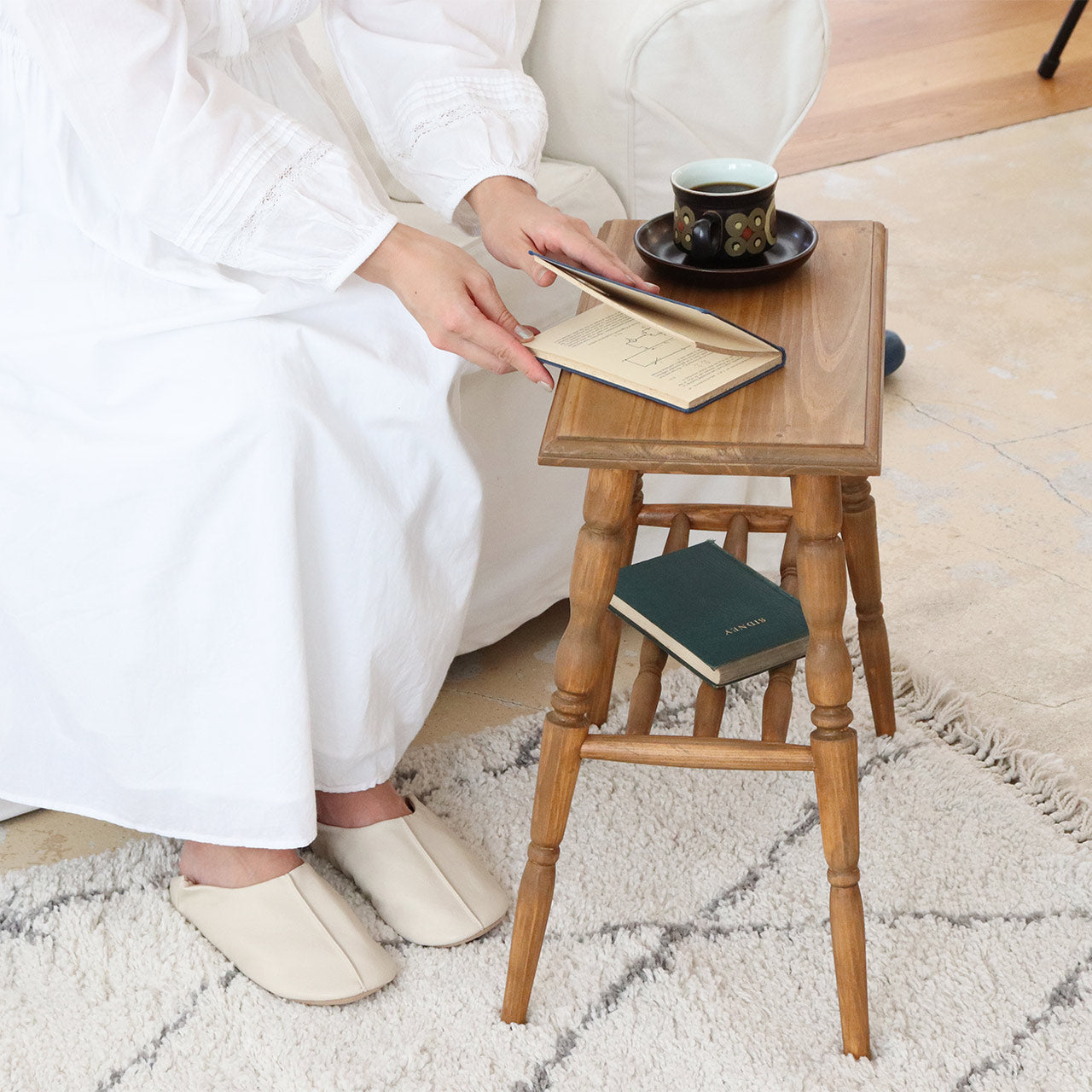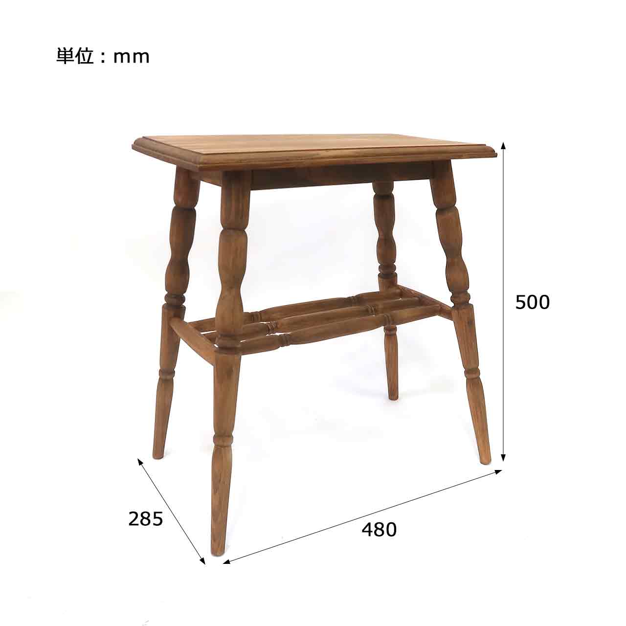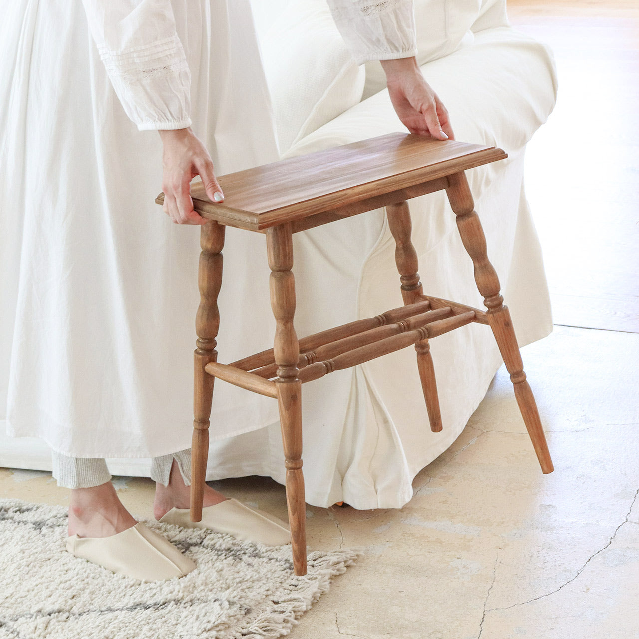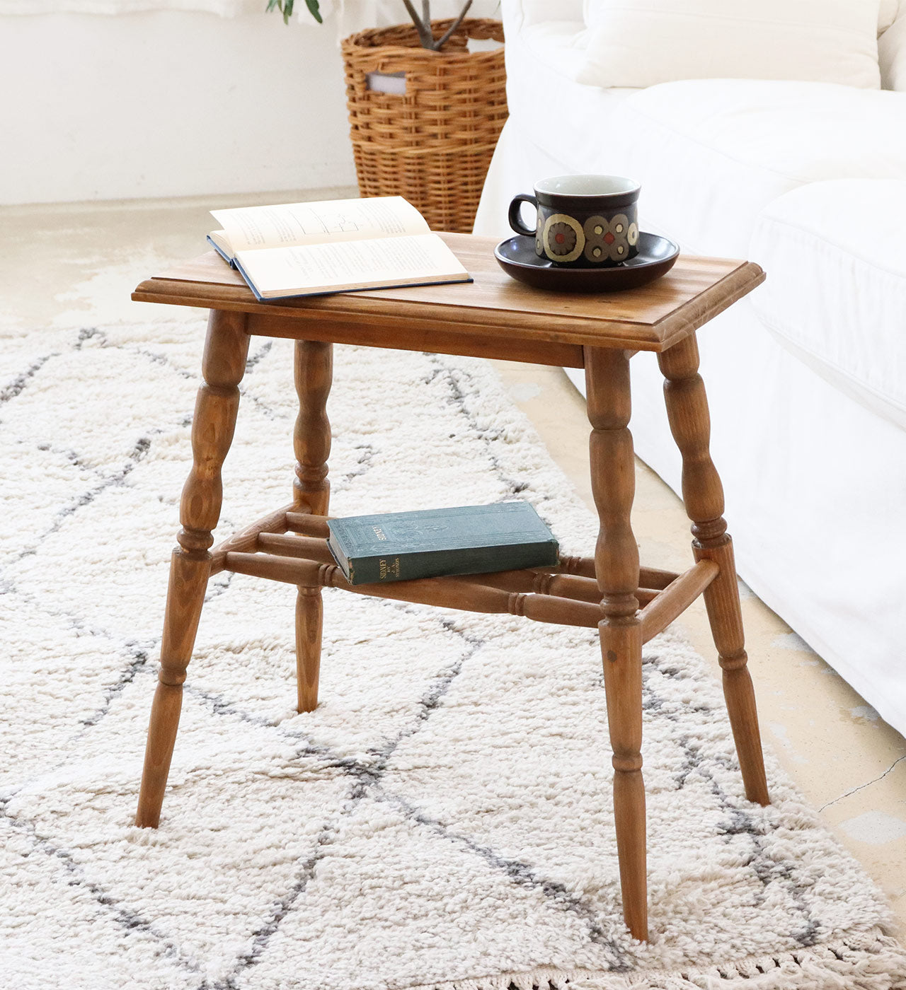 アンティークのような脚の装飾にこだわったサイドテーブル。 腰かけたまま使いやすいサイズ感。ソファサイドはもちろん、ベッドサイドや小物の飾り棚としてもつかえそうです。 天板下のスペースにはちょっとした物を置けるスペースがあります。読みかけの本やリモコンなど、天板に乗りきらない小物を置くのにぴったり。 軽いパイン材を使用しているので、女性でもさっと持ち上げて移動することができます◎ 木材の曲線を活かした天板や脚のデザインにこだわっています。手仕事を感じる細部も風合いの一部としてお楽しみください。 サイドテーブルの他に背の高いフラワースタンドもございます。