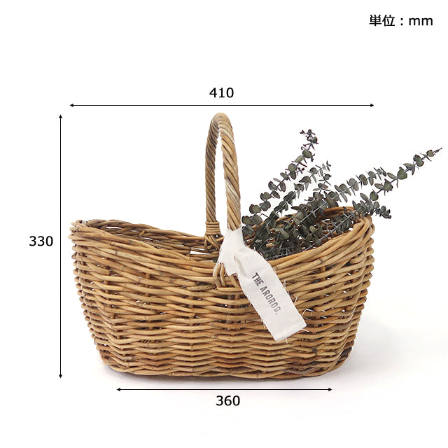 ヨーロッパの蚤の市でみつけたような風合いと優しい印象に感じる「THE AROROG」シリーズ。 すべて天然素材で作り上げたこだわりの逸品です。 皮つきラタンの味わいが大好きな方に是非おすすめのアイテムです。 ワンハンドル型でもちやすくピクニックに持っていきたくなるようなかたちです。 冷蔵庫やキャビネットの上にドライフラワーと入れて置いてあげるだけで、雰囲気のある空間になります。